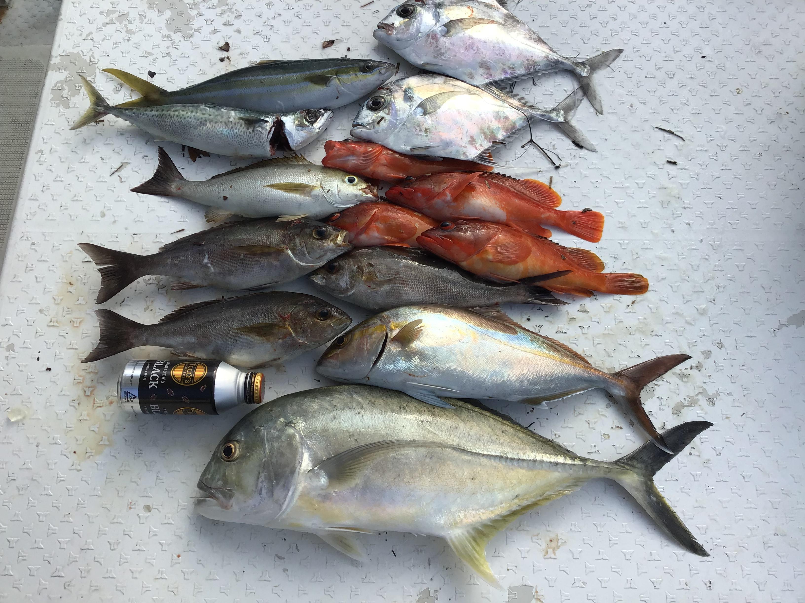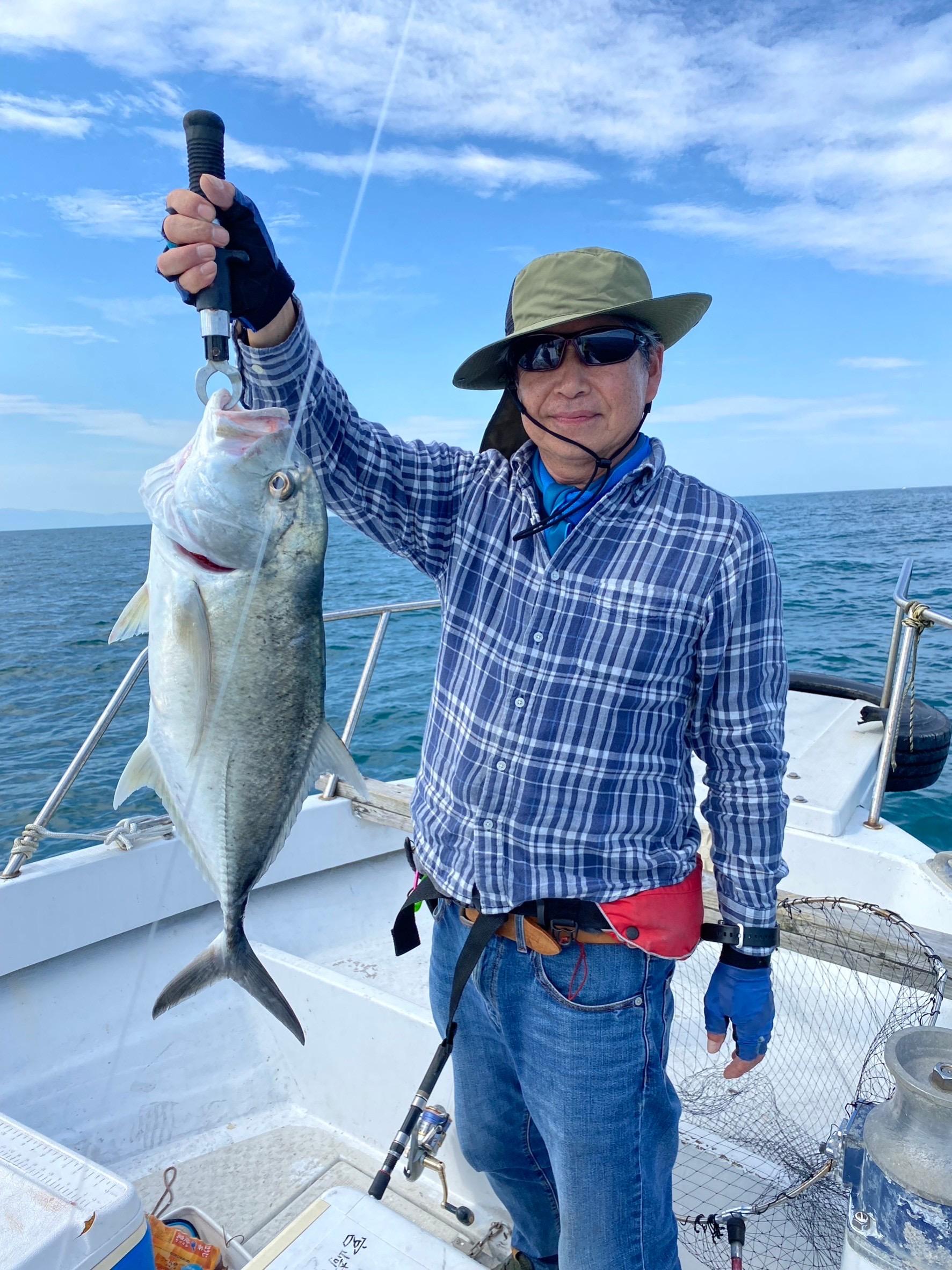 昨日はご予約がありましたが、台風2号の動きが分からなかったため早い時期に延期させていただきました。ただし、予想以上に早く抜けて行ったため、本船インストラクターお二人に乗船いただき、お魚リサーチに行ってきました。波はずいぶん落ちていて海は予想以上に穏やかでした。近場のポイントからリサーチを始めていきましたが、近場も沖のポイントも台風前のようなベイトの反応が見られない状況でした。昼前にたどり着いたポイントでようやく反応を捉え、そこで終日チャレンジしました。私はダイソーのシルバールアーとアシストフックで色々なアクションを試していましたが、いきなりガツンという当たり。その直後、再びガツンときたと思いきや一気に竿を引ったくられるような当たり。ドラグが機能を果たせないままラインブレイクとなりました。取返しのつかないこの一撃。この一瞬。やっぱり釣りは面白い!その後はアカハタやイサキをゲットしましたが、再び夕方間近。ダイソールアーを一気にひったくっていく当たり!午前中のドラグ調整の失敗から、緩めの設定に変えていましたが、今度は魚が止まらない!一気にラインを数メートル、数メートルと引き出され、魚の勢いを止める間も無く、再びラインブレイク!取り返すことのできないこの瞬間!心にポカンと穴が空いてしまったような思いをしながら、抵抗のなくなった仕掛けを回収すると、リーダーが数十センチに渡ってボロボロに!悔し〜い!やっぱ釣りは面白いわ! 時化明けで、あまり釣れないだろうと思われた釣行でしたが、インストラクターのお二人は次々にヒットさせ,3人での釣果は写真の通り。さすがです! ![]() ![]() |
