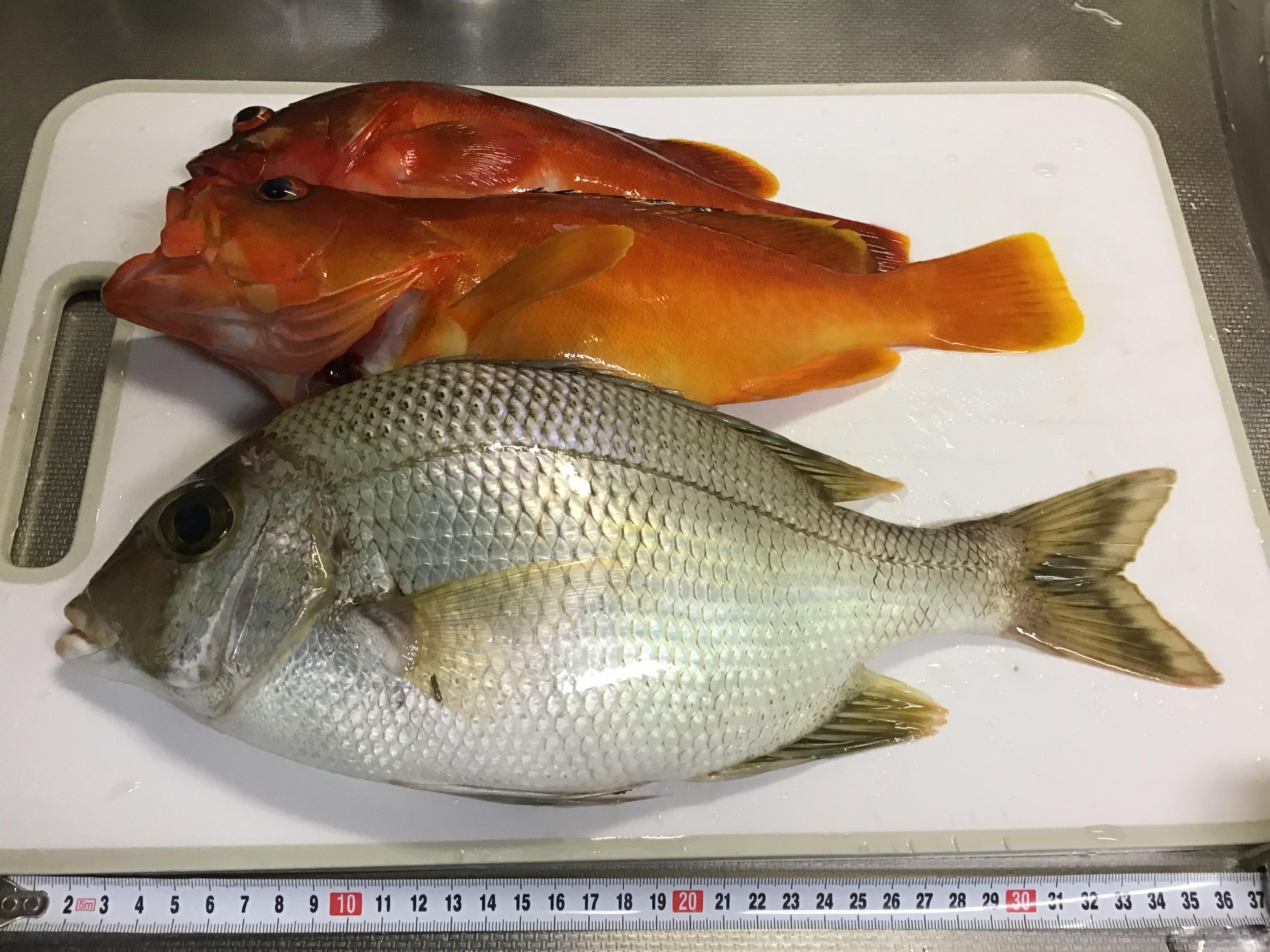 今日は、午前中から燃料を満タンにしたり、トイレ掃除をしたり、船首部分の塗装をしたりしていました。また、ラブマリーン号のロゴマークの上下に、ロッドやリールで愛用している「SHIMANO」さんや「DAIWA」さんのステッカーを貼る作業をしました。昼過ぎに予定の作業を終えたので、午後1時くらいから、お魚ウォッチングに出ました。近場の状況を見ながら、沖の瀬に向かうと、ちょうど瀬の上に潮目が出来ていて、ベイトの反応もまずまずでした。タイラバを落とすと着底直後にいきなりバイト。上がってきたのは、37センチのメイチダイでした。先日のブログで紹介した通り、とても美味しい魚なので「ラッキー」でした。また、同じ潮目でジグをキャストして底をとっていると、すぐにバイト。35センチ程のアカハタゲットとなりました。風波が出てきたのですが、浅瀬に移動すると、青物は出ませんでしたが、同じく小ぶりのアカハタをゲットして、帰港としました。実釣2時間程度でしたが、3日分の晩酌の肴をゲットすることができました。ベイトの反応も結構出ていて、なかなか「いい感じ」でした。シルバーウィークに向けて、楽しみです♪ ![]() |