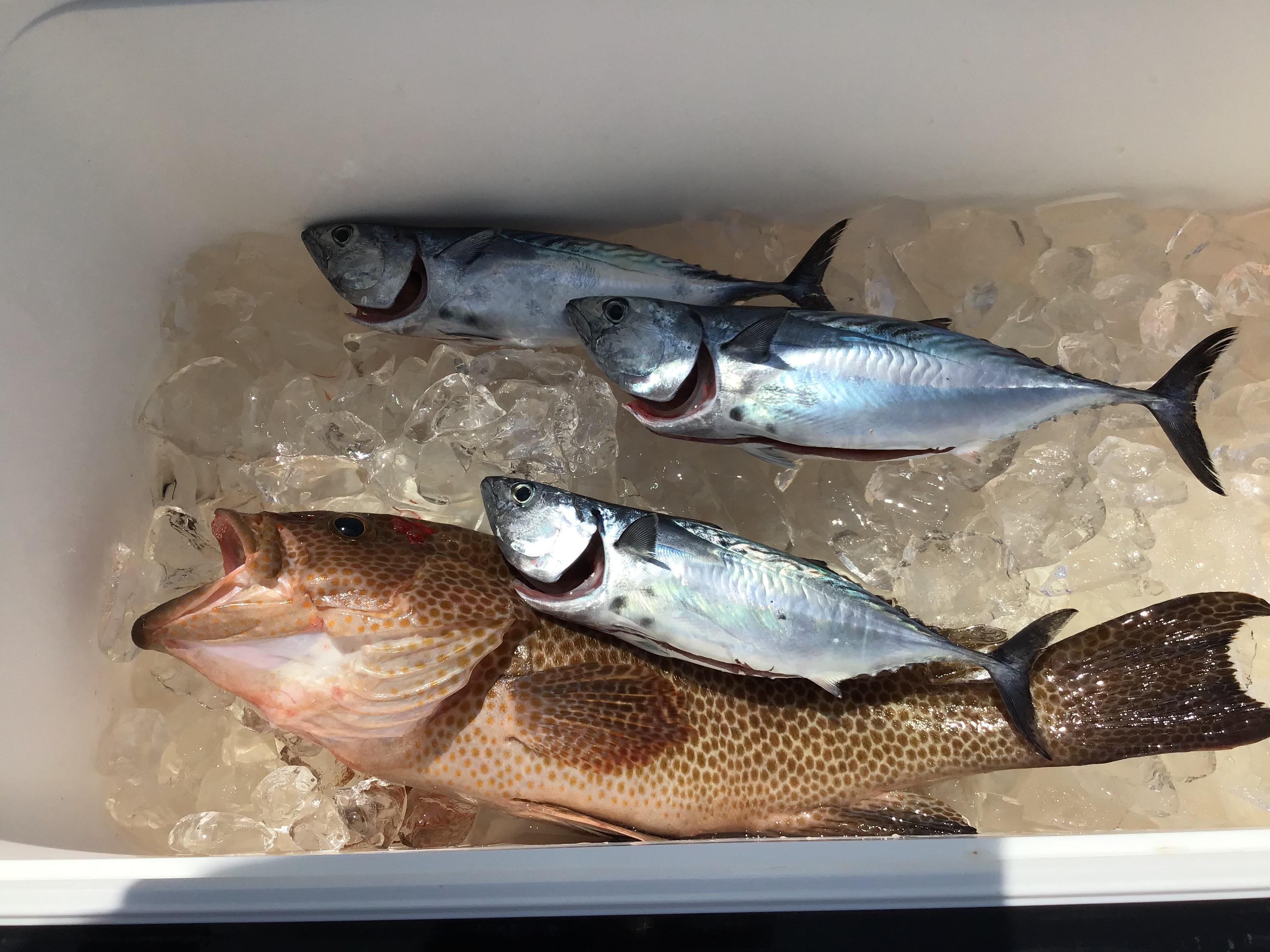 今日もお二人のお客様とキハダを狙いに行きました。途中、沖の浅瀬からスタートしました。水深8メートル地点で海中を覗くと、海底のテーブルサンゴなどがよく見え、美しい光景でした。しかしながら、見えている海底の景色が全く変わらない。同じテーブルサンゴなどがずっと見えている。潮が全く動いていないのです。早々に諦めて、沖のポイントを探っていきますが、真下に落ちていくジグが、また、真下から上がってくる。沖も潮が動いていない。ヤイトガツオの子が、時折、海面に群れで現れますが、いつものような、海中から飛び出してきて捕食するようなボイルではなく、「パシャパシャ!」と静かなボイル。沈んだ群れが海中に確認でき、コバルトブルーの中に群泳する姿は、やはり美しい光景でしたが、キハダやシイラがそれを追い回すような気配は感じられませんでした。こんな厳しい状況の中でしたが、写真のように45センチ越えのオオモンハタをゲット!海底付近でバイトがあり、一旦針バレした後、再度喰ってきたそうです。2度喰いでヒットさせた技の一枚でした。その他、オジサンとヤイトガツオの子を釣って(一部リリース)終了となりました。私もちょっとだけ竿を出して、ヤイトガツオの子を1匹釣って持ち帰りました。刺身でいただきましたが、モチモチとして旨味が強く、夫婦二人には十分でした。そういえば、先日釣ったメイチダイを干物にしていましたが、食べてみると、「激うま!」でした。ちょっと焼きすぎたのですが、噛めば噛むほど旨味が出る、スルメのような感じでした。25センチ程のアカハタの干物もできたので、食べるのが楽しみです♪ ![]() |