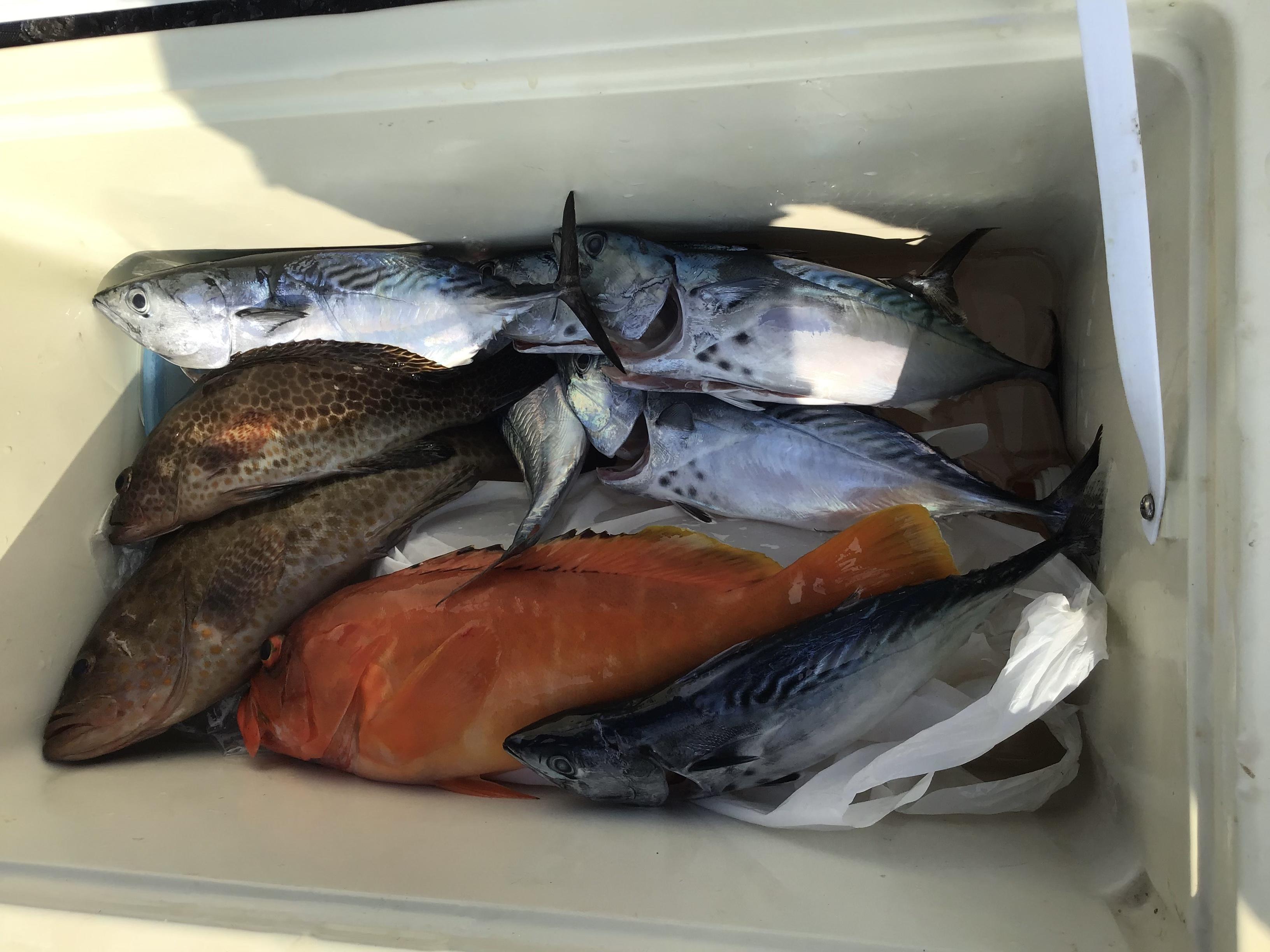 今日は、本船インストラクターお二人とお魚ウォッチングに行ってきました。昨日とは打って変わって、凪になっていました。手前から様子を見ながら沖の瀬の沖に行きました。ヤイトの子のナブラが至る所に湧いていて、ベイト反応もよく出ていました。するとインストラクターさんにいきなりのヒット。大物仕様のタックルですが、ロッドがのされ気味で、ラインが引きづり出されています。突っ走る魚を止めようと踏ん張っていると、絞り込まれていたロッドが一気に天を向きました。「バレた!」ジグはついていて回収してみると、何とフックが2本とも途中から折られていました。ジグには写真の通り歯形がくっきりと残されていました。その後、怒涛のヒット連発!しかしながら、なかなかやりとりに持ち込めない。3人で「あっ」とか「やられた!」の連発。「ガッ!」と来て「ス〜」という状況です。ジグの前にワイヤーをセットしたのですが、ワイヤーの接続部分や途中から切られる状況が続きました。船の下に見えていたのはメーターオーバーのオキザワラ!何と食いちぎられていったジグは高級ルアーから100均ルアーまで、3人で15個を超えていました。最初は高級ルアーを使っていましたが、徐々に100均ルアーにスライド。ジグがなんぼあっても足りない状況です。「釣りたい」けど「高級ルアーのロスは痛い!」という「恐怖のジギング状態」になりました。結局1本も仕留めることができず、ヤイトの子だけをクーラーに収めて、ポイント離脱となりました。その後,堅調な沖の瀬に行き、40センチ程の型の良いアカハタやオオモンハタ、ヤイトの子を追加して終了となりました。 ![]() ![]() |