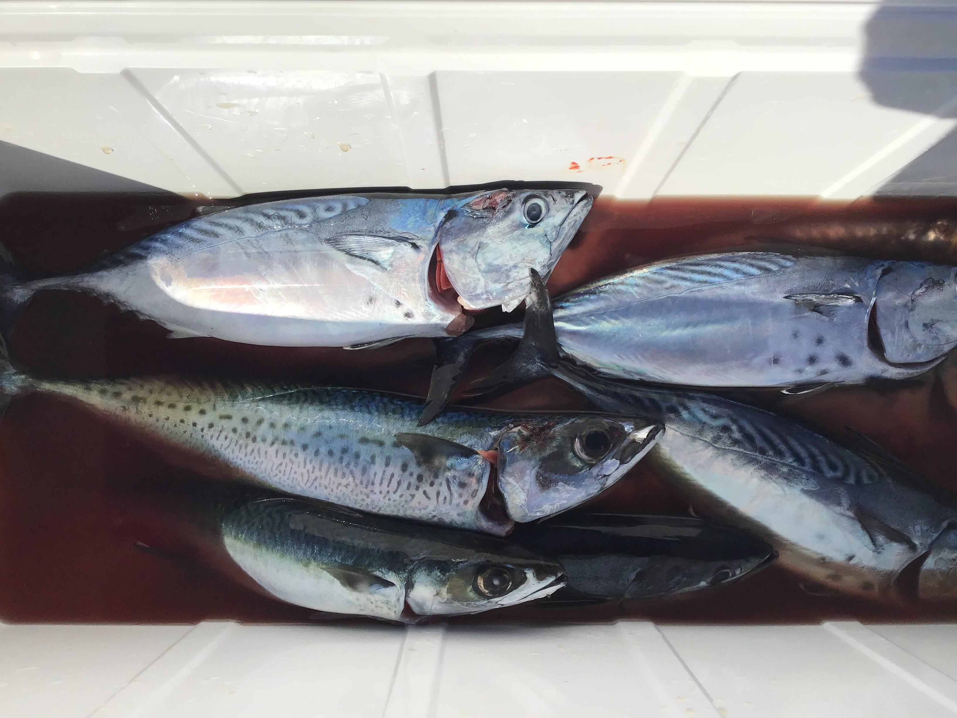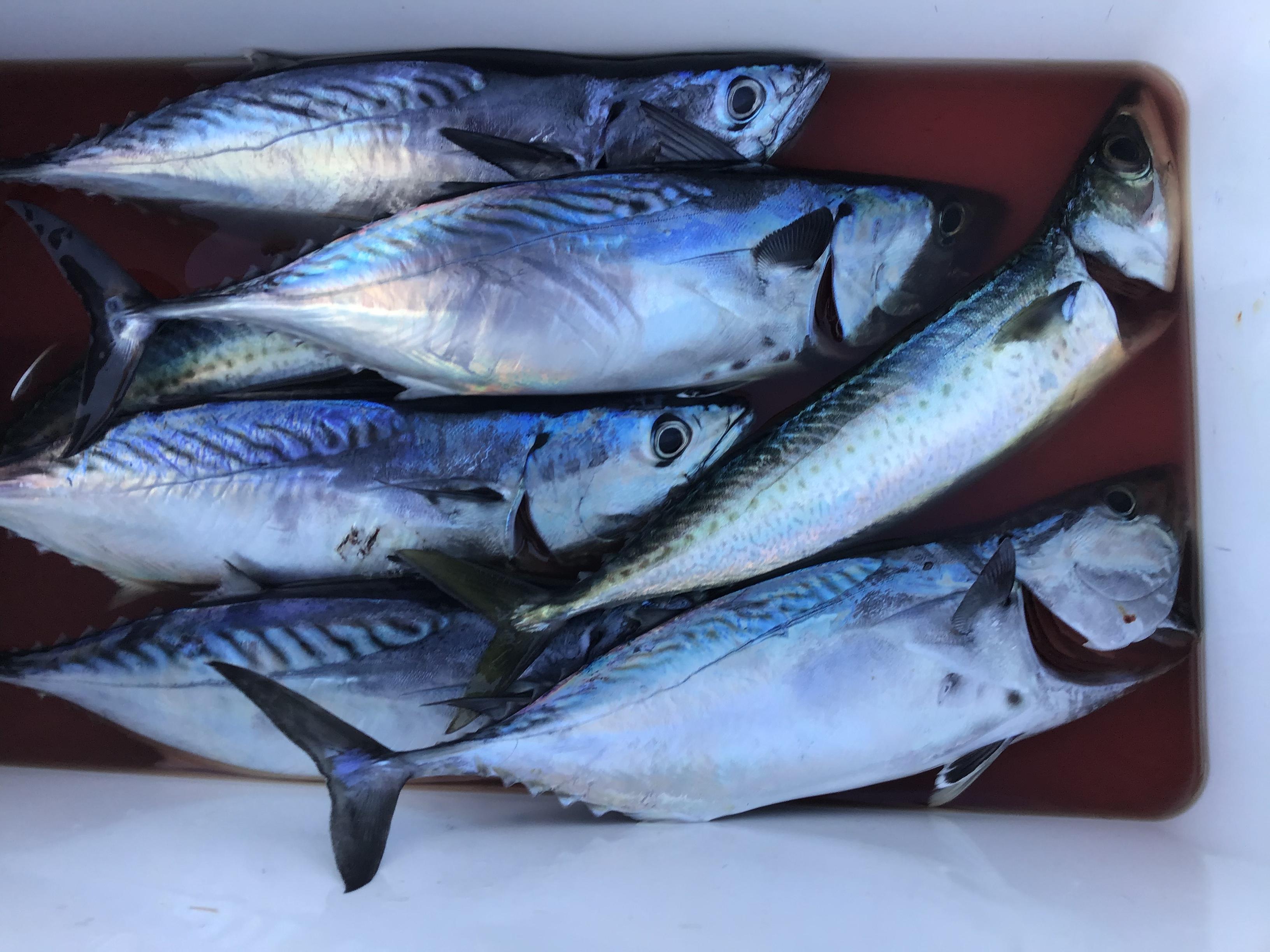 今日はお一人様チャーター状態での午前ハーフの釣行でした。私も竿を出して2人でジギングを楽しみました。久々に沖のおき〜に出てみるとベイトの激アツ反応の連続。船の周辺ではヤイトや大鯖のボイルが次々に現れる状態でした。流れも緩やかになり、水深が60メートルあるにもかかわらず40グラムのジグで底が取れるようになりました。継続してヤイトの子や鯖が食ってきましたが、それに混ざってヨコワ(クロマグロの幼魚。採捕禁止のため即リリース)の40センチ級と60センチ級がヒット。さらに得体の知れないデカバンがそれぞれ数回ずつヒットしますが、全てバラシ。私にヒットしたのは水深15メートル。ちょっと型のいいのが来たぞと思っていたら、突然海中に向けて猛ダッシュ。スプールが逆転しながら20メートル、30メートルと引き出されていきました。そこで、痛恨のラインブレイク。引き上げてみると7号のリーダーが裂けるようにちぎられていました。お客様もデカバンにやられ、ラインブレイクを繰り返すことになりました。風も波も穏やかで、「心休まることなく」、ワクワクドキドキの至福の時間を過ごしてきました! ![]() ![]() |