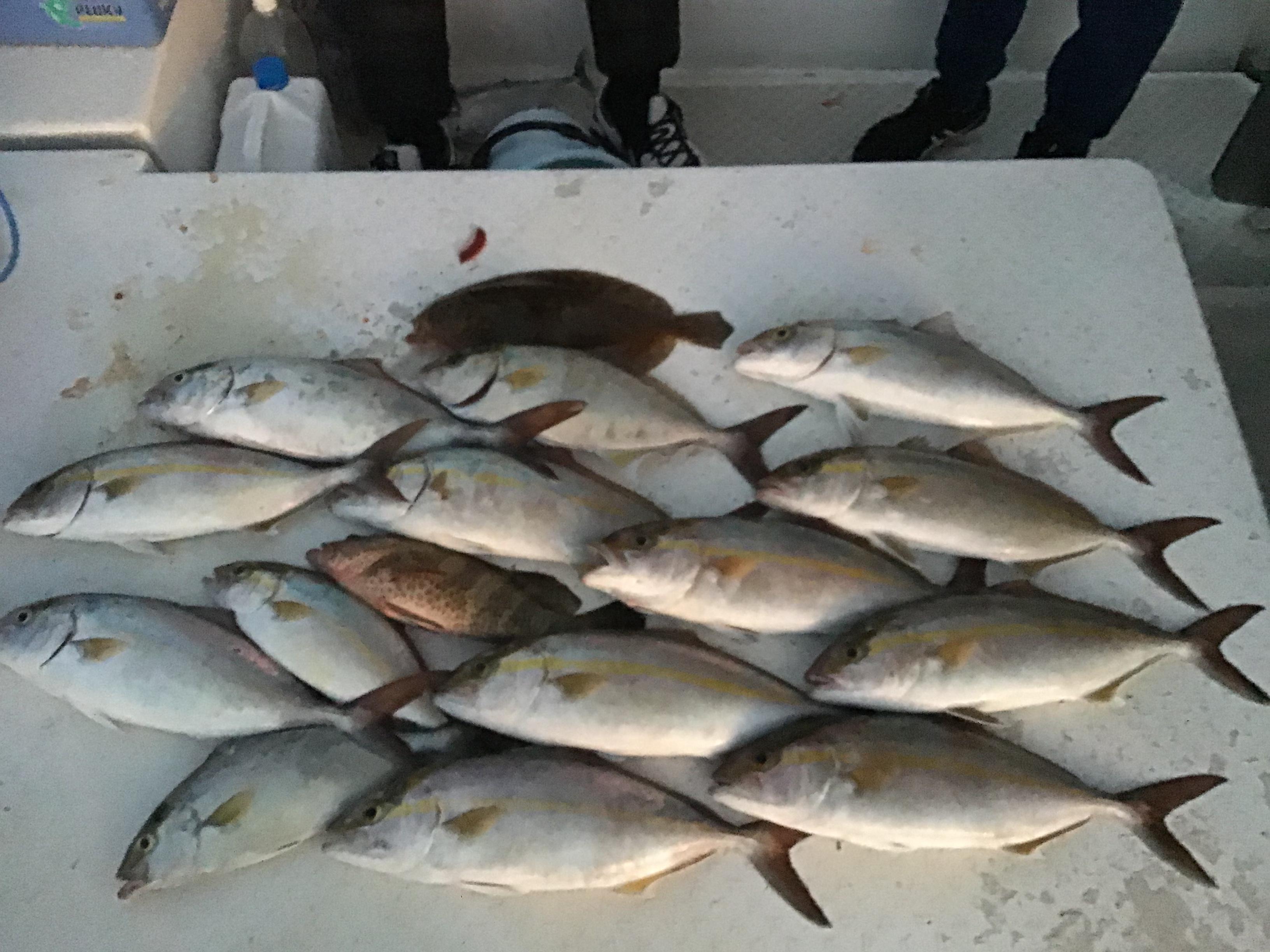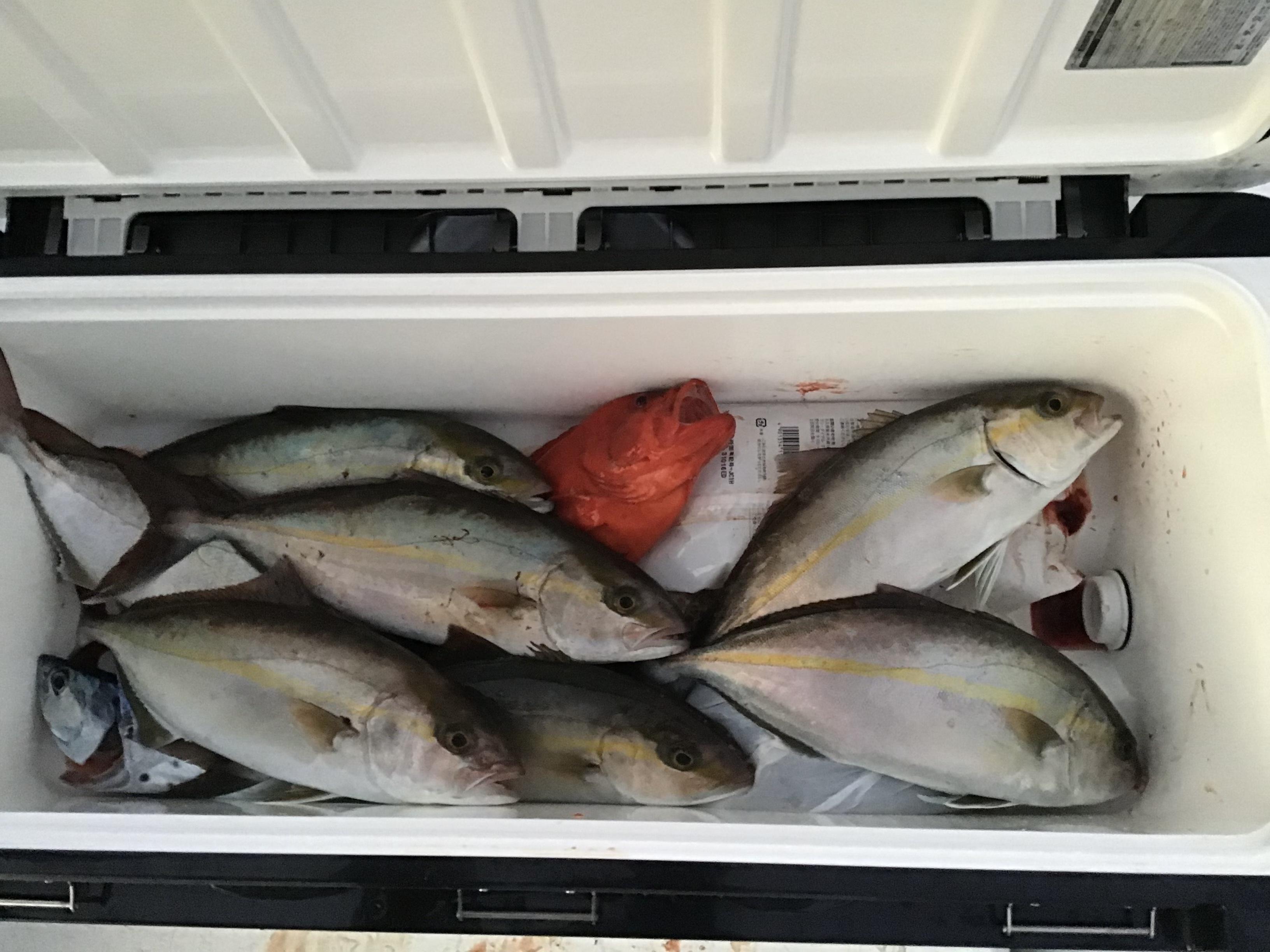 午前中は強風予報のため、昼前からの出船でした。それぞれのポイントで、ベイトの好反応が次々に出るものの、全然食ってこない。後半まで、オオモンハタ2匹、ヤイトガツオ2匹、ネリゴ2匹、子供さんが釣られたガンゾウヒラメ1匹とさびしい釣果。これはまずいぞ!と思っていましたが、最後にネリゴ、カンパチラッシュのポイントへ。当たりました。ネリゴ独特の竿先を海中に引きづり込む当たり。そこから、ラッシュが始まりました。40センチから50センチ程のネリゴを、お一人は12連チャン、もうお一人も7連チャンと船上が一気に盛り上がりました!40センチ程のアザハタなども追加し、終了となりました!あ〜、良かった‼️ ![]() ![]() |