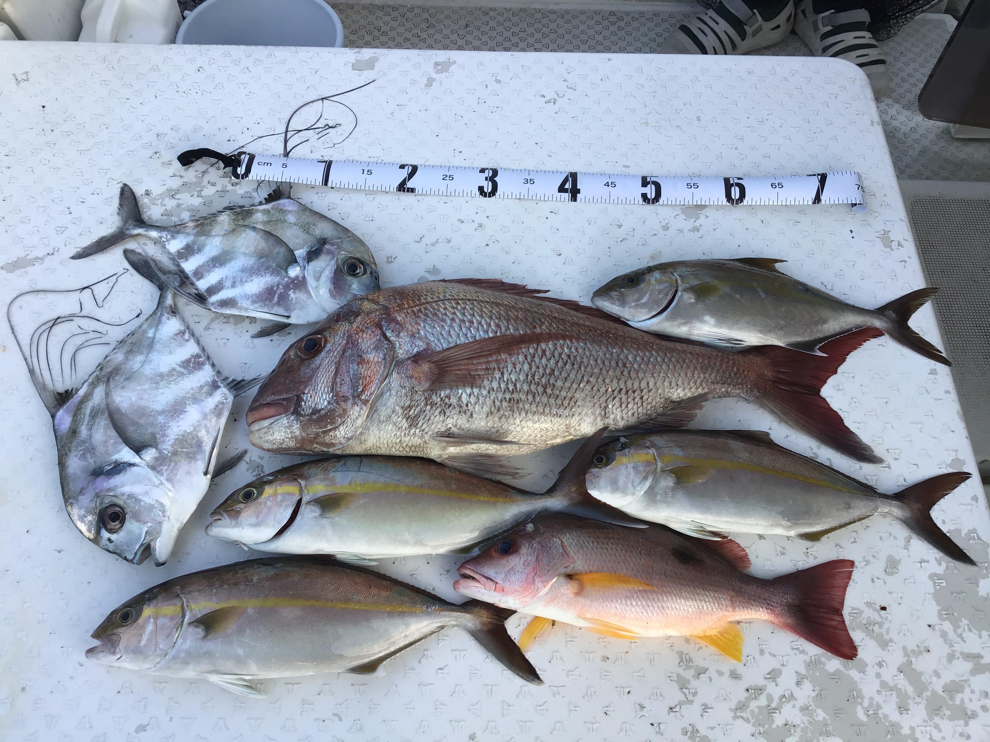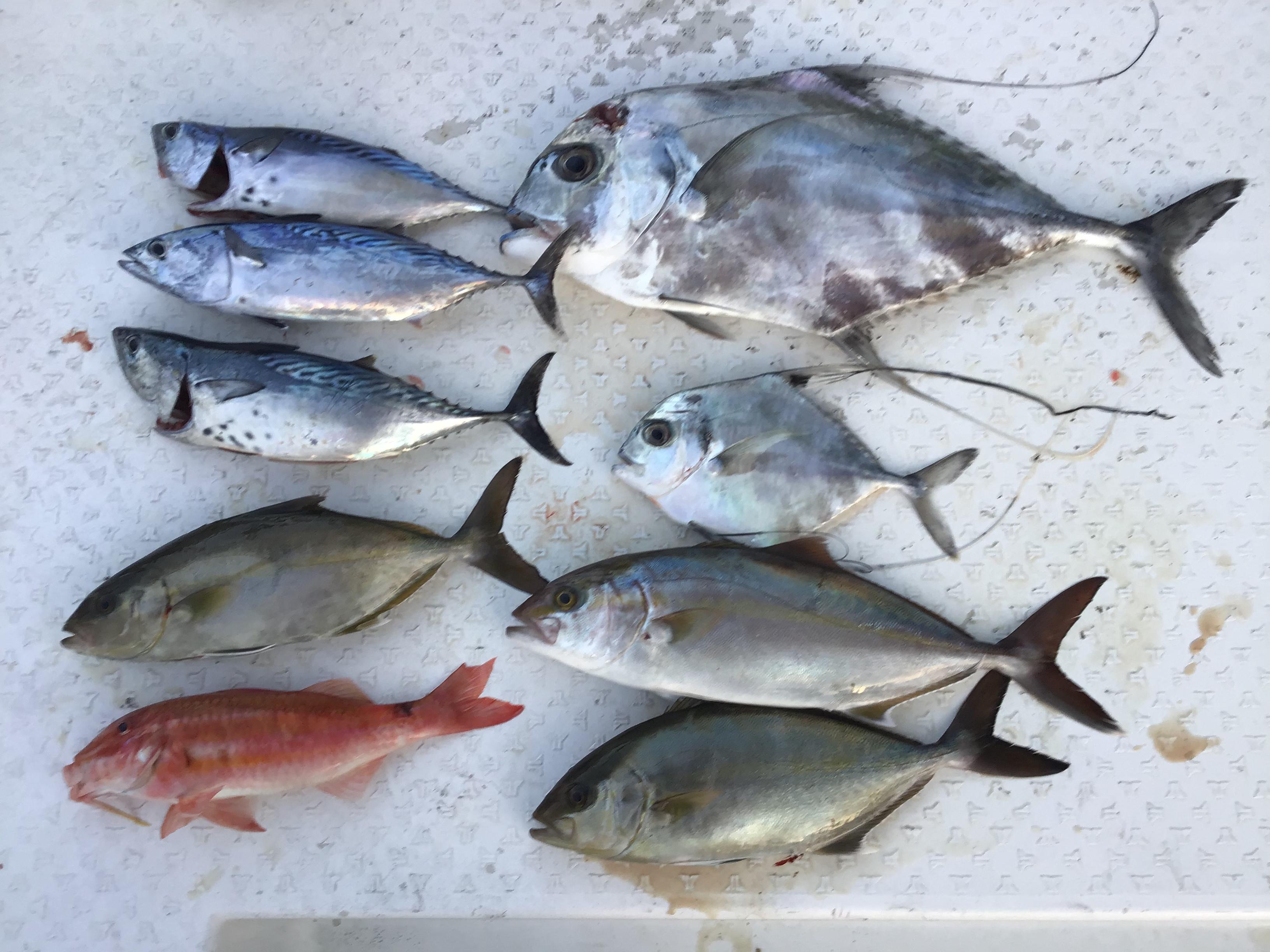 まずは一昨日から。本船のインストラクターさんと2人でティップランのポイント探しに行ってきました。ポイント探しと言っても、いつものポイントを次々に回り、ティップラン、ジギング、タイラバを試して回っただけです。結果は、イカの当たりなし。タイラバ、ジギングも退屈した頃に当たりがある程度で、あまり芳しくない結果(1枚目の写真:二人分)でした。 昨日は、あまり行かないポイントから探ってみると、お客様が、久々にお目にかかる73センチの見事なマダイをゲット。ヒット当初は竿先を海中に引きづり込む引きで、型の良いカンパチかと思いましたが、いつまでもは、突っ込まない。しばらくして海中に見えてきた魚体はピンク色。しかも、でかい!上がってきたのは、ピンク色の濃い、見事な美しいマダイでした。その後は、美味しそうなクロホシフエダイ、イトヒキアジやヤイトガツオなど。 それから午後ハーフのお客様を迎えに行った後、いつものポイントへ。やはり渋い。しかも西の弱風予報に反して北風。ところが、風波は反対の南から結構でかいのがきているという不思議な状況でした。おそらく沖で南の強風が吹き、波だけが届いていたのではないかと思いましたが、その後、南の強風が吹いてきました。避難すべきか判断が難しいほどの風波でしたが、南の強風なのに、今度は風波はやや穏やかに!ここでベイトの激アツ反応が出て、何とかネリゴを2枚ずつゲットして、終了となりました。(2枚目の写真:ほぼ二人分) ![]() ![]() |