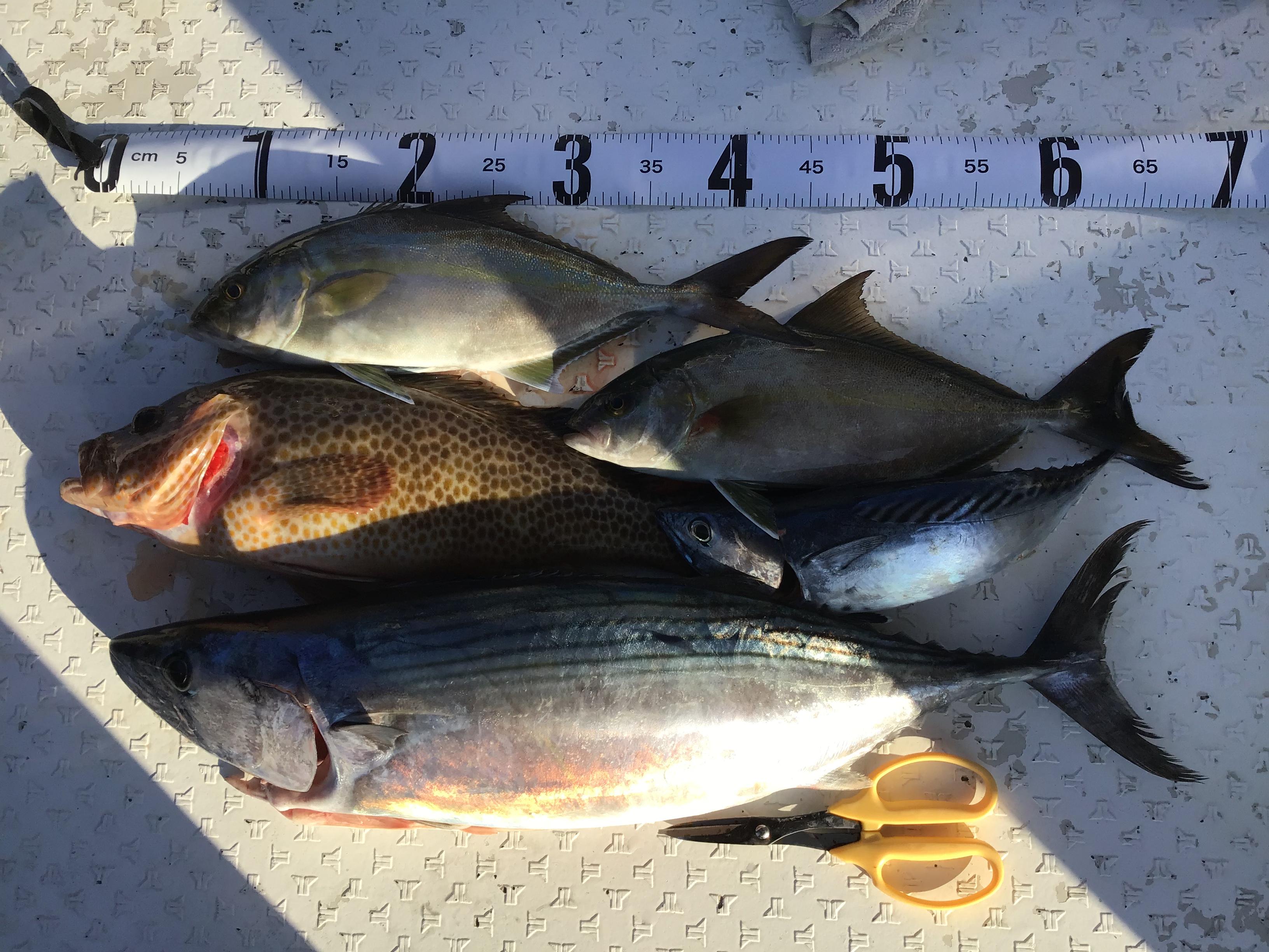 今日はお一人のご予約をいただきましたが、西北西の風4メートルの予報が出ていたため、「沖は無理、手前は釣れていないので別の機会をお勧めします」とお話ししましたが、それでも構わないということで出船しました。予報通り風波があり、手前のポイントに行きましたが、当たりなし。しばらく頑張っていると風が少し緩んできたので沖に出ることにしました。すると、タイラバに重量感のある魚がヒット。根魚のデカ版だと思いましたが、上がってきたのは本船のランカークラス、46センチのオオモンハタ。さらにジギングでヤイトガツオ。その後もヤイトガツオらしき青物がヒットしましたが、やり取りの途中から急激に重量感のある強い引きが!竿先が海中に引き込まれそうになり、ヤイトではない!と思ったら、上がってきたのは62センチの丸々とした見事なハガツオでした。その後、ネリゴ2匹を追加し、終了となりました。ラッシュこそありませんでしたが、帰り際に「十分満喫することができました!」おっしゃっていただき、出船して正解だったかなと思いました! ![]() |