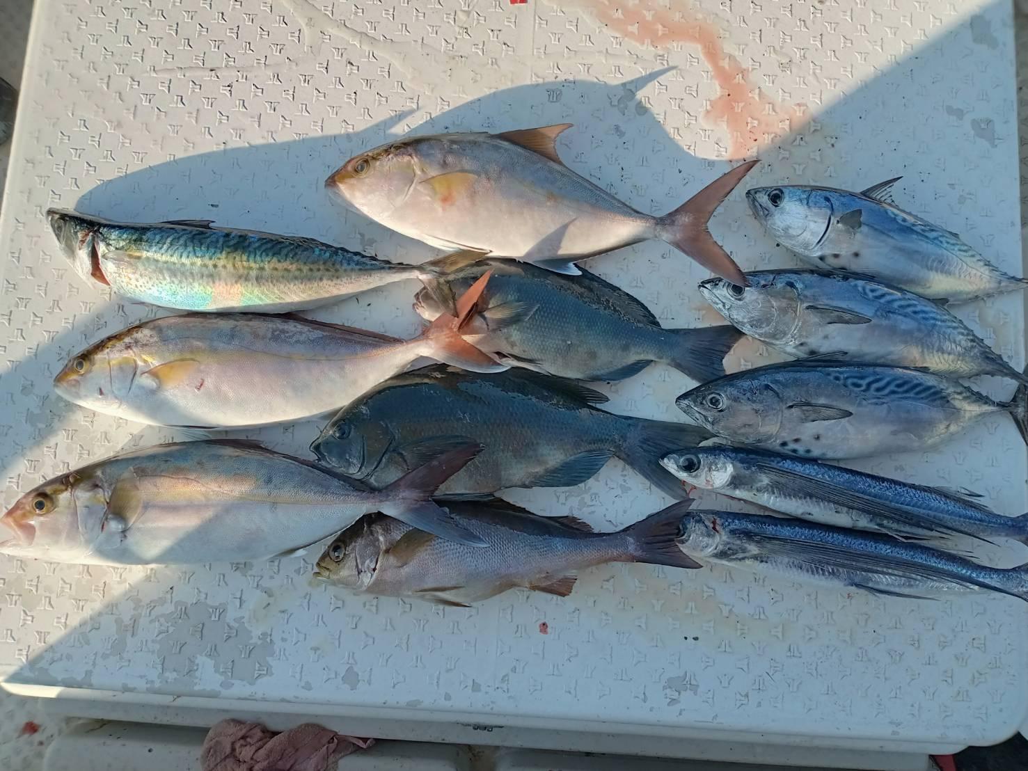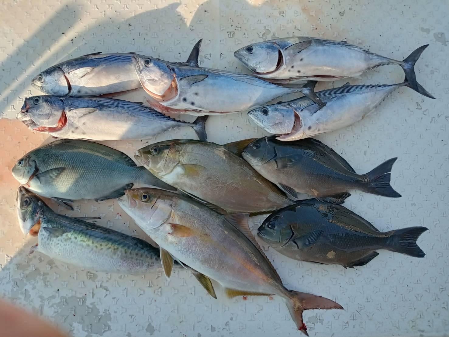 昨日は、常連様の「フカセ釣りに挑戦したい」というご要望を受け、2名様で沖の瀬に行ってきました。フカセの前にジギングもやりたいということで、1時間半程度ジギングを楽しみました。ハリバレが数回ありましたが、合わせて5枚のネリゴをゲット。その後フカセのポイントに。開始早々、40センチ弱のグレとイサキがきましたが、その後は、ヤイトガツオ連発。潮も早めでしたが、グレのタナに届く前にヤイトに喰われるという状況でした。ヤイトの他にも50センチ程の大サバ、良型トビウオ、小柄なダツと次々に竿が曲がる楽しい釣りとなりました。 予報が当たり、午後から南の強風が吹き始め、早めに沖の瀬を離脱。途中、南からの横波がかなり太っていて、左斜めに1キロほど走行後、今度は右斜めに1キロほど走行するというジグザク走行を繰り返して青島沖まで戻りました。そのポイントも潮が早く、100メートル近く仕掛けを入れると、30センチ程のオナガグレが喰ってくるという状況でした。ここでも連発となり、フカセ釣りを堪能されて終了となりました。 本日より船を陸揚げし、メンテナンス作業に入りますので、しばらくお休みさせていただきます。よろしくお願いいたします! ![]() ![]() |
