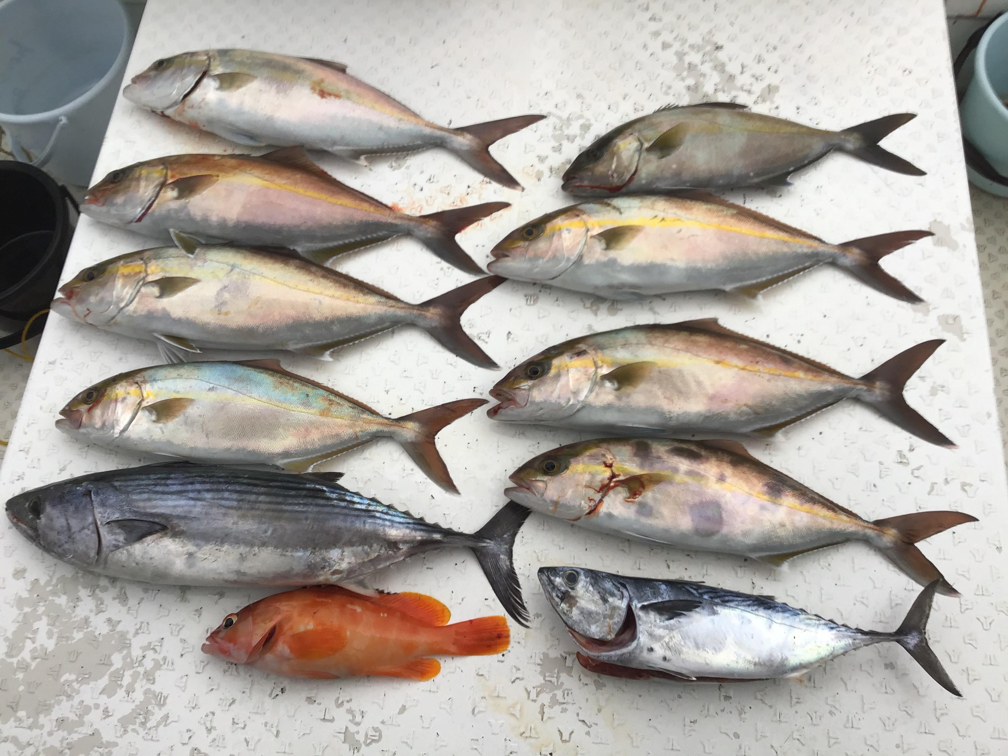 昨日は朝のうち沖のポイントへ。ベイトの反応はぼちぼち出るものの、当たりがありませんでした。3名様での釣行で、結局、ネリゴらしい当たりのバラシ、イラ、ヤイト、オオモンハタという結果。10時過ぎには予報通り風が強くなり近場に避難。当たりもなく午前中終了となりました。午後は、フルのお客様に「心は折れていませんか?」と尋ねると「リベンジに燃えています!」というお答え。お二人と再び沖のポイントへ向かいました。前半はほとんど当たりがありませんでしたが、後半から60センチ程のハガツオや50センチオーバーのネリゴなど、終了間際までバタバタと釣れて、写真のような釣果(お二人分)となりました。諦めることなくしゃくり続けたお客様の粘り勝ち。「リベンジ成功!」でした。 ![]() |