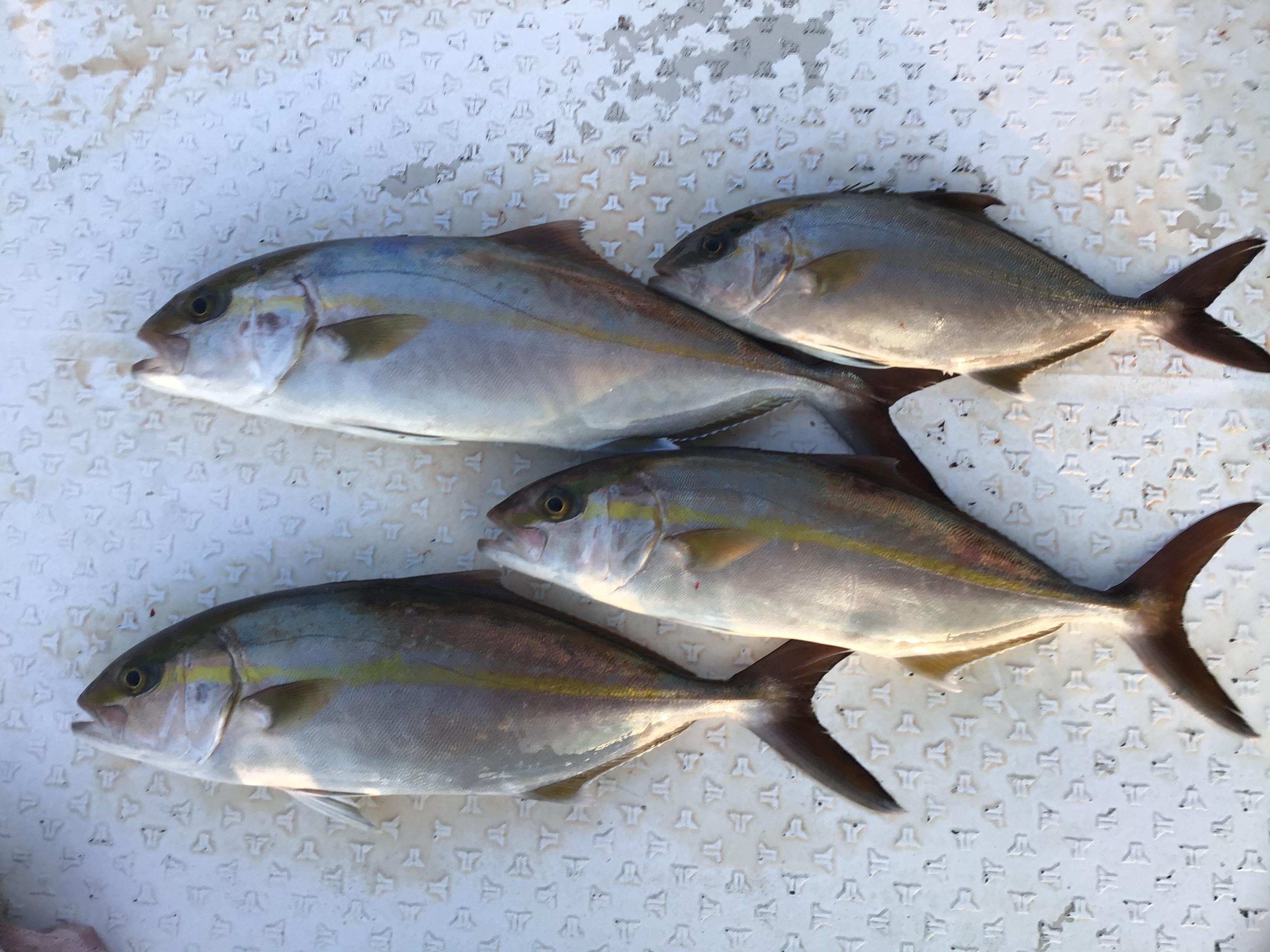 昨日は午後からお二人での釣行でした。風波が心配でしたが、沖のポイントは穏やかで、陽光が降り注ぐ、絶好の釣り日和という感じでした。あとは魚が釣れてくれれば、言うことなしと談笑しながらの釣りになりました。ベイト反応はそこそこ出ますが、やはり渋め。まずは、良い型のウッカリカサゴ。2時ごろに待望の40センチオーバーのネリゴがヒット。その後、初タイラバで、エソ、小ぶりのネリゴ。ジギングでは、アカヤガラがヒットしたあと、お二人に50センチ前後のネリゴが喰ってきました。ラインを巻き取っては引き出され、また巻いては引き出されるというネリゴ独特の引きを堪能されていました。ラッシュとはなりませんでしたが、それぞれお土産をしっかりと確保され、満足の釣行となったようでした。帰港して、生簀のネリゴを並べてみると、全体がうっすらとピンクに覆われていて、鮮やかな黄色いラインが入っている、何とも美しい姿。思わず見入ってしまいました! ![]() |