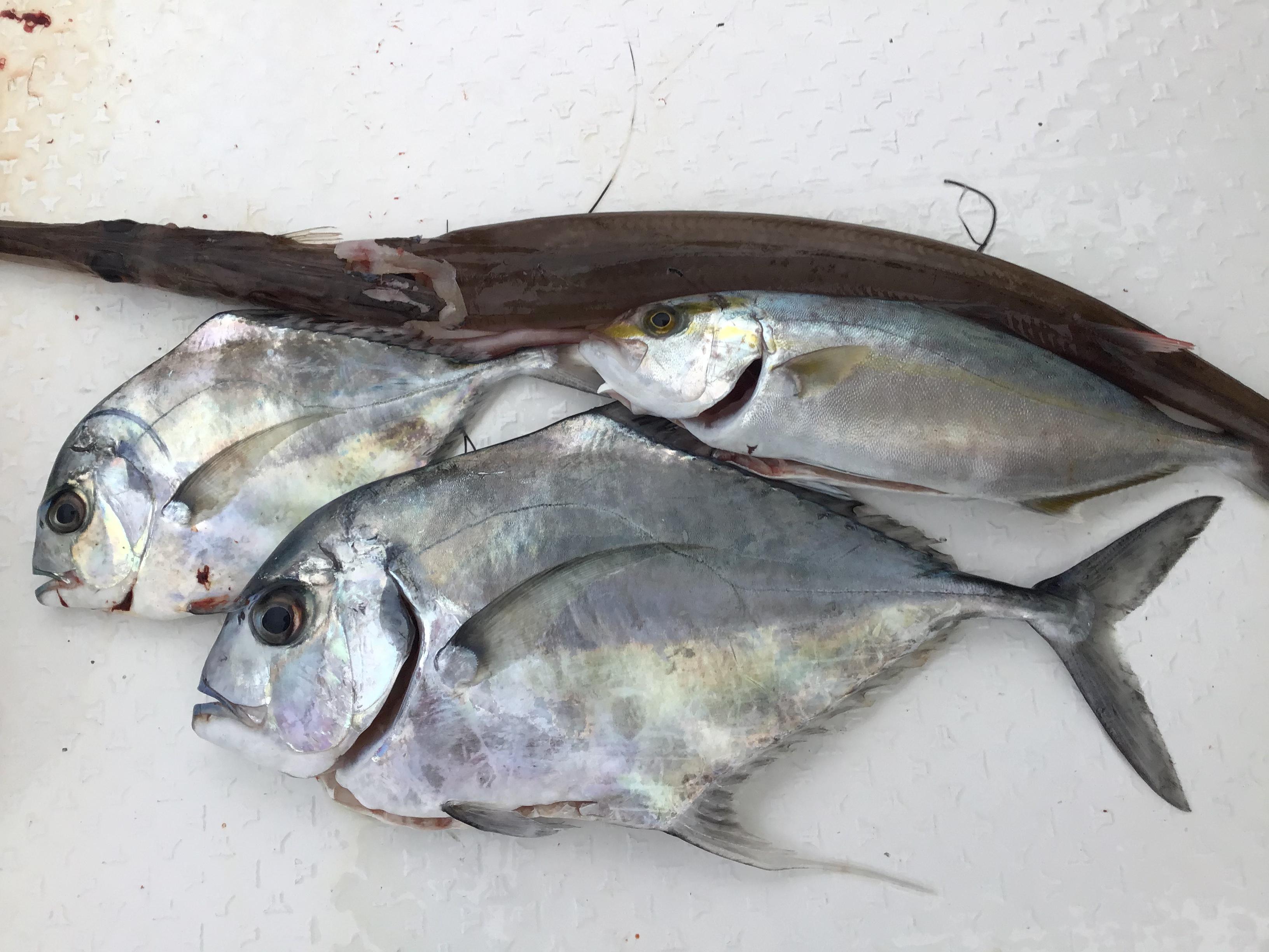 昨日は午後ハーフ、東京からの親子お二人での釣行でした。南の風3メートルの予報で少し心配しましたが、出船してみると天気は良いし、ベタ凪で爽快感のある状況でした。一気に沖の沖のポイントにいくと、早速ベイトの好反応が続きました。すると息子さんに竿先を絞り込む当たりがきましたが、やや横に走る引き。道糸がPEの0、8号なので無理はできません。ドラグをうまく効かせて、見えてきたのは40センチ程のイトヒキアジでした。今度はお父さんに当たり。竿先を海中へ海中へと絞り込んでいきます。この引きは間違いなくネリゴ!途中から息子さんにバトンタッチをして取り込んだのは、45センチ程のネリゴでした。その後、60センチオーバーのイトヒキアジやメーターオーバーのアカヤガラなどを追加されて、終了となりました。小ぶりなイトヒキアジはリリースされましたが、短時間で引き味を楽しまれ、写真の釣果となりました。 ![]() |
