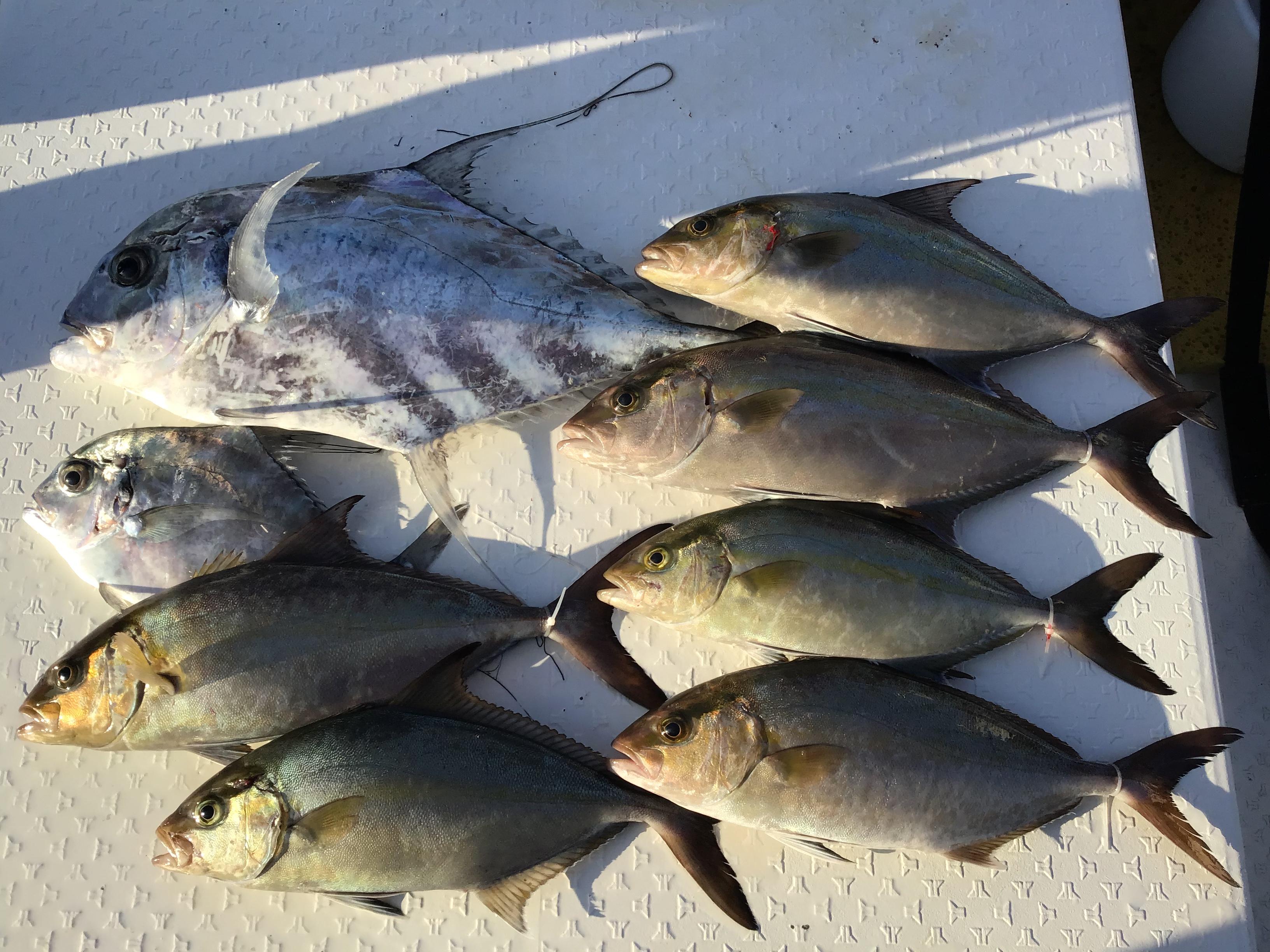 昨日の午前ハーフではビギナーお二人を含む4名様での釣行でした。風波があり、沖に出れず近場での我慢の釣り。最近には珍しくベイトの反応が出ていたので、もしやと思いましたが、実際は非常に厳しい状況でした。そんな中、レンタルタックルのビギナーの方にタイラバでの当たり。結構竿先を絞り込んでいきます。マダイを釣りたいと言われていたので、ひょっとして良型のマダイ?と思いましたが、長いやり取りの末、上がってきたのは、何と50センチ程の本カンパチでした。その後、もうお一人が30センチ程のホウボウ。久々に見ましたが、どちらも大変美しい魚(写真は撮り忘れていました)でした。 午後からは風が収まりましたので、3名様を乗せて沖のポイントへ直行。ベイトの激アツ反応が続くものの、活性が今ひとつという感じでした。忘れた頃に当たりが2、3発出るという状況で、それぞれ45センチから50センチ程のネリゴ、ヒレナガカンパチ、40センチから60センチオーバーのイトヒキアジを釣り上げていかれました。針バレも多く、釣果としては写真の通り(3名様分)となりました。沖に出れると何とかなるのですが、やはり近場は相変わらず厳しい状況でした。午後から風が収まるパターンが圧倒的に多いようです。 ![]() |