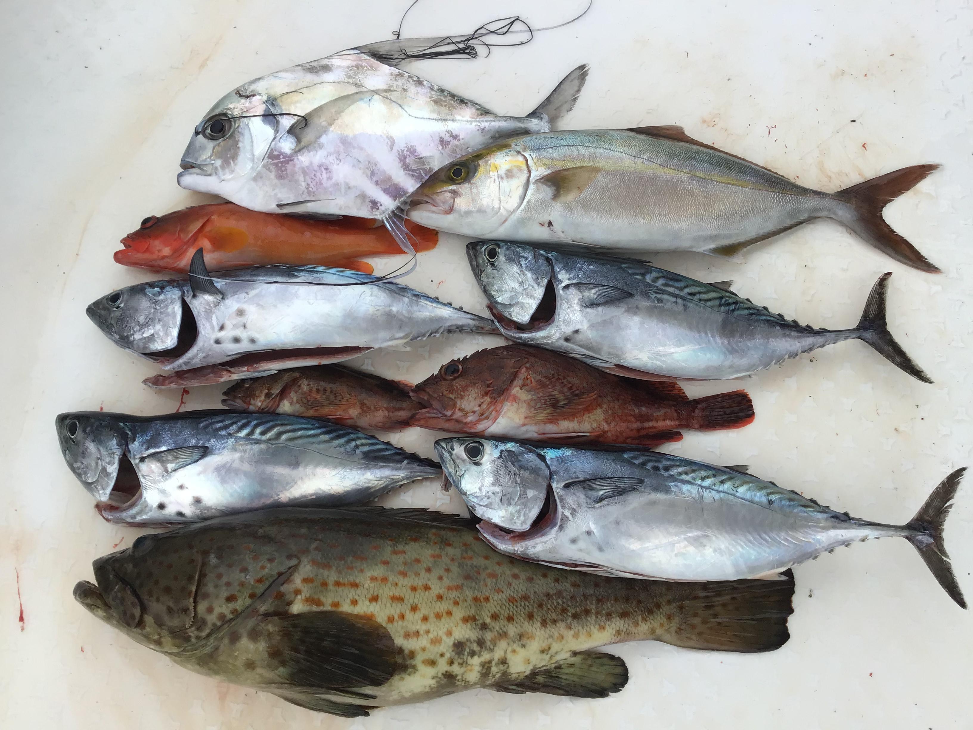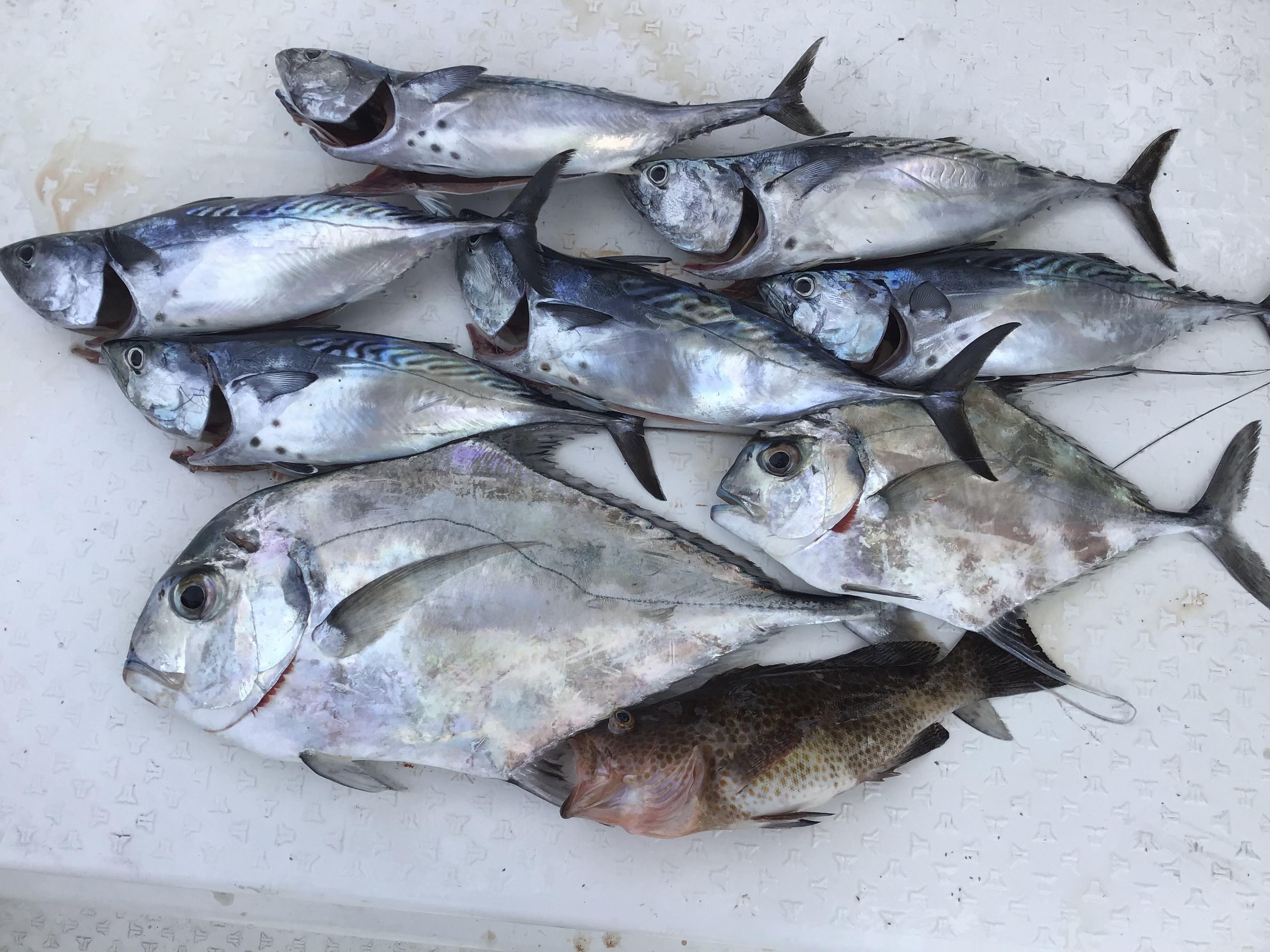 昨日は風波を警戒して手前スタート。するといきなりネリゴがヒット。いつ見ても良い引きをしますね〜❣️ベイトの反応も出ていましたが、他の船が先に来られていたので、即ポイント離脱。風波がどうかなと思いながら沖のポイントへ。魚探の反応は今ひとつでしたが、ステルスの丸々として美味そうなヤイトガツオやイトヒキアジがパラパラと喰ってきました。午前ハーフのお客様お二人はここで終了。写真上の釣果でした。午後からはフルのお客様お一人と別のポイントへ。ここではタイラバを楽しみましたが、アラカブやアカハタの当たり。更には、竿先を絞り込む強い引き。最後までよく引いたので青物か真鯛かと思いましたが、見えてきたのは茶色の大物。ごっつい顔の迫力ある高級魚チャイロマルハタでした。計測すると55センチ。良いサイズでした。ここで予報通り南からの強風となり、早めの納竿となりました。終わってみれば、結構な釣果となりました♪ ![]() ![]() |