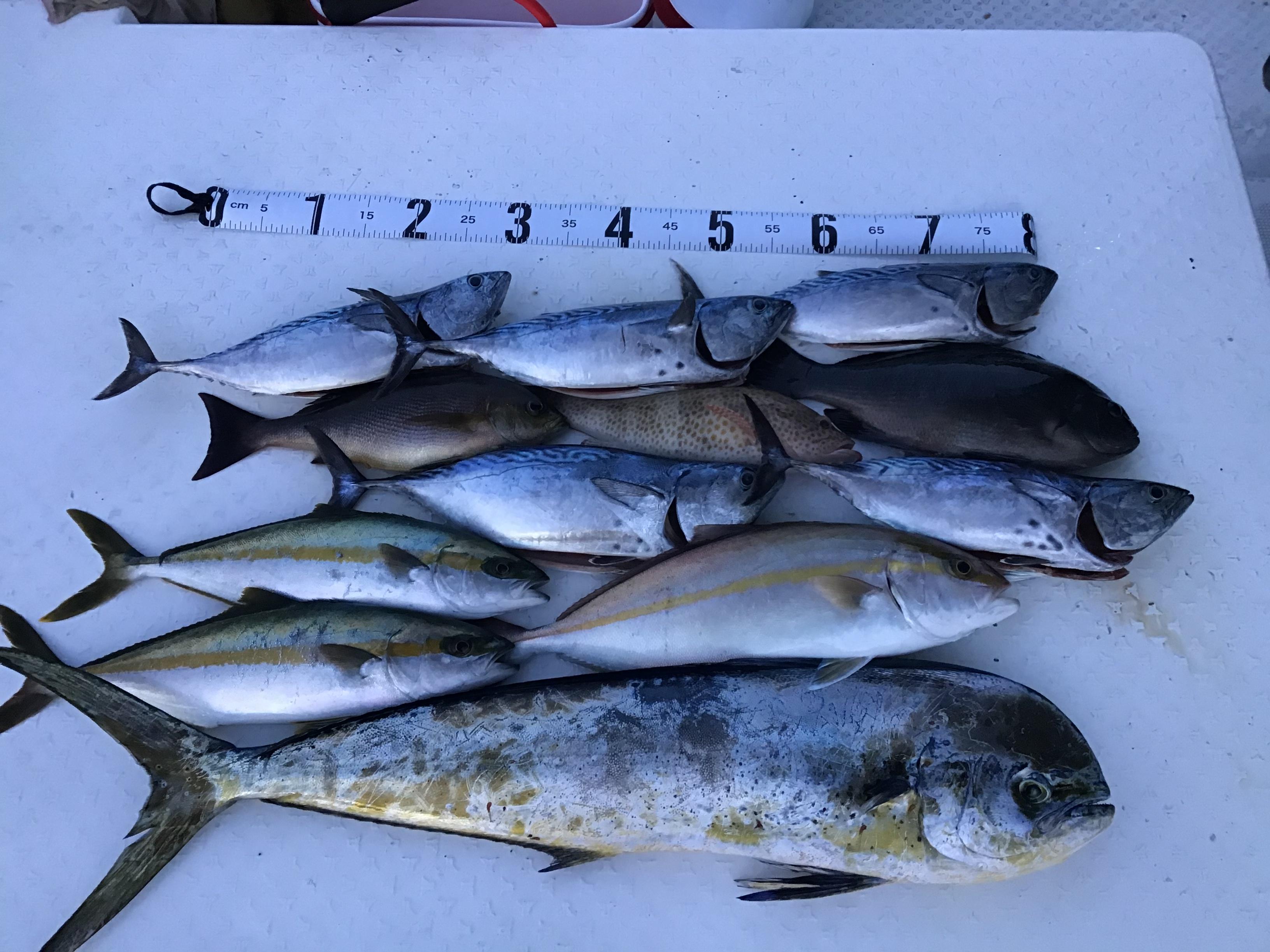 昨日は、シマノジャパンカップ磯釣り選手権米水津会場に参加予定でしたが、先日の地震のため延期になりました。ゴルフに行くかバイクでツーリングに行くか迷った挙句、真面目に仕事をしようと思い、9時ごろから海況チェックに行ってきました。沖の沖に行くと、北東からの結構なうねりがあり、すぐに退避。戻りながら、根魚のポイントを探していると、ヤイトガツオのナブラを発見。「バシャ、バシャ!」というナブラではなく、あまりやる気もなさそうな「パシャ、パシャ」という感じでした、ジグを投げ込んでみると1発でヒット。その後も、ストライクゾーンにジグを投げん込んで、アクションをつけながら早まきすると、百発百中で当たってきました。ナブラの下にデカ版がいないかと思い、しばらく沈めてから早まきすると、60センチ程のヒレナガカンパチが喰ってきました。スレ掛かりだったこともあり、まあよく引きました。その後、ハマチもヒット。どれも暴れ回り、取り込みに時間がかかるため、1匹釣ってはナブラを探して戻るという繰り返し。1人で操船して、ジグを遠投して、早まきで魚をかけて、引き寄せてランディング、フックを外してまた、ナブラを追いかけての繰り返し。もうヘトヘトになりました。その後、休憩して昼食のカップラーメンを食べていると、50メートルくらい先で、シイラがジャンプ! すぐにジグを遠投すると一発で喰ってきました。4回のジャンプをクリアして時間をかけて船の近くまで取り込んできました。しかし、揺れる船の上で、右手で竿を操作しながら、左手でタモ入れを試みますが、タモになかなか入らない。タモをギャフに持ち替えて試みますが、これが刺さらない。再びタモに持ち替えてようやくランディング!本当に痺れました。昨日のブログで「シイラ、釣りて〜」と締めくくりましたが、願いが叶いました。その後は、安堵したので、沖の瀬に戻り、フカセ釣り。ここでヤイトガツオ、メジナ、イサキを追加しました。しかしシュモクザメが船の回りを泳いでいて、魚をかけると横取りされるという状況。なんかサメのために魚をかけているような状況になり、ここで終了にしました。「船長としての修行」みたいなしんどい海況チェックになりましたが、海の恵みに感謝です!写真は、ほぼナブラ撃ちでの釣果です。 ![]() |