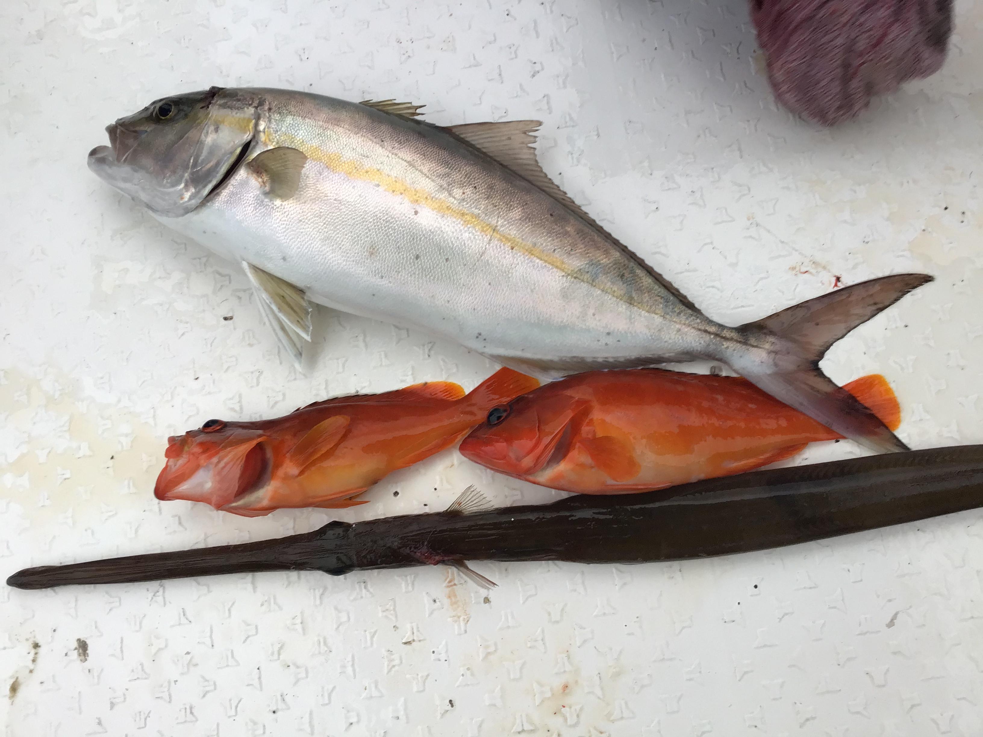 昨日は、北東と南東からうねりが入る変な感じの海でした。午前中は、インストラクターさんと2人で、2時間程沖に出ましたが、ナブラもなくアカハタ、ヤイトガツオ、シイラの釣果でした。午後からは3世代のファミリーフィッシング。船釣りは初めてということで、ポイントに着いた後、ベイトリールの使い方など、タイラバの釣り方を説明。実際にタイラバを落として説明しようと思ったら、何と着底後にすぐにヒット。子供さんに竿を渡して巻き上げてもらうと、アカハタが2匹、食いついていました。これは!と思ったもののさほど当たりが続かずヤガラやアカハタをパラパラと追加。ふと見るとお婆様の竿が海中に引き込まれているではありませんか。根がかりかもと思いながらタモを持っていくと、竿先をグイグイと海中に引き込んでいきます。これは大物だとすぐに確信しました。巻いても巻いても、ラインが引き出され、なかなか上がってきません。数分にわたる一進一退の攻防が続きます。腕もかなり痺れてきているご様子。ドラグを緩めに設定していましたが、ようやく、ラインの出ていく量より、巻き取る量の方は多くなってきました。徐々に引き寄せて、海中から姿を現したのは、良型のカンパチ。65センチ程だと思いましたが、見事にメモリアルなカンパチゲットとなりました。今度は子供さんが何やら重量感のある獲物をかけています。ふうふう言いながら巻き上げて、上がってきたのは何とタコ。私も物心ついた時から釣りをしてきましたが、タコが釣れたのは初めて。至る所に吸盤で張り付くタコから針を外すのは大変でした。タイラバでタコが釣れるなんて珍しいこともあるもんだと思っていると、何と次の一投でもタコが!まぐれではなかったようです。不規則な波があり、しんどい釣りになりましたが、結構、思い出に残る釣行になったようでした。写真は釣果の一部です! ![]() ![]() |