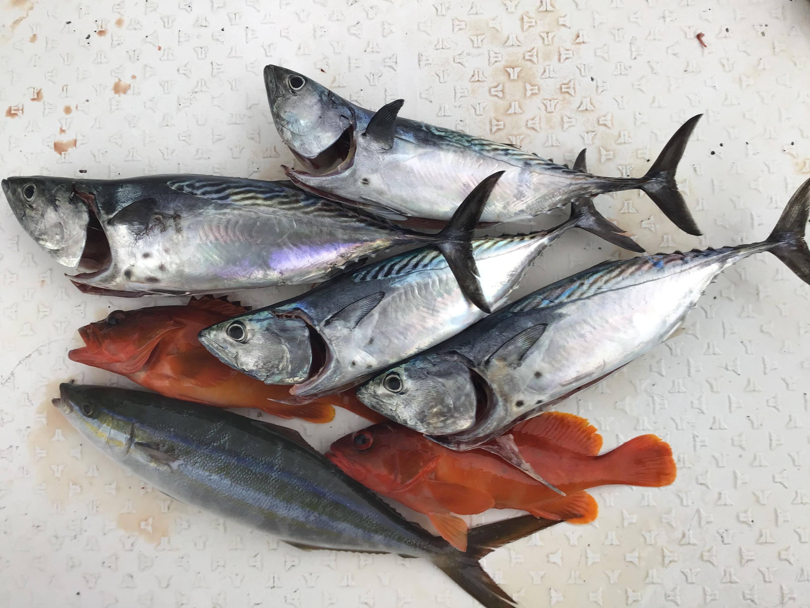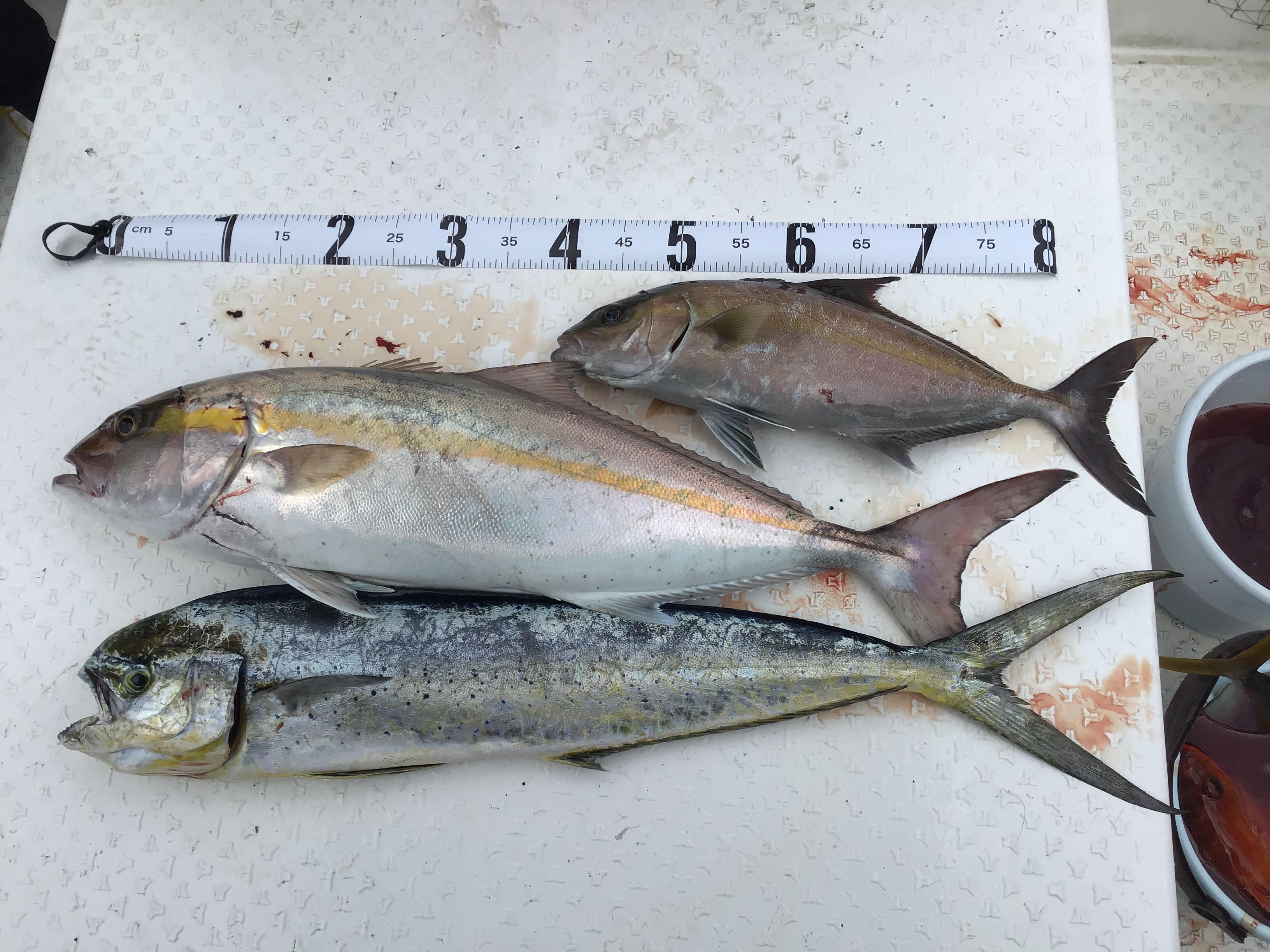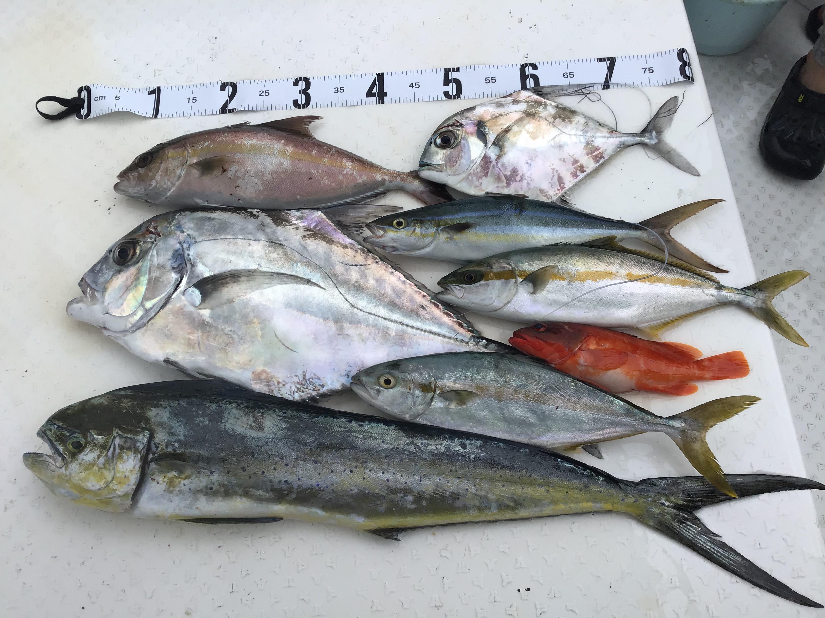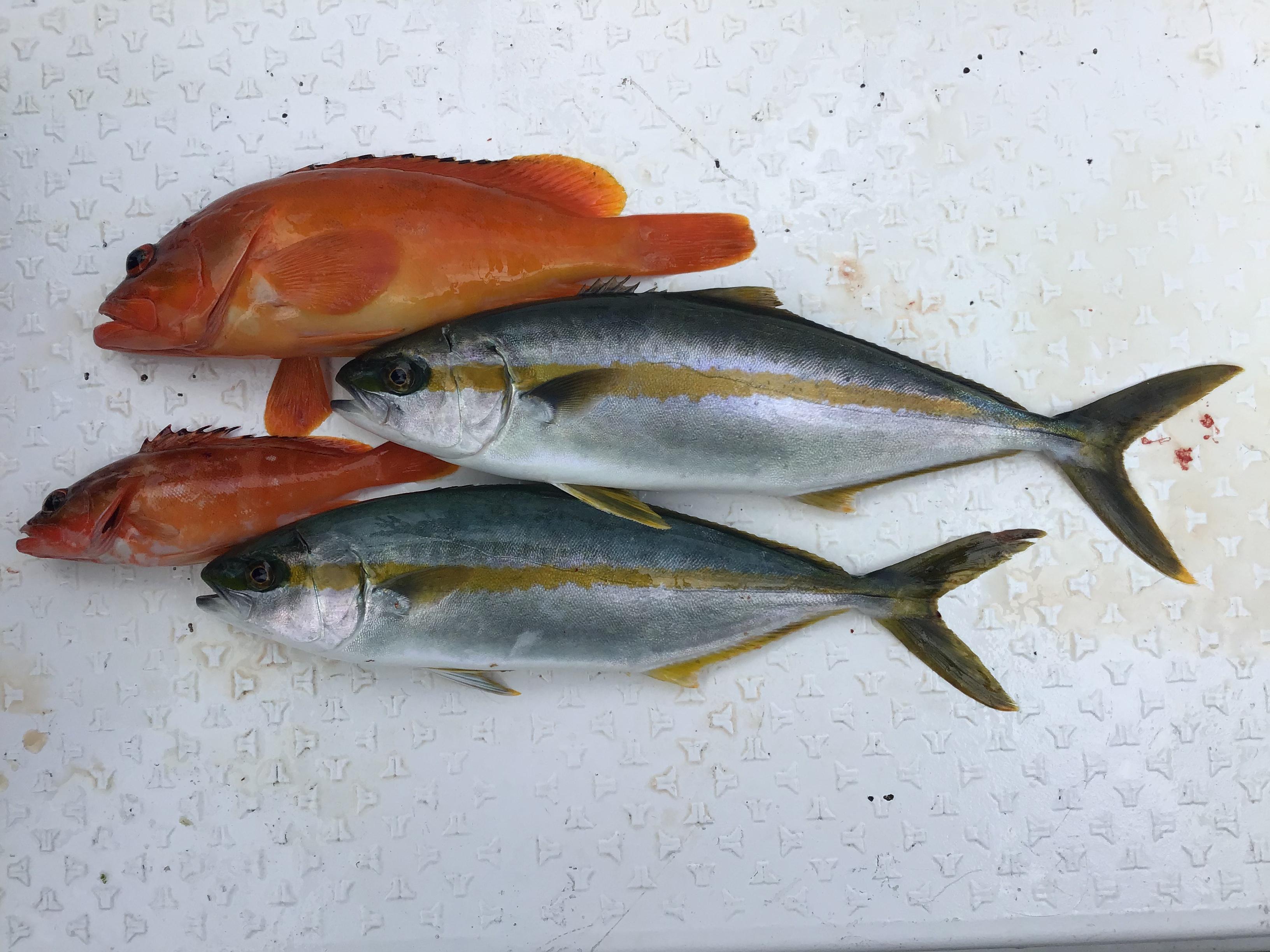 昨日はフルのお客様お一人と午前、午後それぞれお二人での釣行でした。風波を心配していましたが、最初から沖に出れる程度でした。ポイントを転々として、皆様アカハタ、シイラ、ネリゴをゲット。そして別の瀬に向かう途中ひらめきがあって、浅瀬でキャスティングゲームをすることにしました。これが当たりでした。舳先で釣られているお客様が50センチ程のヒラマサをかけられて取り込んでいると、とも(船尾)のお客様に何やら大物がヒット。歴戦のアングラーさんですが「えらい引くな〜」を連発。寄せたと思うとスプールを反転させながら「ジー、ジーー、ジー」とラインを引き出されていきます。結構暴れ回っていましたので、ヒラマサのサイズアップかと思いましたが、ようやく海中に見えてきたのは、カンパチ特有の色合い。「オー、デカイ、デカイ」という声が飛び交います。取り込んだのは80センチ程のカンパチでした。生簀に入れるとシイラと同じ大きさ。先程釣られたネリゴの倍の大きさ。その後もヒラマサの子などを追加して午前ハーフ終了となりました。キャスティングゲームの面白さを十分楽しまれたようでした。午後も初めから浅瀬でのキャスティングゲーム!シイラや50センチ程のヒラマサの子、イトヒキアジ、ネリゴ、ヤイトガツオ(丸々とした50センチ程の個体も混じってきました)、ツンブリが面白いように喰ってきました。シイラのジャンプでラインブレイクしたり、おそらくヒラマサだと思いましたが、やり取りの末、根に巻かれてリーダーを切られたりと大変スリリングなゲームとなりました。周囲では数千匹のわきグレの他、ハンマーヘッドシャークがウヨウヨしていたり、2メートル近いマグロやメーターオーバーのトビエイがジャンプしたりと浅瀬の上はかなりの活性が感じられました。午後もキャスティングゲームを堪能されて終了となりました。現在、海況が日替わりで大きく変化していますが、今日の状況が続いて欲しいですね! ![]() ![]() ![]() ![]() |