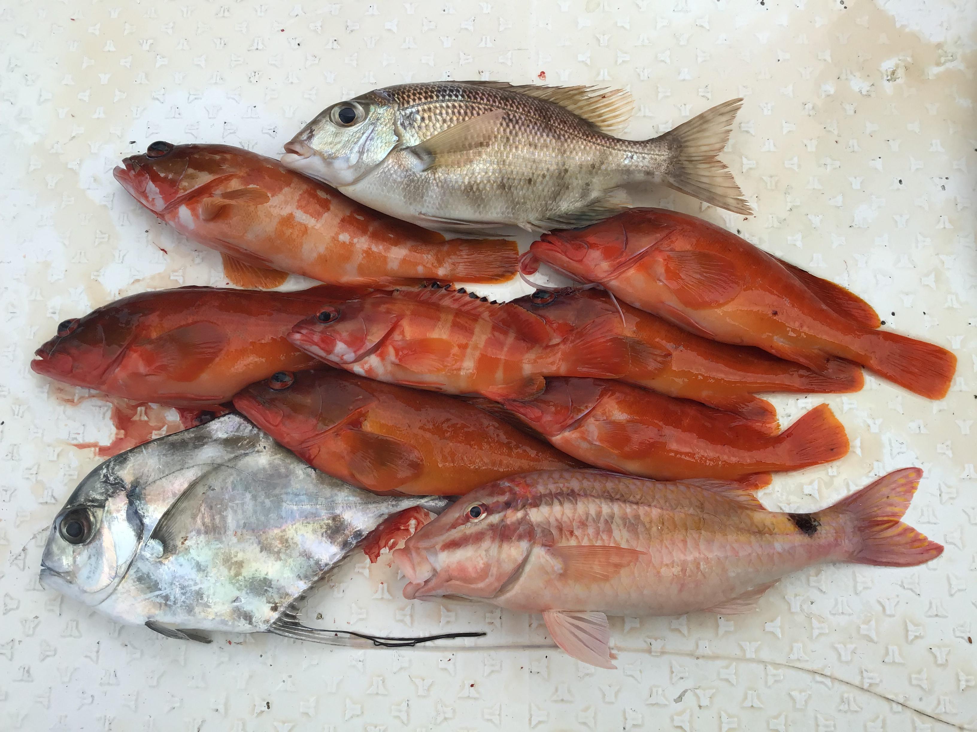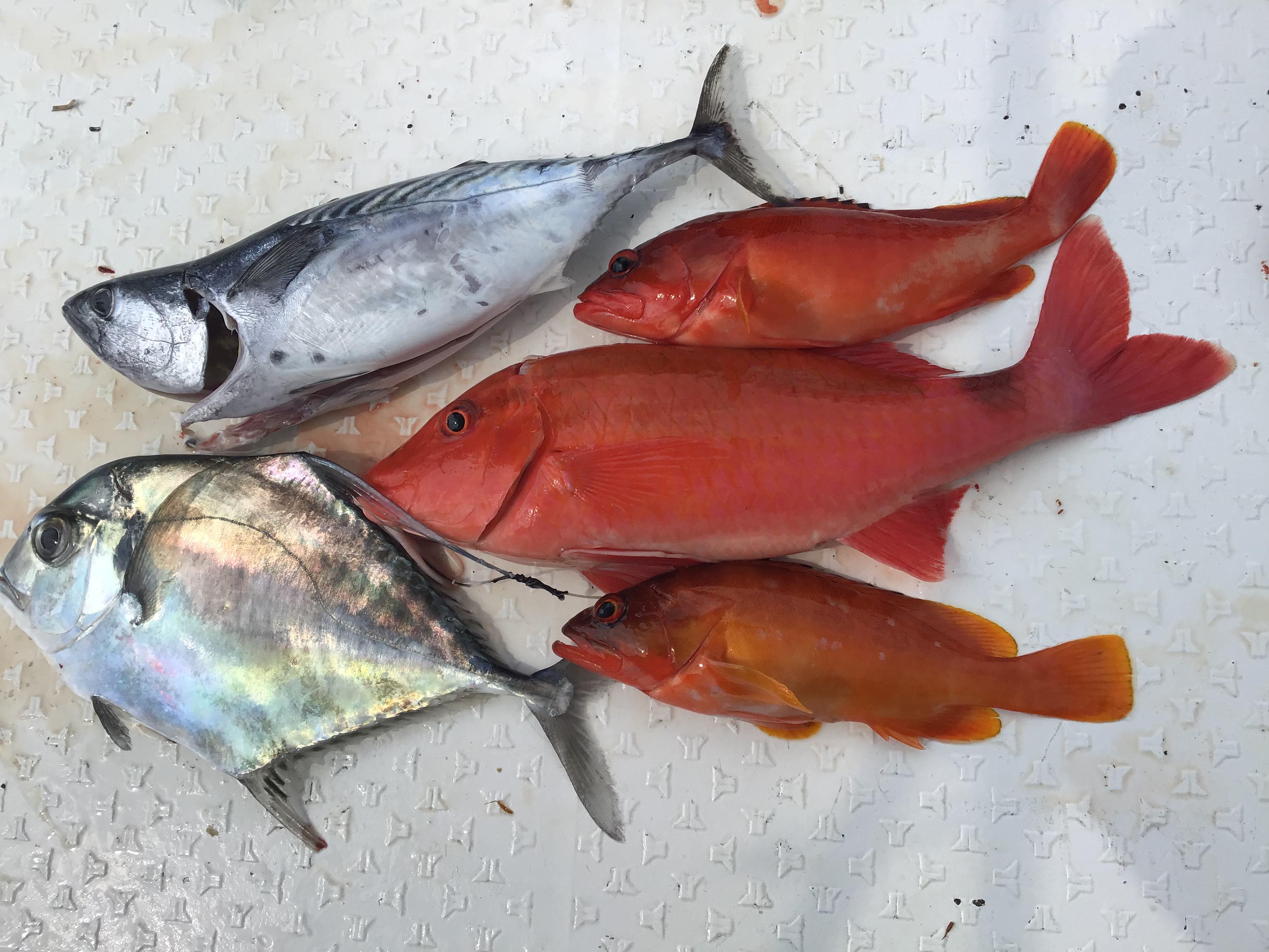 昨日は、久々の出船でした。思ったより北西の風が強く風波が立っていましたが、最近好調のポイントに行きました。すぐにアカハタが喰ってきて、1つのジグに2匹かかっていたりとアカハタは絶好調。小ぶりなものは全てリリース。大きなオジサンも釣れましたが、青物が出ないので、さらに沖のポイントへ。ここでヤイトガツオを追加。その後キャスティングのポイントに行きますが、ハンマーヘッドシャークしかいない感じ。1メートル程の白金の魚体がジャンプして、ちょっとときめきましたが、イトヒキアジ、メイチダイを追加したのみでした。ここで午前ハーフは終了。午後もフルのお客様と沖に向かいました。風の方向が変わる予報だったのでベタ凪かと思いきや、ほんの短い間に風が南東に変化。すでに結構な風波が立っていました。また暗雲が出てきたので天気予報をチェックすると、強風予報に変わっており、さらに雷注意報が出されていました。ここで当たりがありましたが、ジグのブレードだけ食いちぎられてゲットとはなりませんでした。近場に避難してエサ釣りをしてみますが、釣果なし。午後は落ち着かないまま、早目の終了となりました。1枚目は午前ハーフお二人の釣果、2枚目がフルのお客様お一人の釣果です。 ![]() ![]() |