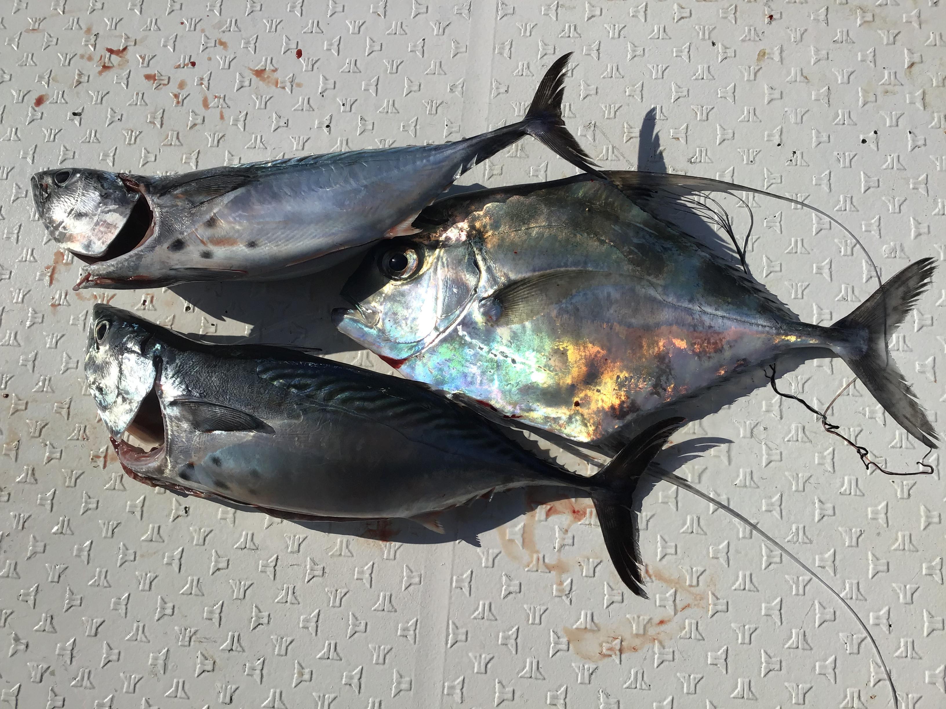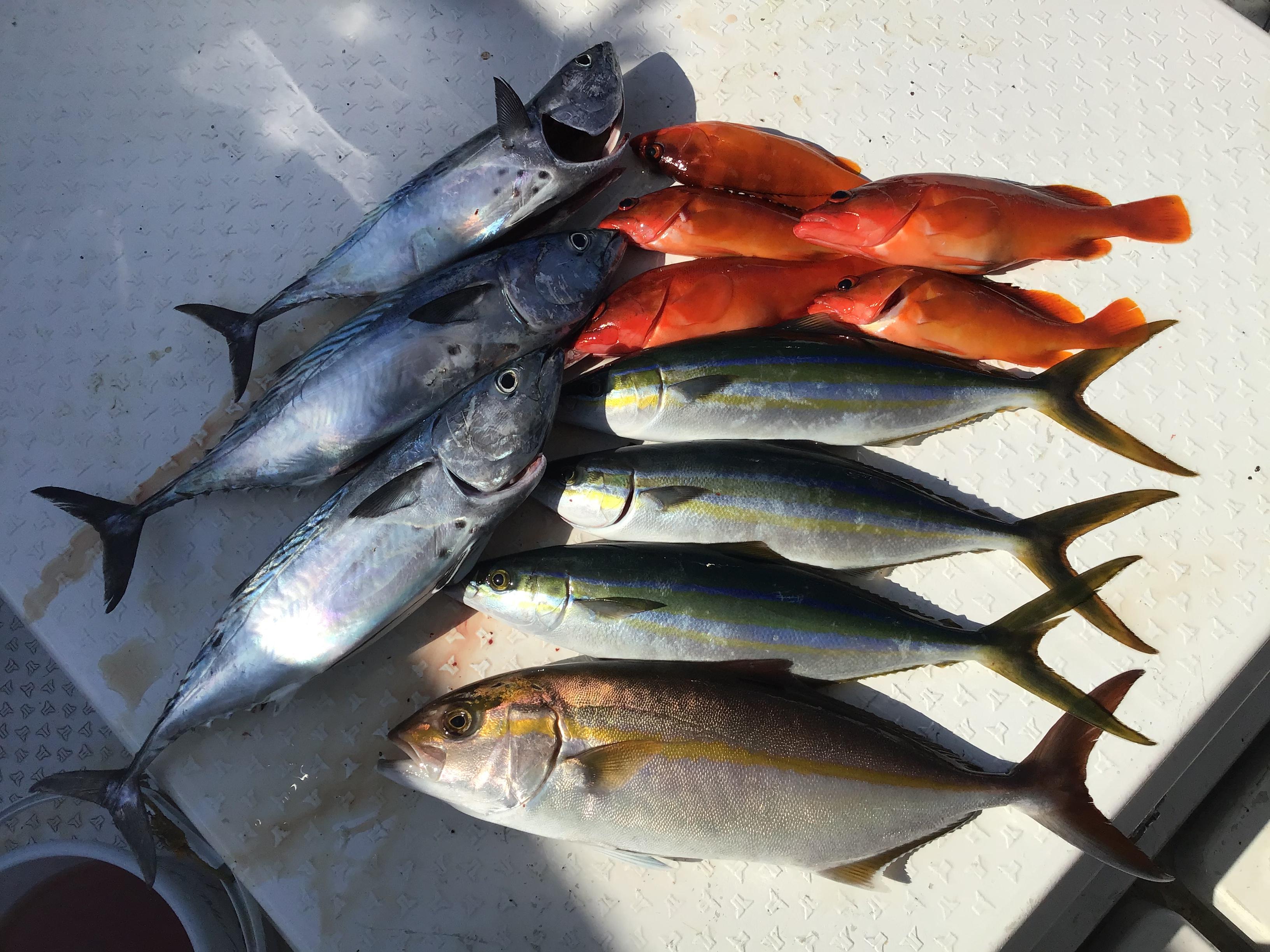 昨日はフルのお客様お一人と午後ハーフお一人での釣行でした。朝から沖の瀬に向かい早速キャスティング。早い段階で50センチオーバーのカンパチをゲット。ヤイトガツオも追加して、一旦港へ。午後のお客様を乗せて再び沖の瀬に。タイラバでアカハタ祭りになりましたが、その後キャスティングゲームに突入。ジグを追いかけてくる姿は何度か見ましたが、ヒットせず。ようやくイトヒキアジをゲットして、別の瀬に向かう途中、トビウオが追われて逃げ回る姿を確認。近くに行くとボイルも見られました。早速キャスティングゲームを始めるとジグを追ってくる姿が何度も見られます。ともで釣られている常連様はヤイトガツオやツンブリを次々にゲット。緊迫感があり、見ていて本当に面白そうでしたから、釣られているお客様はもっと楽しまれたことと思います♪ 上の写真がフルのお客様、下は午後ハーフのお客様の釣果です。 ![]() ![]() |