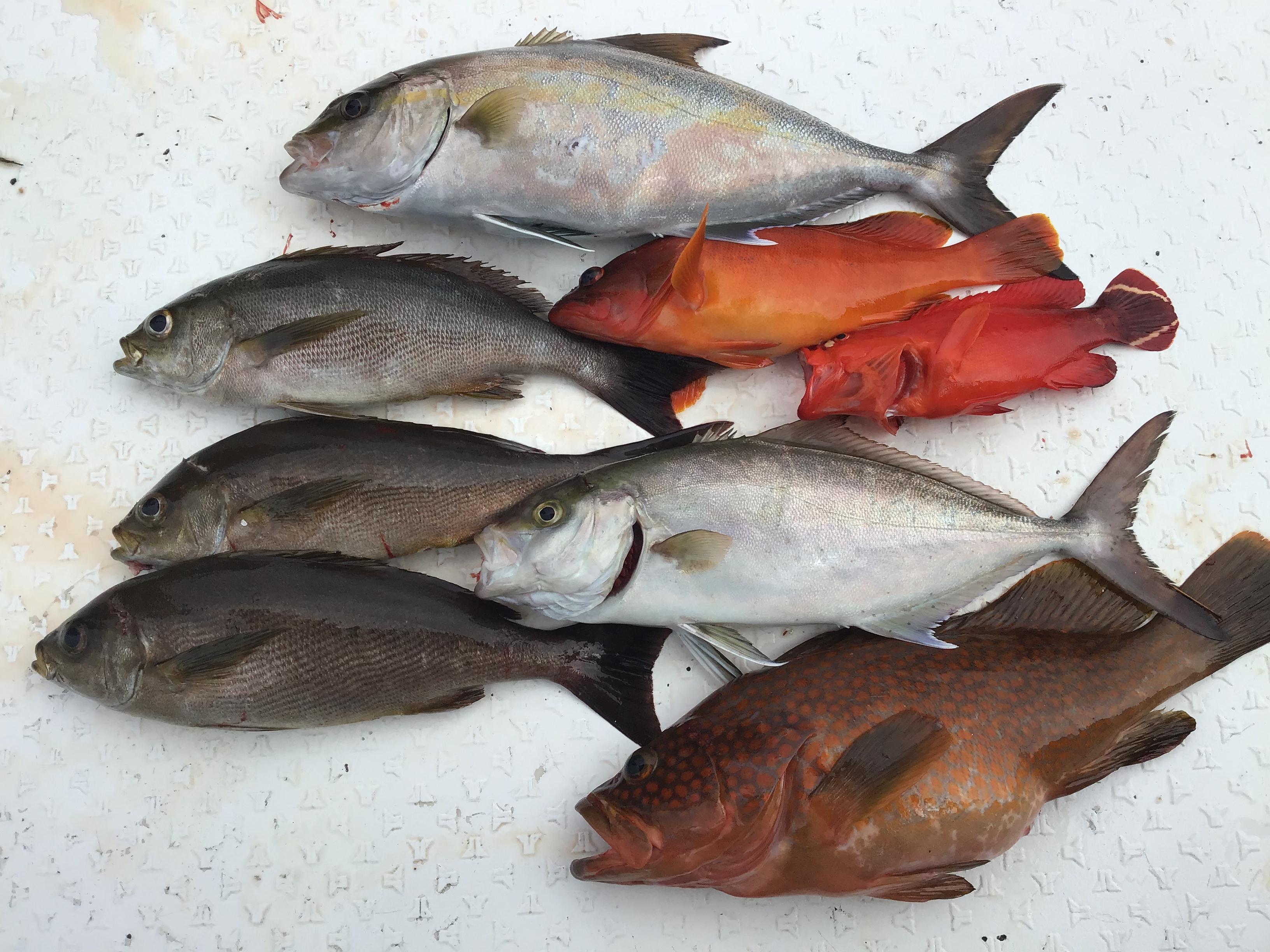 昨日は、午後から台風のうねりが入る予報が出ていたので、早朝出港で出船しました。やれるうちに沖の瀬に。すると一流し目からイサキがヒット。更にヒットが続きます。しかしながら、ヒットしたうちの半分以上は針バレ。イサキはアジ、シマアジと並ぶ口切れを起こしやすい魚種なので間違いなくイサキだと思います。今度は竿先を絞り込む大物の当たり。ラインを巻いては出され、巻いては出されを繰り返し、時間をかけて取り込んでいきます。クルクル回ればイトヒキアジですが、見えてきたのはカンパチ。よく引いたと思いましたが、スレがかりの50センチ程のヒレナガカンパチでした。すると今度は何やら根魚の重量感のある当たり。上がってきたのは40センチ程のパンパンになったキジハタ!見事な1匹でした。朝イチの一流し目でこのように当たり連発、大盛り上がり。「早起きは三文の徳」と言いますが、今日は凄いことになるぞ!と思いきや、二流し目からはバイトがなくなってしまいました。その後、近場近場へと避難しましたが、風も緩み、穏やかな海になりました。アカハタなどを追加し、最後のポイントへ。ここで40センチオーバーのネリゴを追加し、終了となりました。写真はお二人分です! ![]() |