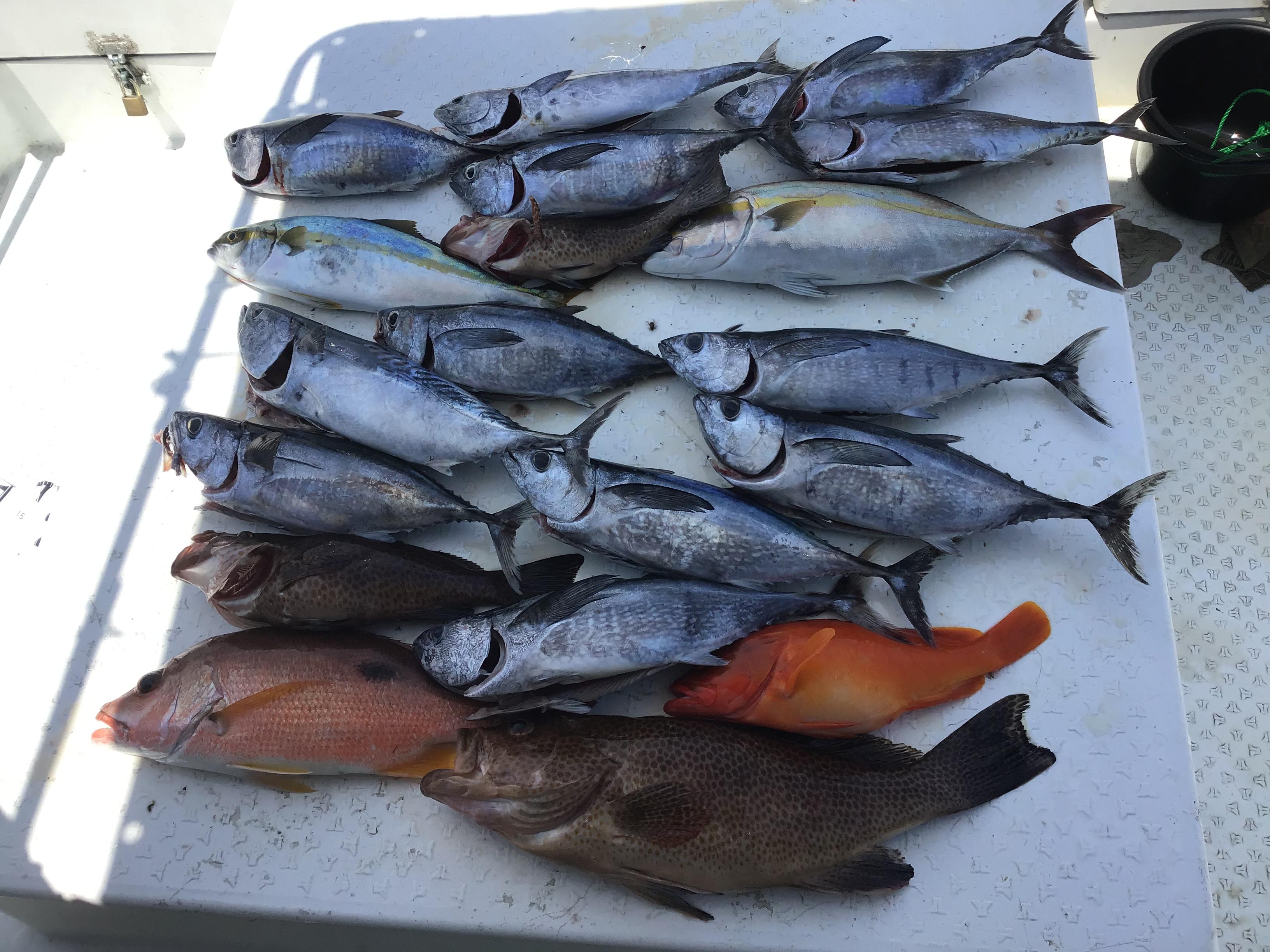 昨日はお二人様チャーター状態での釣行でした。早速一昨日イサキやキジハタが釣れたポイントへ。ベイトの好反応が出ますが、バイトがありません。そこで初めて攻める隣の瀬に移動。これが良かった。ピンポイントながら海底に引き込む当たり。50センチ弱のネリゴでした。続いてもうお1人にも大物の当たり。重量感のある引きです。上がってきたのは本船のランカークラス、ちょうど50センチのオオモンハタでした。その後もクロホシフエダイ、カンパチ、オオモンハタ、ヒラマサの子などを追加。後半はキャスティングゲームに突入。一時期入れ食い状態に!写真はお二人分です! ![]() |