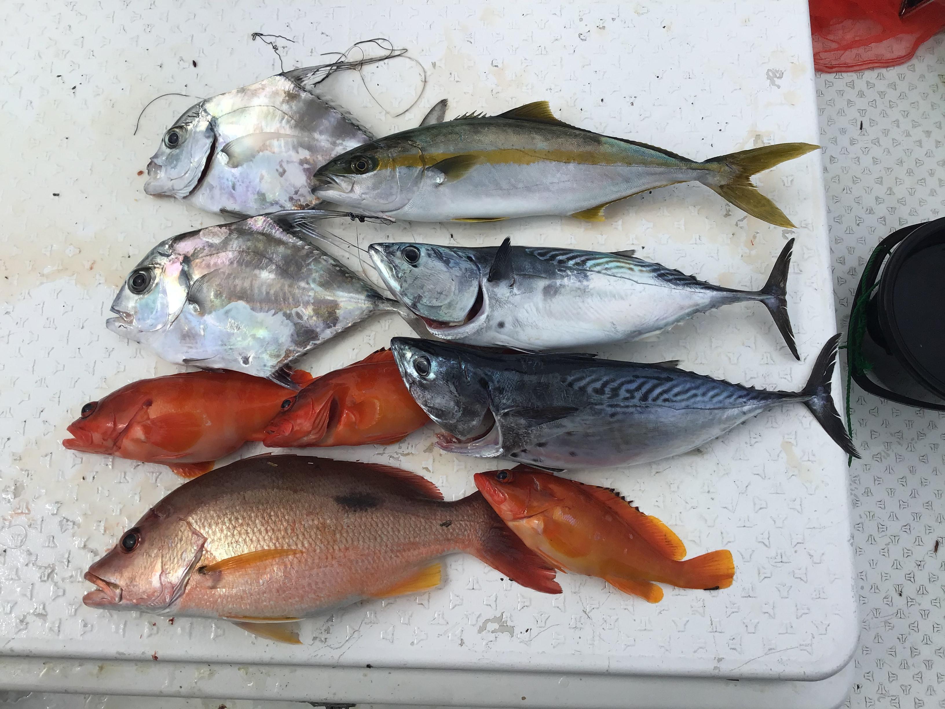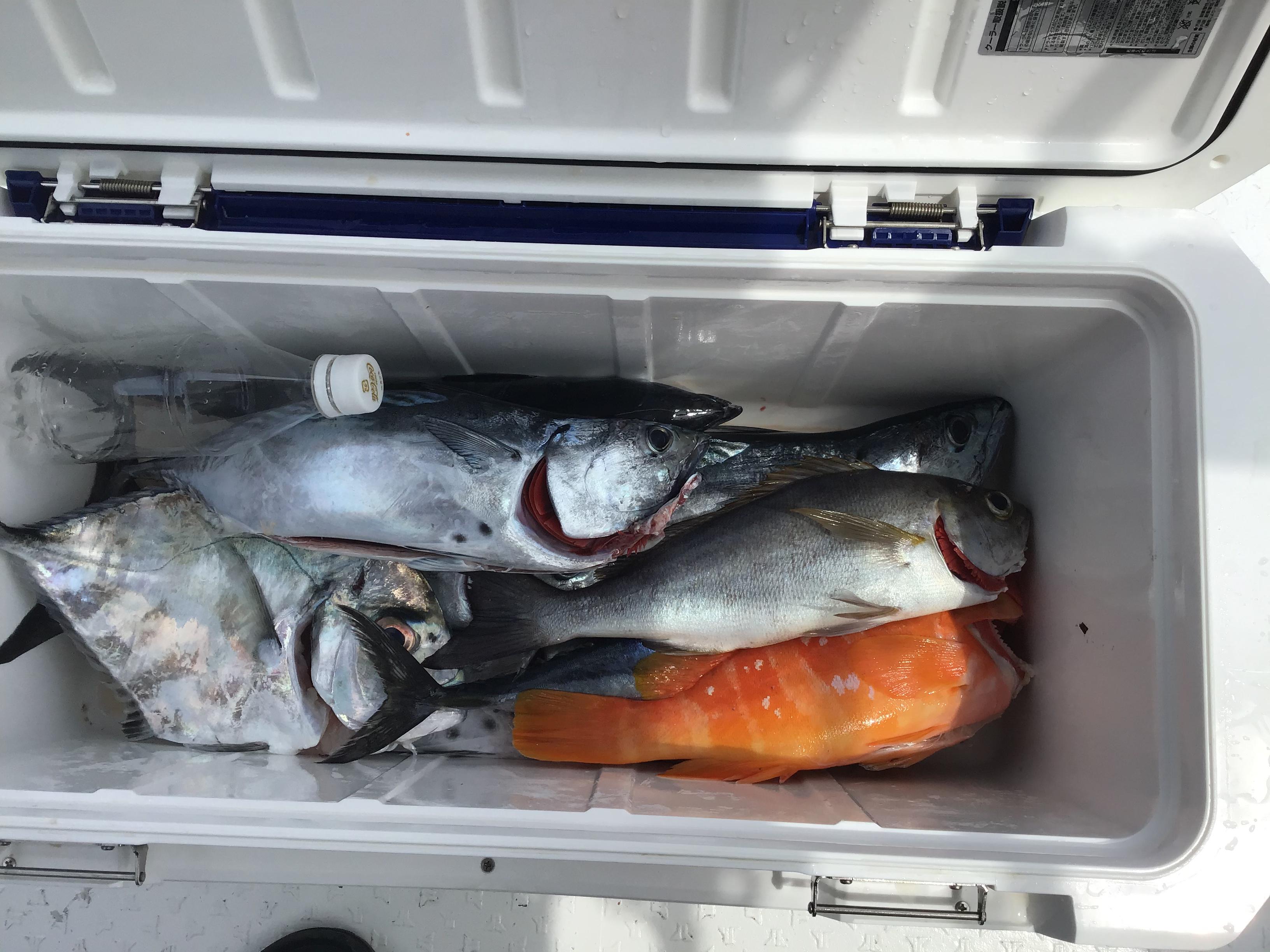 昨日は予報通りうねりが残っており、港近くの道路から見た感じでは、ちょっと無理かなという感じでした。とりあえず出船すると、何とかやれそうだったので、そのまま沖の背に向かいました。最近好調のポイントにつくと、ベイトの好反応が出ますが、なかなかバイトがありません。50くらいのヤイトガツオとコシナガマグロを1匹ずつゲットして、ポイント移動。するとここでピンク系のTGベイトが大当たり。イトヒキアジ、アカハタ、ヤイト、コシナガマグロ、ヒラマサの子などが連発。午前ハーフ最後の一流しで、40センチ程のイサキを追加して午前の部終了となりました。午後からフルのお客様と同じポイントへ。午前中は結構ボイルがありましたが、午後は沈黙。しかし周辺には回遊しているようで、キャスティングしてジグを沈めて巻いてくるとヤイトガツオの当たり。さらにイトヒキアジなども追加。ジグを小さなシルエットに替えて、当たり連発。ここで大物の当たりがあり、やり取りの末、もう魚が見えるというところまで巻き上げてきましたが、痛恨のラインブレイク。魚の引き方から推察すると、おそらくカンパチかイトヒキアジのデカバンだったと思います。その後もクロホシフエダイやアカハタ、メイチダイなどを次々に仕留められて終了となりました。写真は上が午前ハーフお一人様の釣果、下がフルお一人様の釣果です!やはりジグで釣果が変わりますね! ![]() ![]() |