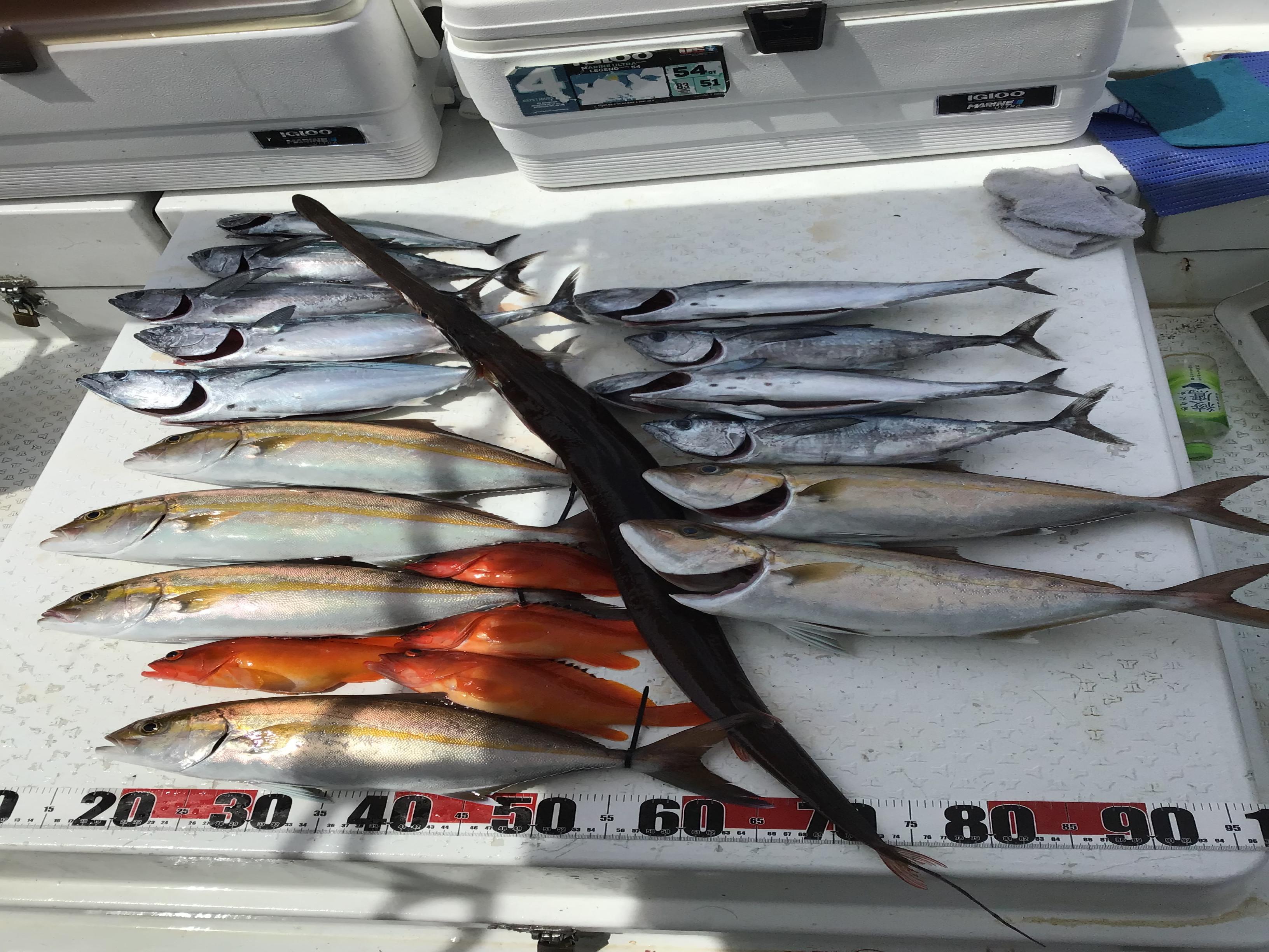 昨日は梅雨の合間で、弱風ベタ凪の釣り日和となりました。フルの4名様と沖に向かいました。最初の一流しから、強引な当たり。50センチ程のカンパチです。その後も、カンパチ、アカハタなどが連発!この調子で行くと今日はどうなるんだろう?と思いましたが、同じコースのふた流し目ではカンパチが一枚のみ。3回目の流しではノーバイトとなってしまいました。GPSの航跡をしっかり辿っているのにこのような釣果となりました。そこで、さらに沖へ。ベイトの激アツ反応は次々に出ますがノーバイト。さらに沖へ。途中でボイルが出やすいので、キャスティングの準備をしていただきましたが、やはり出ました。すぐに船を横付けしてキャスティング開始。50センチに近いヤイトガツオやコシナガマグロが、まあ、喰うわ、釣れるわで船上は大変なことになりました。タモ入れが間に合わず、セルフサービス状態。タモが間に合わずに何匹かはリリースしてしまいました。鮫も数匹寄ってきていましたが、引き寄せている魚を追いかけてきて、次々にやられます。ジグそのものも何個かやられてしまう始末。くたびれたこともあり、さらに沖にカンパチ狙いに行ってみました。しかしながら、どこに行っても海中が砂漠状態。ソーダカツオが1匹のみで離脱となりました。その後も戻りながらポイントを攻めますが、ポツンポツンと当たる程度。最後の一流しで、目が覚めるような当たり。この引きはカンパチ。この日最大の53センチの丸々とした本カンパチでした。写真は2名様分です。他の2名様分も同様の釣果(カンパチは少な目)でした。せっかくクーラーから魚を出して並べていただいたのですが、撮影がうまくできていませんでしたので、掲載できませんでした。申し訳ありません!朝イチのひと流しで釣れることが多いのかな? ![]() |