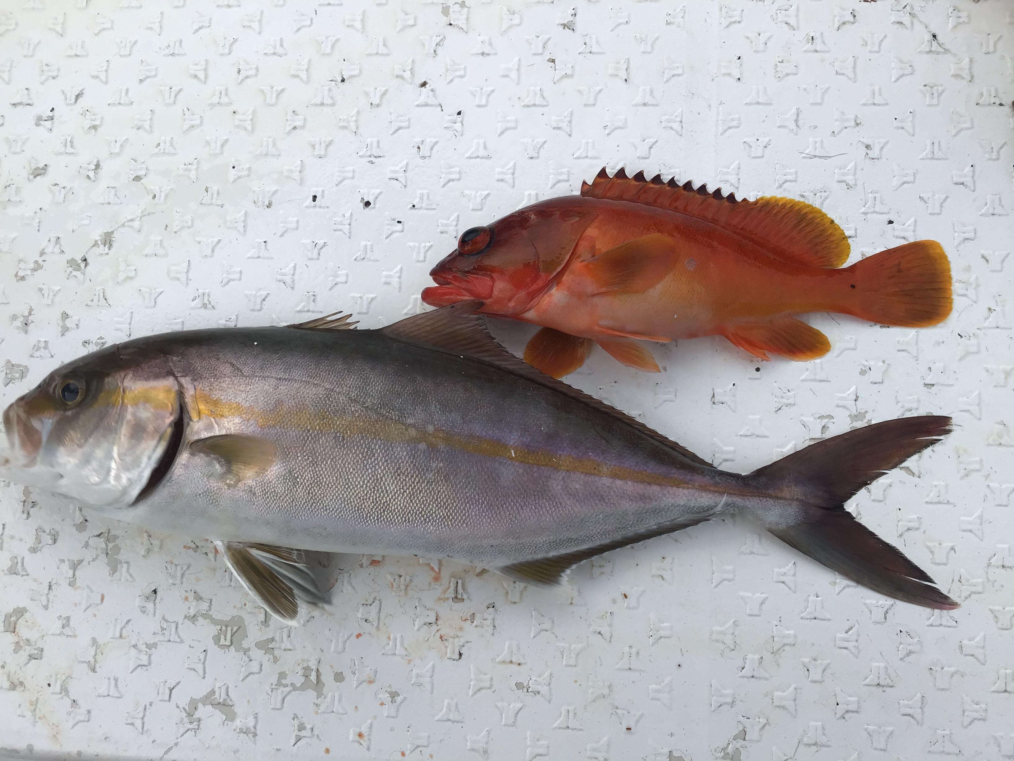 昨日は、「梅雨の合間」に、という感じで、休み返上、出船時刻を遅らせてお二人様での釣行でした。予報が、見るたびに変わっていて、判断が難しい状況ですが、まあ、何とか沖の瀬に向かいました。後に風波が太ってくるかもと思い、手前をチャッチャと流しながら沖の方に出ました。既に風波がある中、いきなり、なかなかいい当たり。カンパチかと思いましたが、上がってきたのは40センチ程のアコウ!ナイスフィッシュでした。その後、イサキ狙いのお客様にイサキがヒット。タモが間に合わず、船内に引き上げようとした瞬間、口切れで痛恨のリリース。その後、アカハタをゲットして、ここまで。激アツ反応は出ますがバイトがありません。仕方なく、風波を避けて、手前手前のポイントへと戻ってきますが、ノーバイトとなりました。ここで午前ハーフのお客様は終了。午前のリベンジをしたいということで、もうお一人様は午後も延長。午前と同じように攻めますが、なかなか渋い。午前中同様、ベイトの激アツ反応は出ますが当たらない。終了時刻が迫る中、沖の浅瀬に移動してキャスティング開始。これが良かった。何と2投目にいい当たり。浅瀬で喰わせているので、かかった魚は下へは潜らず、横へ横へと走ります。ヤイトガツオのデカバンかと思いましたが、浮いてきたのは50センチ程のカンパチでした。お友達のカンパチが、タモ入れ寸前までついてきましたので群れていたのでしょう。その後もお友達を探して付近を流しますがここまで!この渋い状況で、リベンジ成功とはさすがでした。 ![]() ![]() |