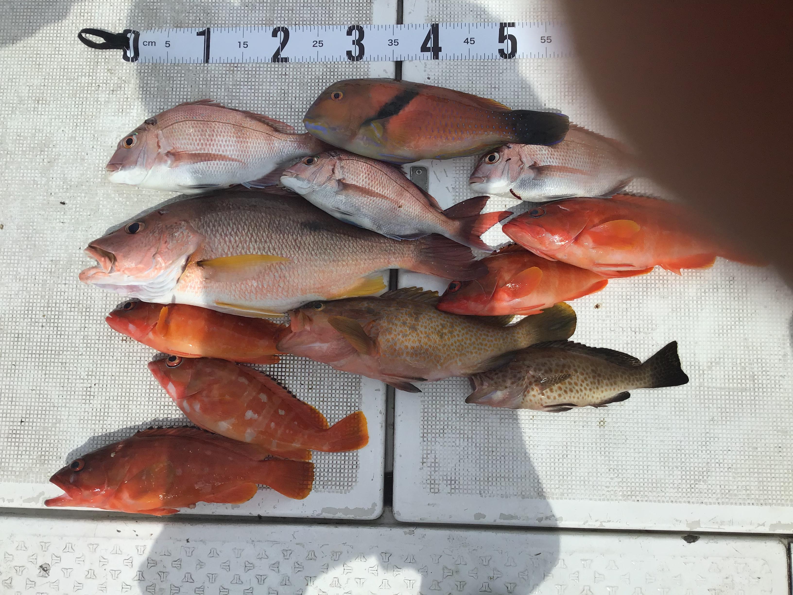 昨日は荒天予報ながら、早いうちならやれるかもということで出船してきました。朝イチから沖の瀬に行くと、激流もなくいい感じ。早速、竿先を海中に引き込むいい当たり。青物ではないだろうと思いましたが、上がってきたのはクロホシフエダイの53センチ。幸先がよかったのですが、ベイトの激アツ反応が続くものの、アカハタがポツポツという感じ。諦めて場所を移動すると、またアカハタ連発。さらにマダイポイントに移動すると、やや小ぶりでしたが美しいマダイも連発。ラストひと流しでオオモンハタやキジハタを追加し、根魚祭り終了となりました。写真はお二人様の釣果です。 ![]() |