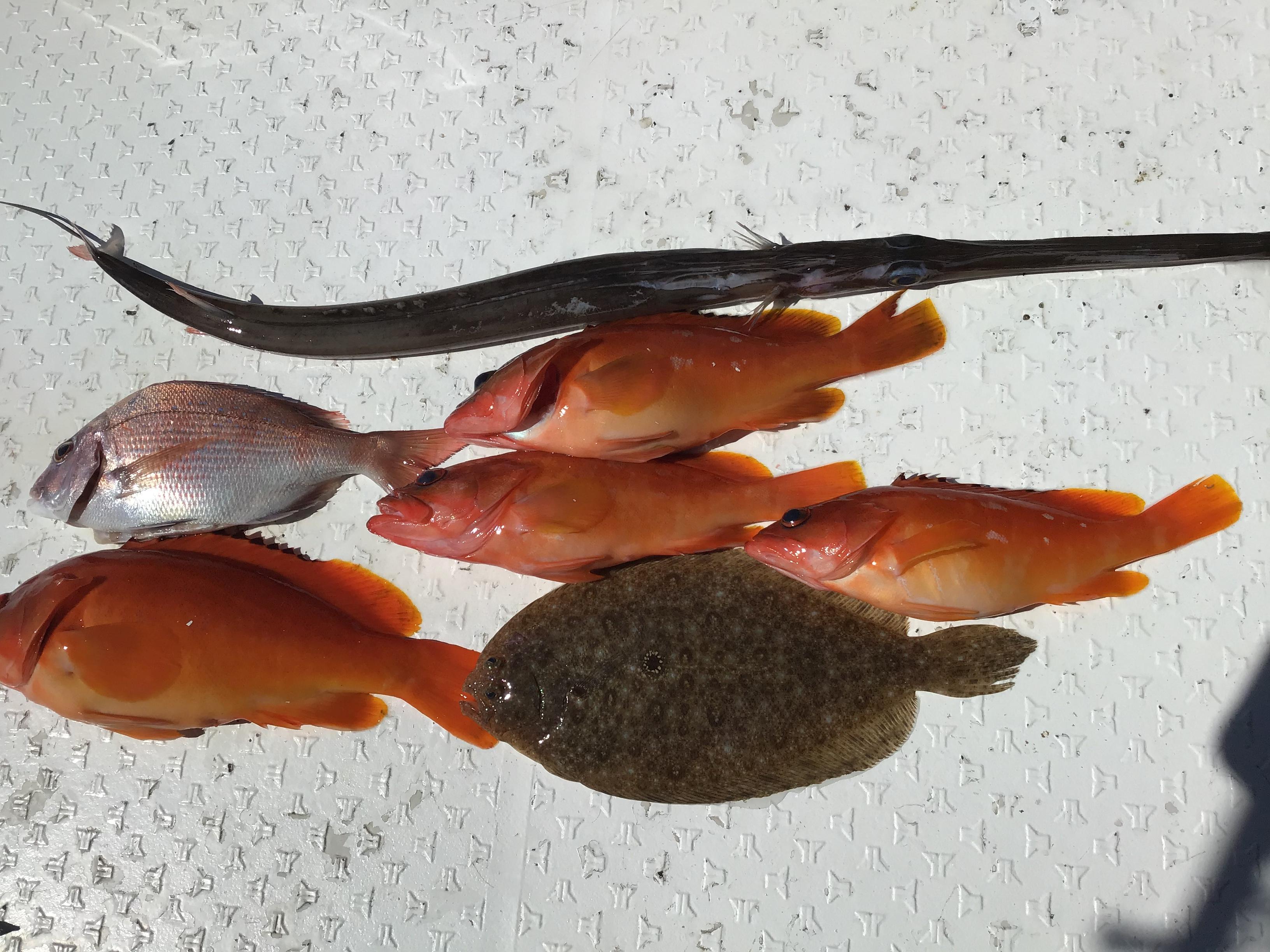 昨日は午前お一人様、フル3名様での釣行でした。天候にも恵まれ絶好の釣り日和。早速沖の瀬に出ると、次々にベイトの激アツ反応がありますが、食ってこない。そんな中、ジギング、タイラバで粘り強く誘い続け、イラやアカハタをポツポツと仕留めていかれました。午前後半からは、またまた速い潮が!ここはどうかと、実績のあるポイントをさすらい続けましたが、現状を打開できず!午前のお客様は良型のイラ、アカハタを数匹ゲットされ終了。午後からもさらにさすらい続けましたが、南からの強風の中、マダイ、アカハタ、ガンゾウヒラメ、ヤガラを仕留めて終了となりました。写真はフルのお客様の釣果です。 ![]() |