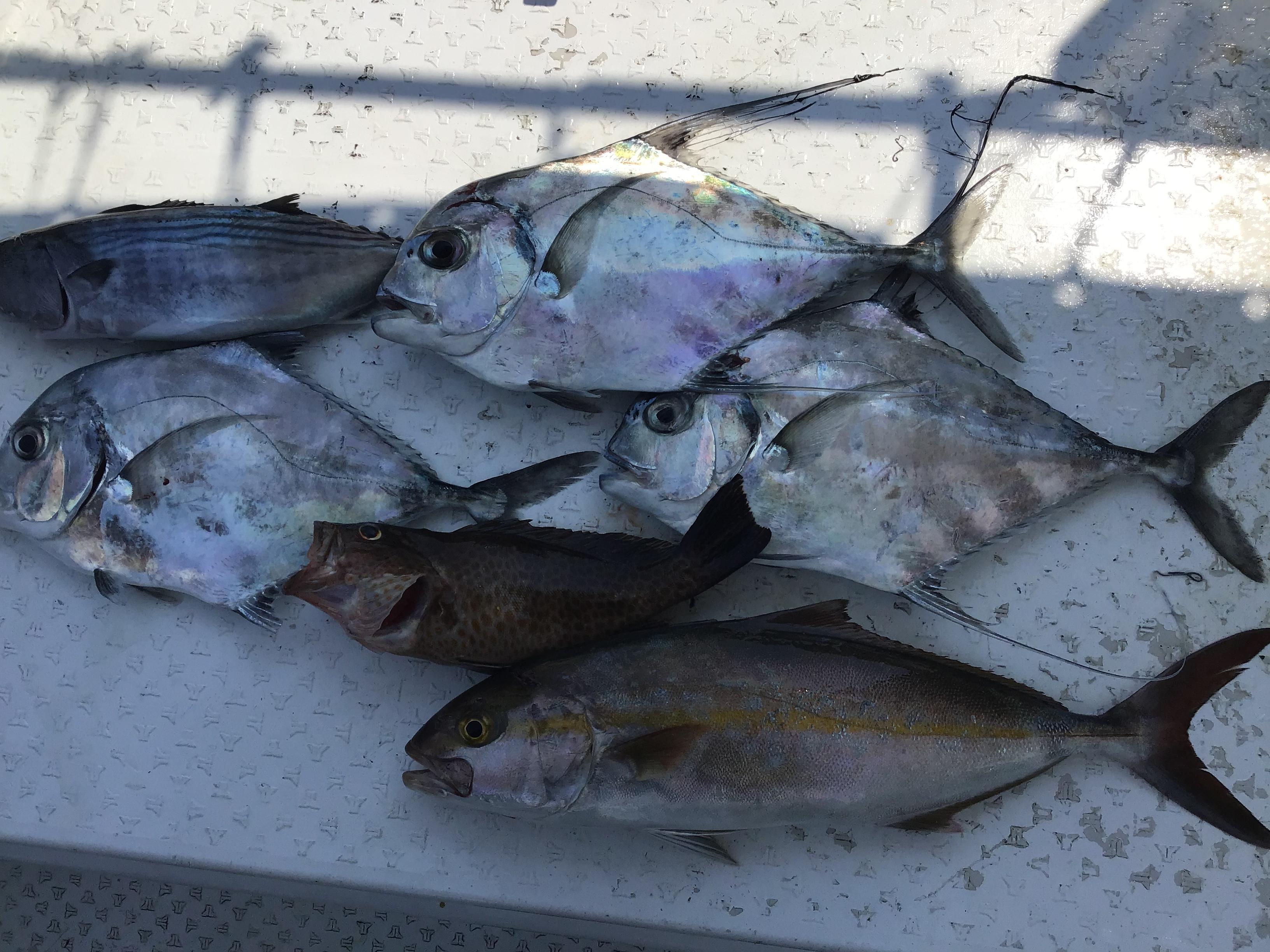 昨日は午前ハーフお二人様の釣行でした。海は穏やかでいい感じ!早速沖の瀬に向かいました。釣りを開始してしばらくすると、竿先を絞り込むいい当たり。見えてきたのは、50オーバーのカンパチでした。その後も、パラパラと当たりが続き、イトヒキアジを追加していきました。ほとんどが、フォール後に当たってくるようでした。その後、緑色の潮が流れ込んできて、嫌な予感がしましたが、ここで歯がギザギザで体側に模様のある魚がヒット。オキザワラの幼魚?サゴシ?という感じでしたが、港に戻りクーラーから出してみると、どこからどう見てもハガツオでした。昨日もデカバンが掛かりますがラインブレイク。このところ、毎回デカバンにやられるケースが続いており、フィッシュイーターの活性が上がってきて、ちょっとだけ上向きになってきたのかなと思います。写真はお二人分です! ![]() |