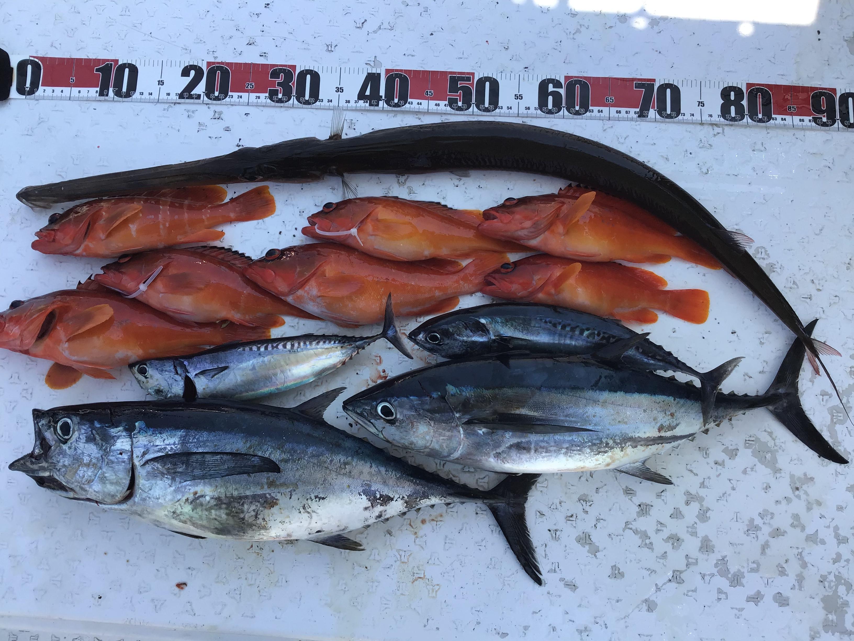 本日は午前ハーフチャーターでの出船でした。今日も海は凪で、微風、良いコンディション。早速沖に向かいました。開始早々ドラグ音を立てて、ラインを引き出していくいい当たり。竿先をのしていく状況からデカバンだとわかります。強い引きに耐えているといきなり竿先が戻ってしまいました。痛恨のフックオフ。その後は当たりもなく、ポイントを転々とする放浪状態に。何とかアカハタ、ソーダカツオ(ヒラソーダ)などを追加。沖に潮目が来てカツオらしい魚が広範囲にパシャパシャと出ていたので、潮目狙い。すると来ました。ラインを引き出しながら走り回ります。道糸は0、8号。ドラグゆるゆるで勝負しますが、ラインはどんどん引き出されていきます。ここで、ほんのちょっぴりドラグを締めて、ただひたすらリールを巻き続けていると、ようやくこちらのペースになり、徐々に寄ってきます。右に左に走り回りながら見えてきたのは55センチ程の丸々とした良型コシナガマグロ。その後も同サイズを追加。フィッシュイーターの気配を感じる釣行となりました。 ![]() |