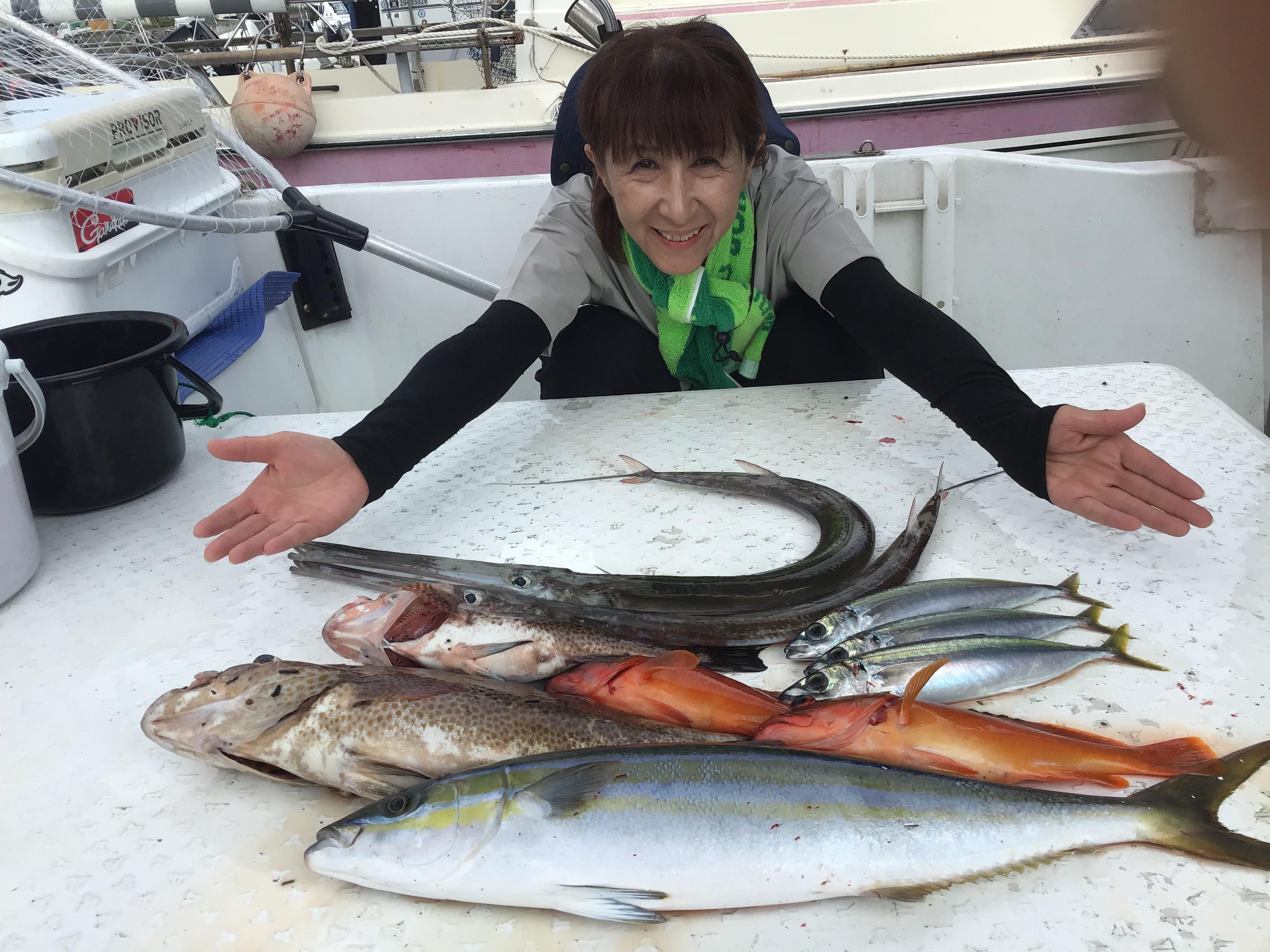 今日はお二人様チャーター状態での出船でした。お一人は竿を持つのが人生初ということで、沖に出てタイラバのレクチャーから。「まずはリールのここをパチンと押すとラインが出てタイラバが沈んでいきます。」あれ、沈んでいかない! と思ったら、いきなり強い引きが!喰っちゃいました!フォール中に喰ったようですが、海中に竿先が引きずり込まれます。カンパチ特有のあたり。やり取りをしてお客様に竿を渡そうと思ったら、急に軽くなりました。バレてしまいましたが、シケ明けながら、魚がいることを確信しました。その後、タイラバスタート。初めてのお客様に、良型オオモンハタやヤガラ、アカハタなどを次々にヒット。もうお一人の女性アングラーの方には当たりがなく、ここでジギング、キャスティングにも挑戦して頂きました。こちらもキャスティングは初めてということでしたが、いきなり40メートル程のロングキャスト。度肝を抜かれました。暑い中に諦めることなくキャストを繰り返していると、何回か当たりがありましたが、ゲットとはなりませんでした。しかし、初釣りの方にはタイラバでいい当たり。上げてみると、なんと、オオモンハタと、60センチ程のツンブリのダブルヒット。ビギナーズラックとはよく言ったものだなぁと感心しました。顔出しOKということで、喜びのお写真を掲載させて頂きました! ![]() |
