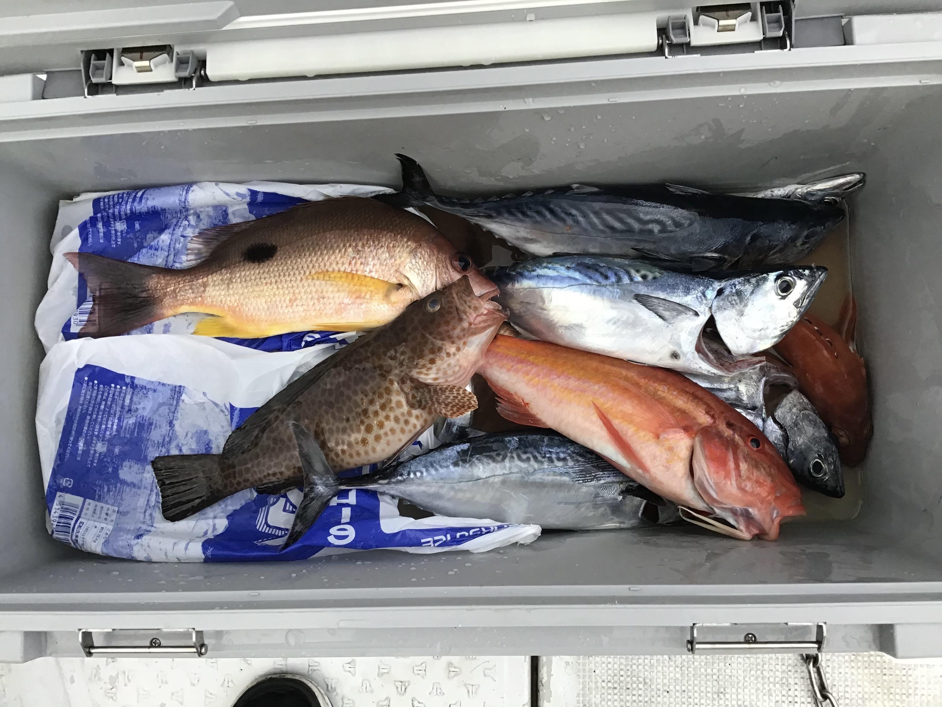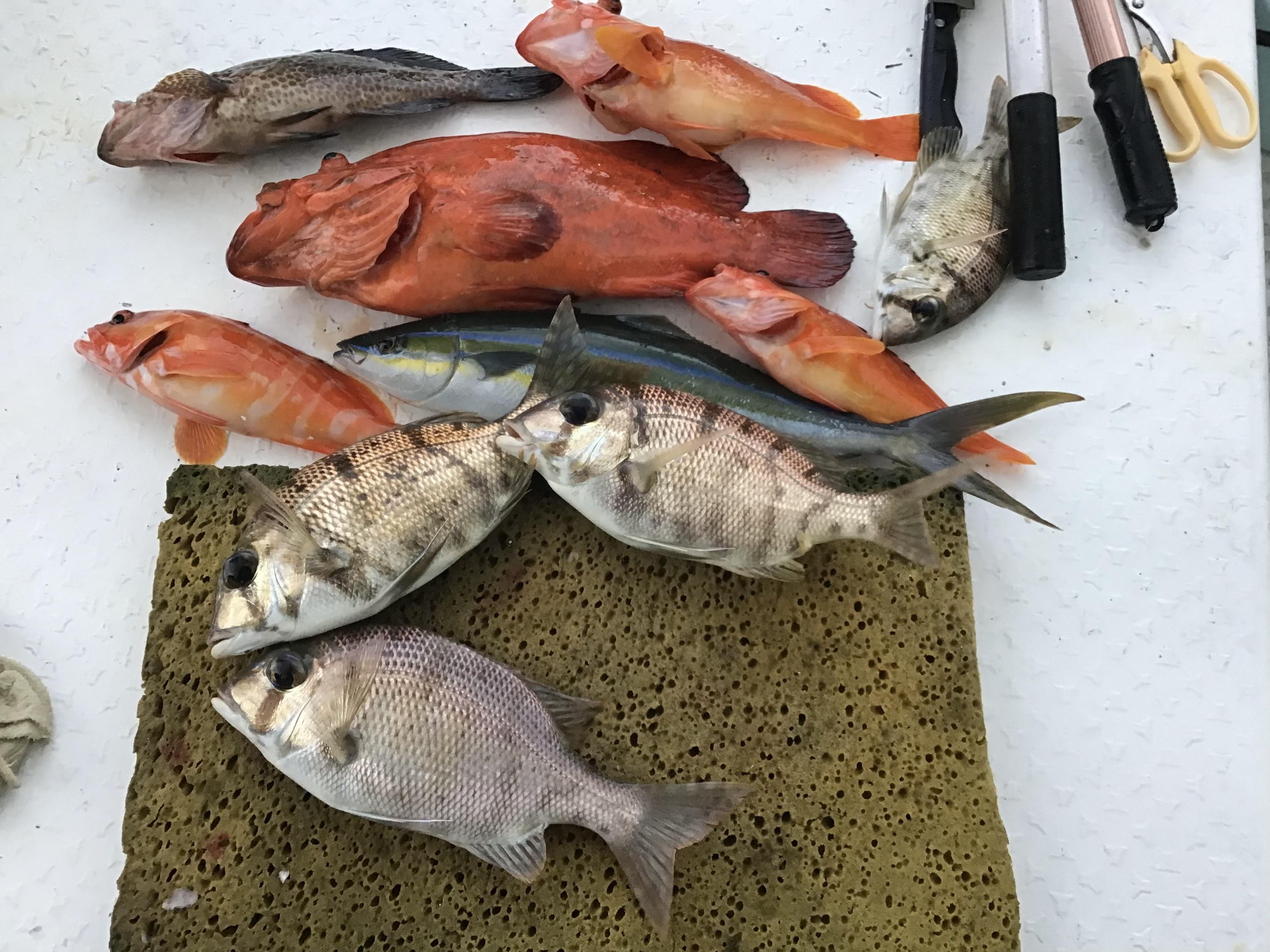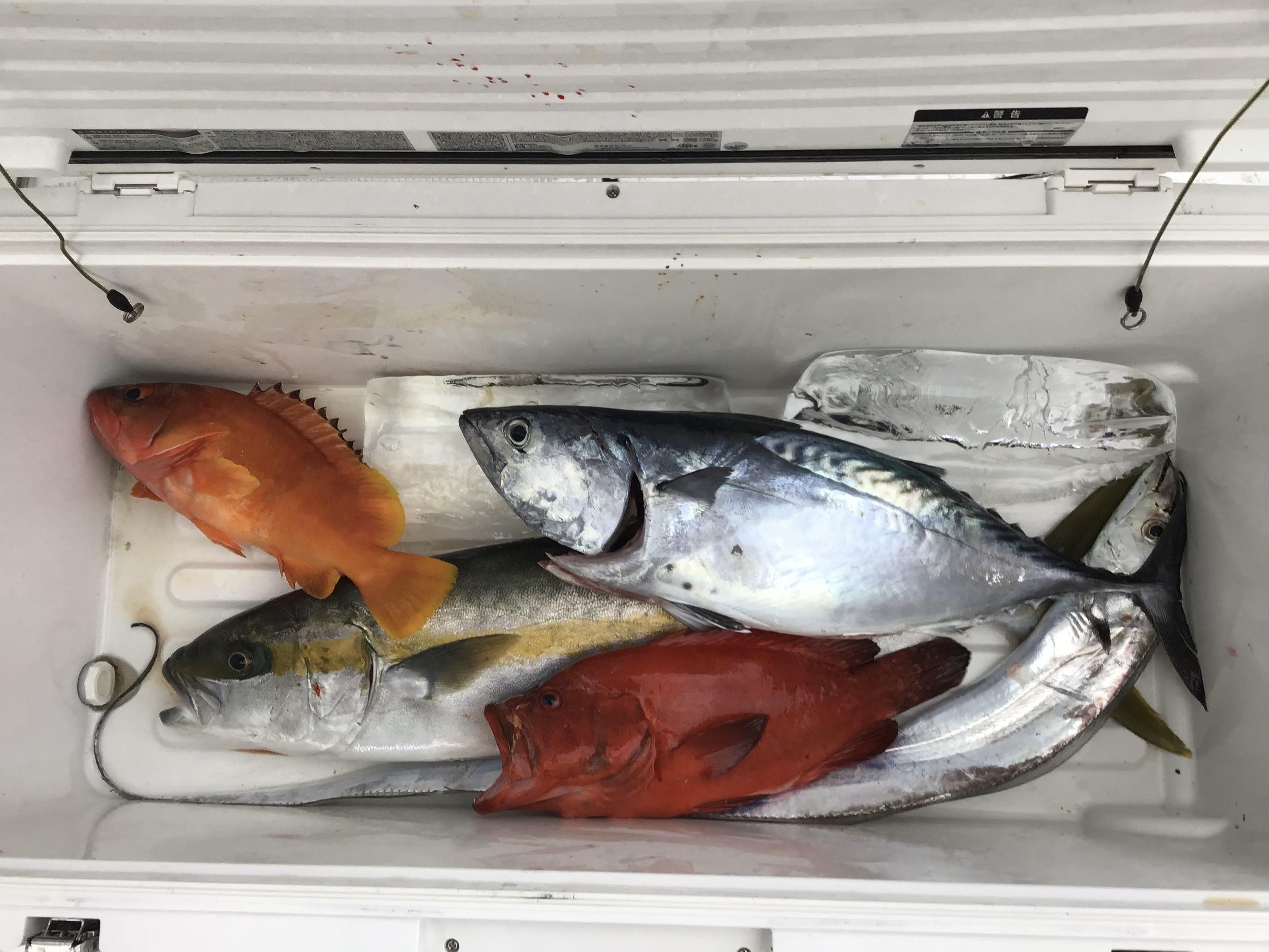 昨日も予報が当たるのか心配でしたが、うねりは小さくなっていました。沖に出ると風波が結構ありましたが、やれるうちにと思い、沖の沖に出ました。ベイト反応があり、ツンブリにヤイトが数本。しかし、当たりが止まり、風波が太ってきたので、早々に沖の瀬まで避難。沖の瀬は不発だったものの、そのちょい沖のポイントで良型アザハタの当たり。その後、竿先が絞り込まれる当たりがあり、ドラグも緩めということで、ラインが出ますがそれほどでもない感じ。オジサンのデカ版でなければいいがと思っていると、何と見えてきたのは、胸びれや尻尾が黄色い青物。良型ツンブリかと思いきや、取り込んでみると70センチ程のヒラマサでした。アングラーさんがやり取りの最中に「おお〜」とか「ワー」とか「もうやめてくれ〜」とかおっしゃらないので、タモ網を持ちながら油断していましたが、見事なヒラマサに驚かされました。ここではアカハタやクロテン、メイチダイも次々にヒット。さらにポイントを移動すると今度は50センチ弱の頭のでっかい迫力満点のアザハタ。間違いなく本船のランカークラスでした。その後も転々とポイント移動を繰り返し、最後は風波を避けて近場へ避難。何とここで、本船では珍しいタチウオもヒット。ここで終了となりました。写真は4名様フルの釣果です! ![]() ![]() ![]()  |