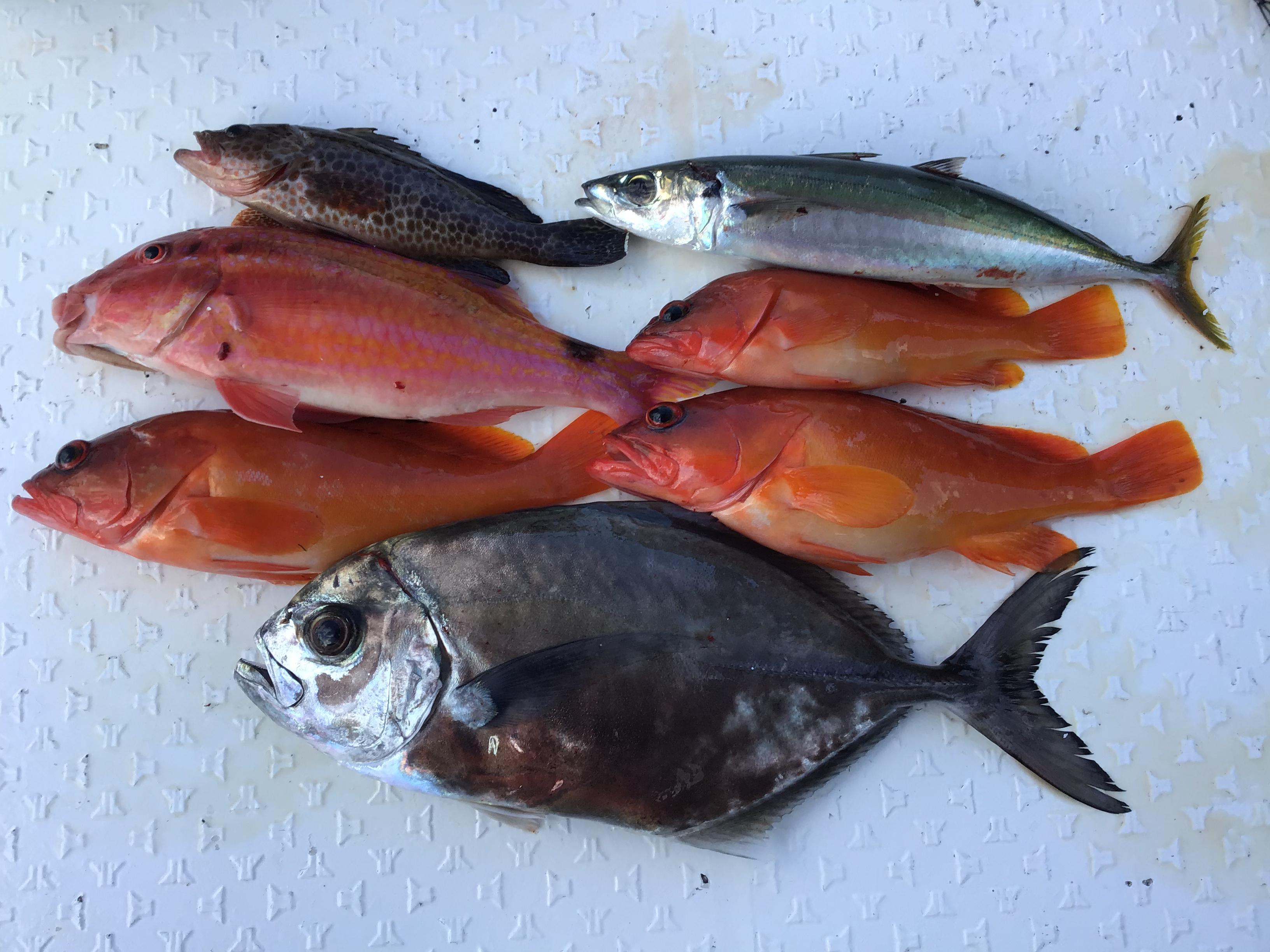 昨日はお二人様チャーター状態での出船でした。昼前から強風予報のため、朝イチで沖に出ました。先日の10分間4枚ポイントに行きますが、反応なし。厳しい状況の中、さらに沖へ。するとジギングで、ようやくいい当たり。水深30メートル程ですが、真下にグングンと竿を絞りこみます。カンパチかと思いましたが、上がってきたのは沖アジ。その後も、タイラバでアカハタなどが次々にヒット。さらにはジギングでツンブリ。何とか、後半戦にお土産をゲットして終了となりました。写真は午前ハーフ釣果です。 ![]()  |