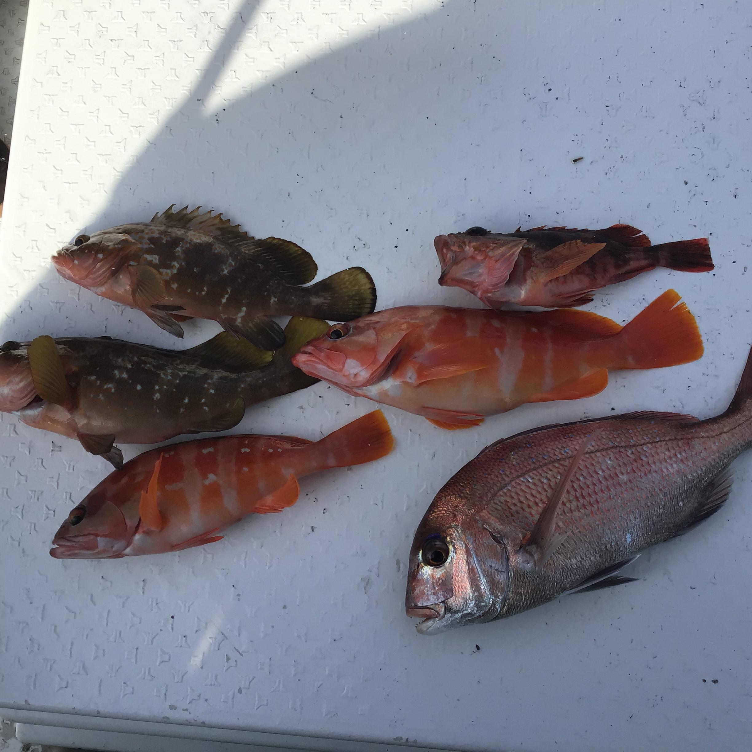 昨日は予想通り風波があり、近場勝負となりました。強風に耐えて釣り開始。すると、重量感のあるいい当たり。かなり良型の根魚かと思いましたが、上がってきたのは、良型アカハタと良型アラカブのダブル。その後、当たりもなくさらに近場へ。ジギングでは全くバイトなし。ただ、タイラバでは「拾い釣り」という感じでした。小ぶりなタングステンの赤黒いタイラバに、50センチ弱のマダイやキジハタなどが喰ってきて、終わってみれば、写真のような美味しそうなお魚ゲットとなりました。午後の部は強風予報のため、中止しました。写真は午前ハーフ、お一人様の釣果です。 ![]()  |