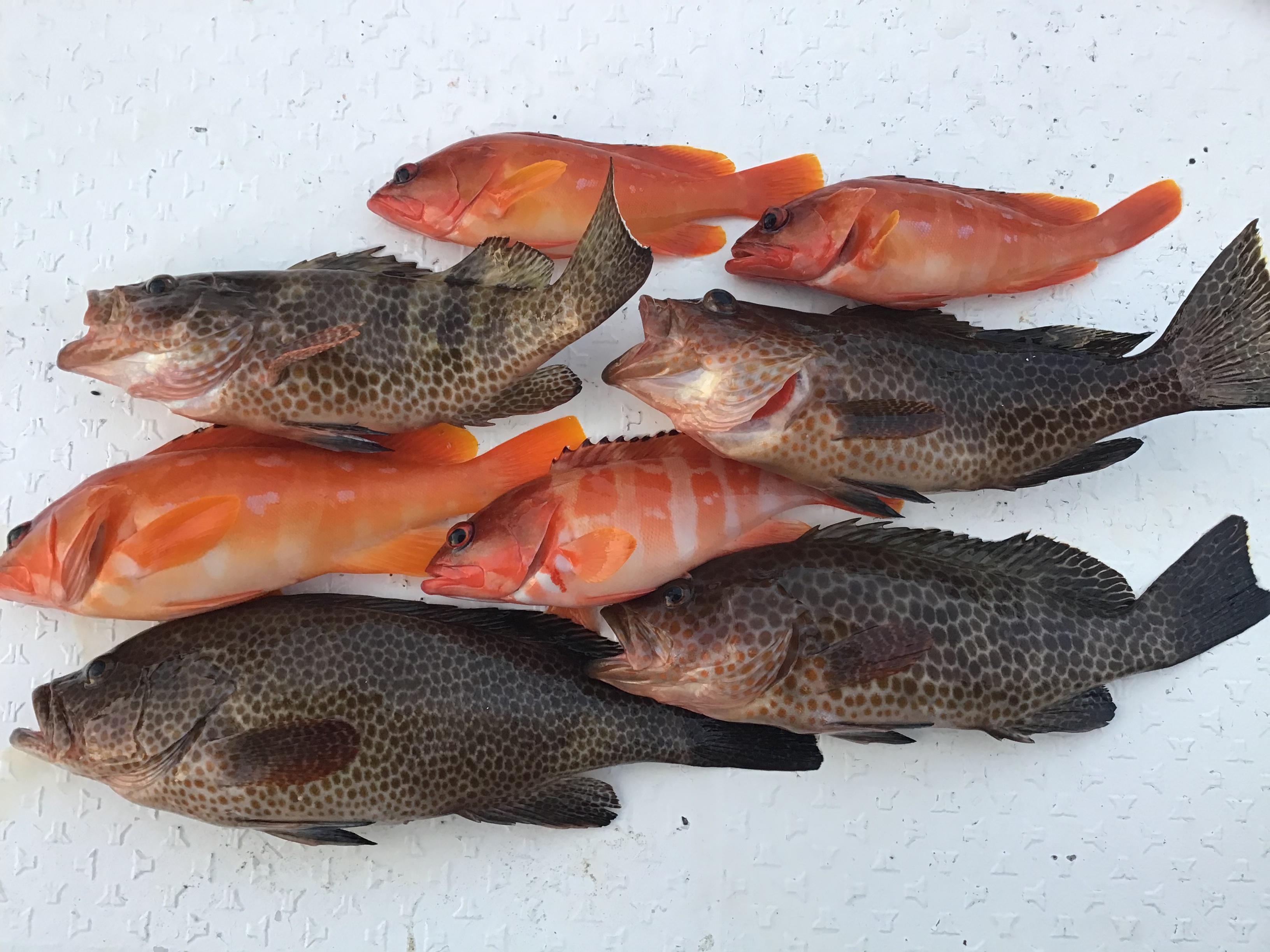 昨日は多少の風波の中、やれるうちにと思い、一気に沖の沖へ向かいました。予想通りすんごいベイトの激アツ反応が続きますが、なかなかバイトがありません。そんな中ようやくヒット。やり取りを開始すると、すっと軽くなり、ジグを上げてみると、針が折れていました。今度はタイラバ仕掛けのアングラーさんにヒット。重量感のある引きでしたが、お気に入りのタイラバごと持っていかれました。喰わせた直後から、「獲れる気がしなかった」とのこと。その後、風波も大きくなり、近場に向けて転々とポイントを移動。ベイト反応があってもなかなかバイトが無いという状況でした。結局、午前中はノーフィッシュに終わってしまいました。少ないチャンスで、どう仕留めるかといった感じでした。午後からはお一人様チャーター状態で、別の瀬に。こちらはベイトの反応がほとんどないのでタイラバ勝負。すると一流しで、アカハタ連発。ポイントを変えると今度は40センチオーバーなど、良型のオオモンハタ連発。アカハタ、オオモンハタのハタハタ祭りとなりました。 ![]()  |