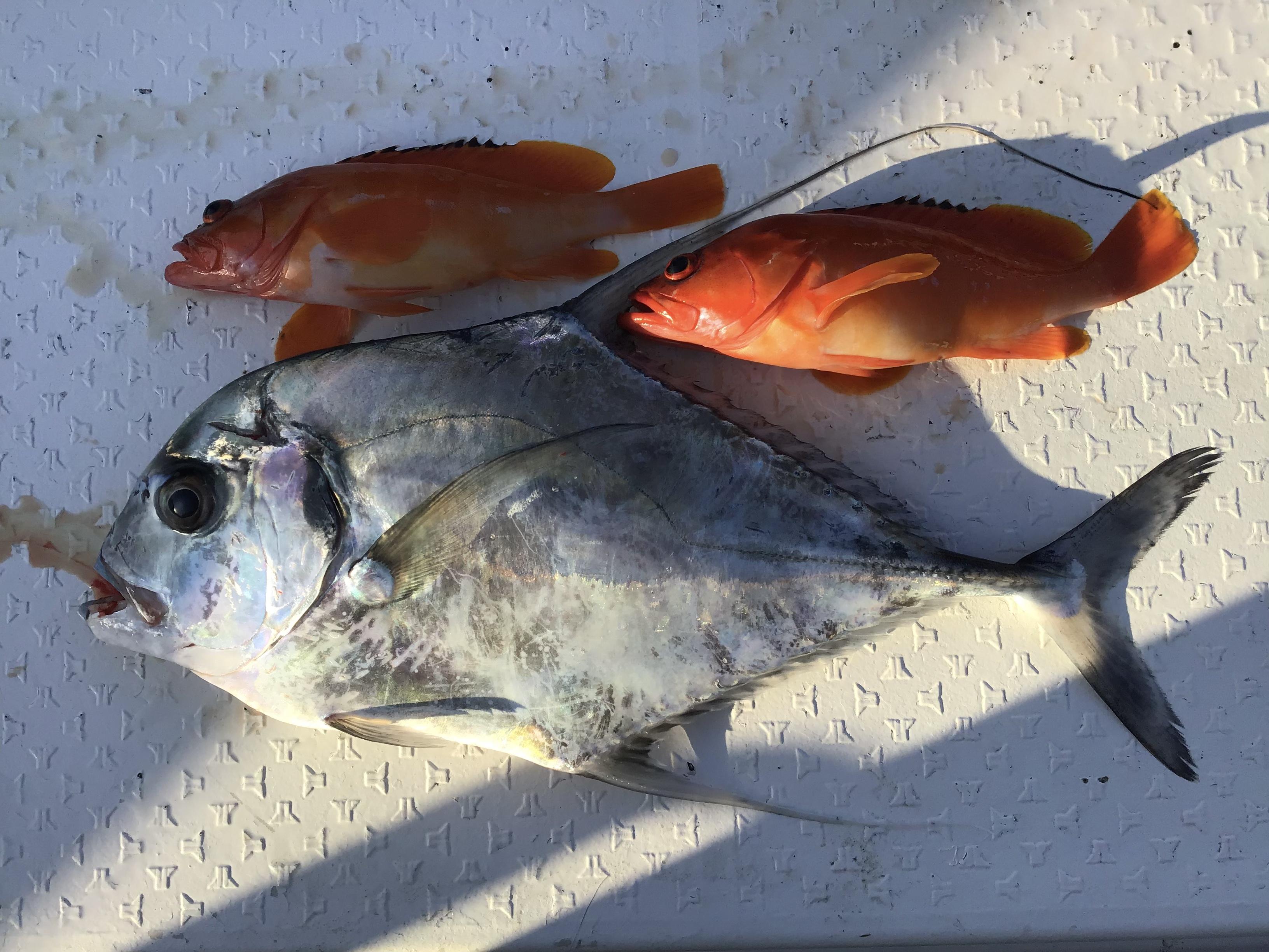 昨日は、昼前から風が落ち着いて予報だったので、超遅出で出船しました。初めは、近場で様子見の釣り。マダイ、キジハタを狙いますが、お目当てのポイントには、漁師さんが仕掛けを入れておられ、仕方なくその周辺を流しました。するとジギングでいい当たり。竿先を海中に何度も絞り込みますので、もしやカンパチ?と思いましたが、最後はクルクルと回りながら上がってきました。「回ればイトヒキ」なのですが、例外ではありませんでした。イトヒキアジは、釣れてもあまり喜ばれないお客様もおられますが、2日くらい寝かせて刺身にすると、甘みがあって、とっても美味しい魚です。60センチ弱の良型の個体でした。その後、風がおさまり沖に出ました。波もなく風はそよ風、天気も最高の釣り日和になりました。すると激アツ反応が連発。残念ながら青物は出ませんでしたが、良型アカハタを2枚仕留め、終了となりました。やっぱり、海は気持ちいい。最高ですね!写真はお一人様チャーター状態での、お昼ハーフ?の釣果です! ![]()  |