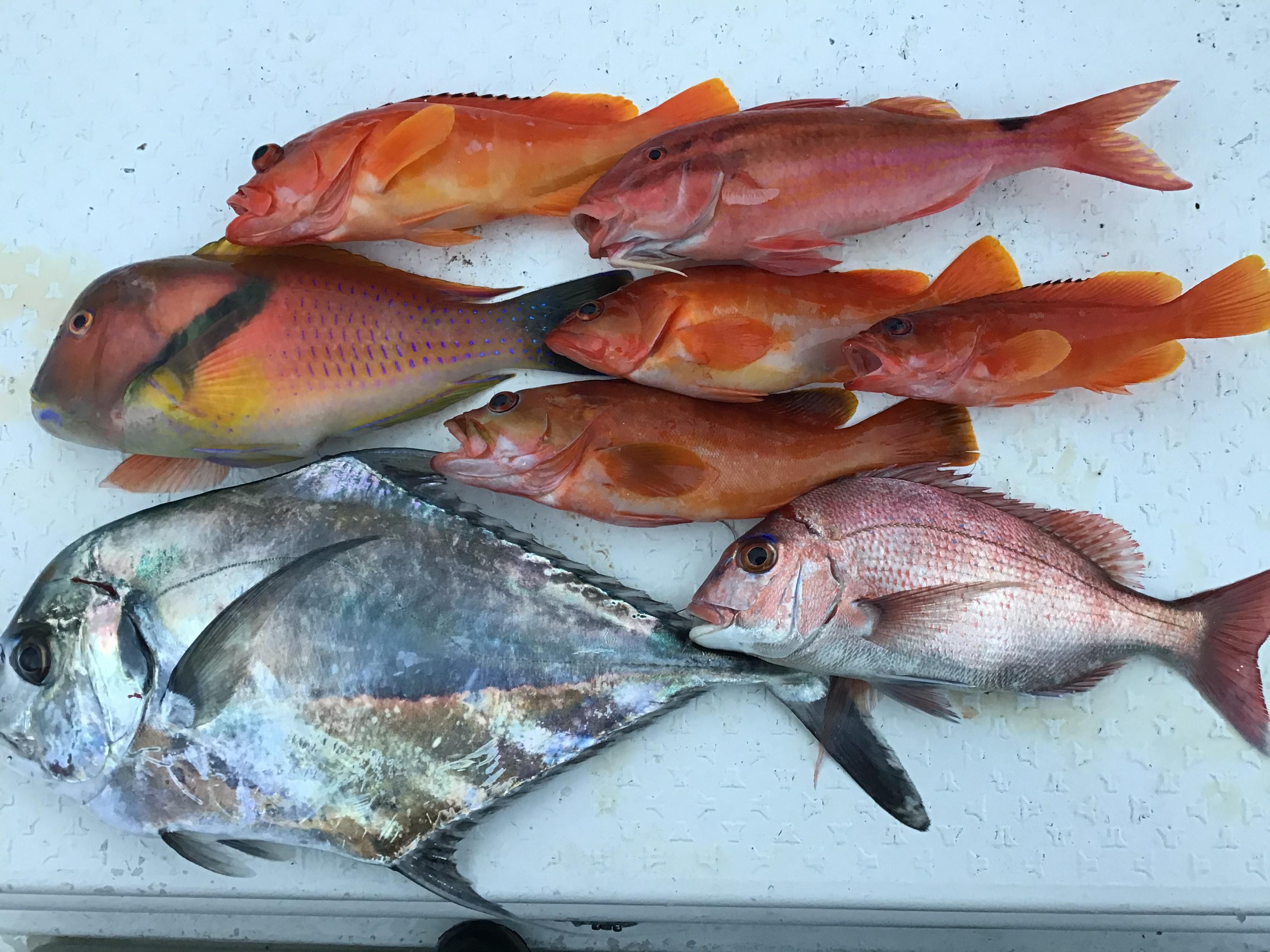昨日は風波があり、沖の瀬の手前までしか出れませんでした。一流し目で35センチオーバーのアカハタを仕留め、すぐに撤退。近場での様子見となりました。するとタイラバで35センチ程のマダイをゲット。午前中はこれで終了となりました。午後は風がおさまり、沖の沖へ。タイラバやワーム付きの落とし込み仕かけで、アカハタやオジサン、イラなどが次々に釣れました。ジギングではいい当たりがありましたが、上がってきたのは、60センチオーバーのイトヒキアジ。連チャンモードに入らず、終了となりました。ナブラも見られたので、風がおさまれば、キャスティングなどで楽しめるかもしれません。 ![]() ![]()  |
