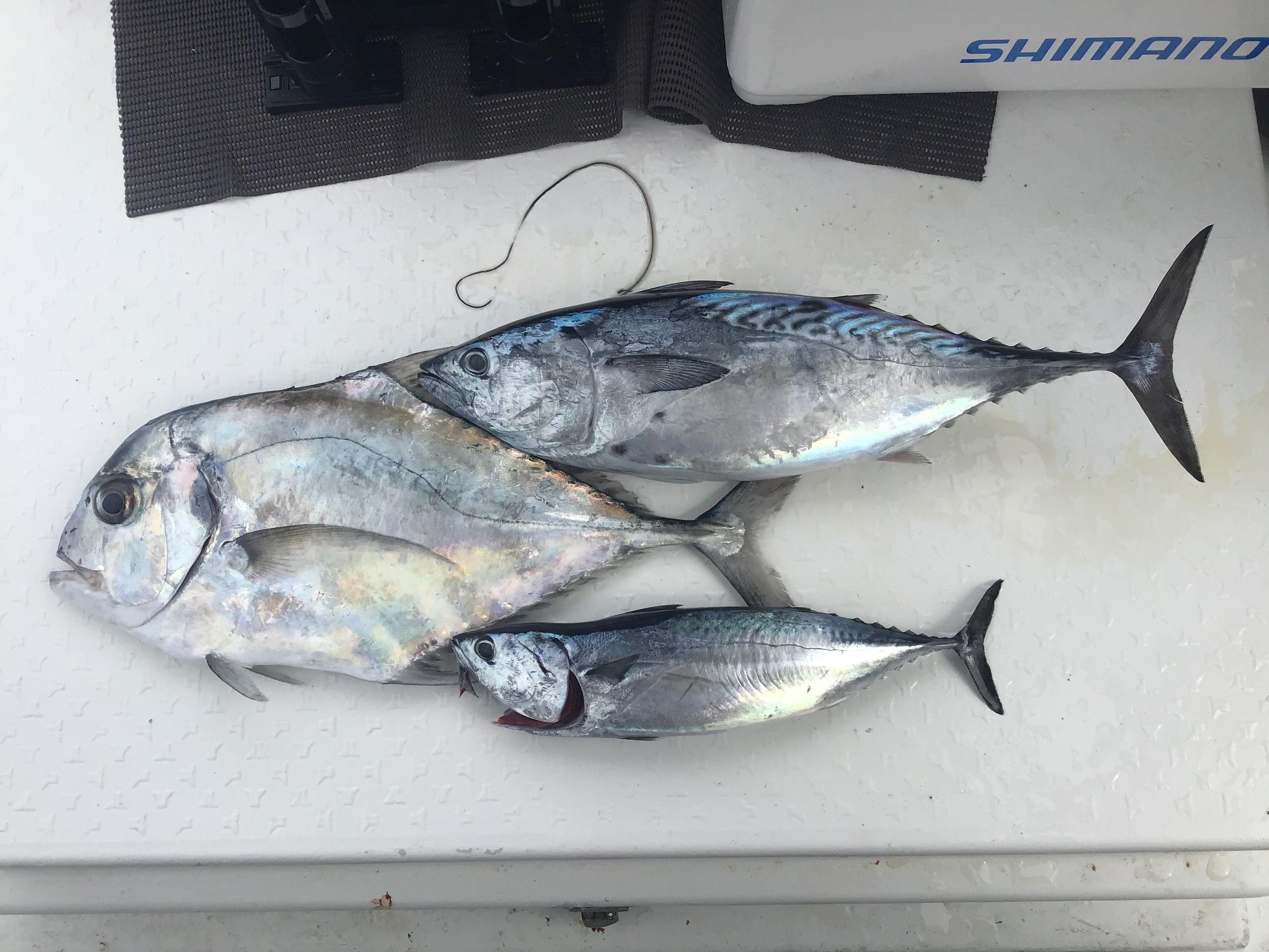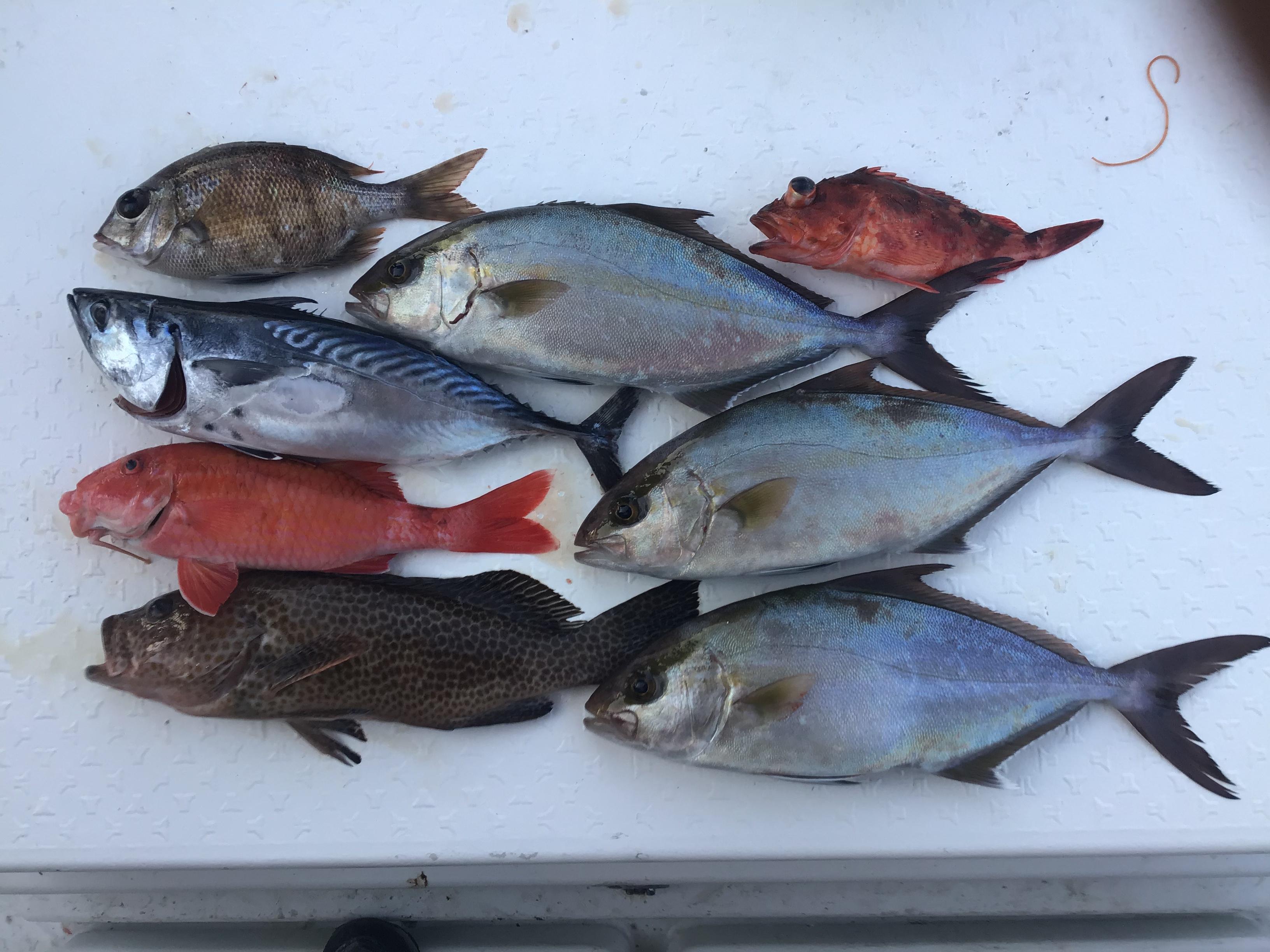 昨日はうねりもなく、弱い風で絶好の釣り日和かと思いきや、沖からのうねりと岸からの風波でグチャグチャの海でした。ただし、悪くなる予報はないので、いつものパターンを変えて、沖の沖からスタート。すると早速いい当たり。竿先を絞り込むのはイトヒキアジでした。その後、続けてヒット。今度はヤイト。さらにソーダガツオ。またまたいい当たりでやり取りが続きます。上がってきたのは50オーバーのヤイト。波が結構大変なのでポイントを移動。そこでもいい当たりが出ましたが、フックオフ!ここで午前ハーフ終了となりました。午後は、沖の瀬を中心に攻めて、メイチダイやアラカブ、オジサンなど。デカバンにラインを引きちぎられることもありました。その後、着底直後にいい当たり。カンパチかと思いきや、上がってきたのは40センチ程のオオモンハタ。「あっ、後ろから何かが追いかけてきている。」見えてきたのは、一瞬サメの頭かと思いましたが、姿を現したのは、何とミズイカ。2、3キロはありそうな大物。浮いたオオモンハタに抱きつこうとしたところを、動揺していたのでしょう、足から掬おうとして、あっけなく逃げられてしまいました。「イカは頭からだろう‼︎」と後悔するも、時、既に遅し! ミズイカはゆっくりと海中に戻っていったとさ! ただ、「アオリ、デカッ!」とか言って、船内は盛り上がりました。ここで終了時刻。ラスト一流しのコールをした後、いきなり激アツ反応が!「激アツ、ラストチャンス」の声と同時に「のった」の声。すると、とものお客さまからも「キタ〜」。ネリゴです。タモ入れが間に合わないところに、前のお客様が連続ヒット。あっという間に、3匹のネリゴを追加し、終了となりました。私がいうのも何ですか、見ていて楽しい1日でした!写真は上が午前ハーフ1名様、下がフルと午後のお客様お二人分の釣果です! ![]() ![]()  |