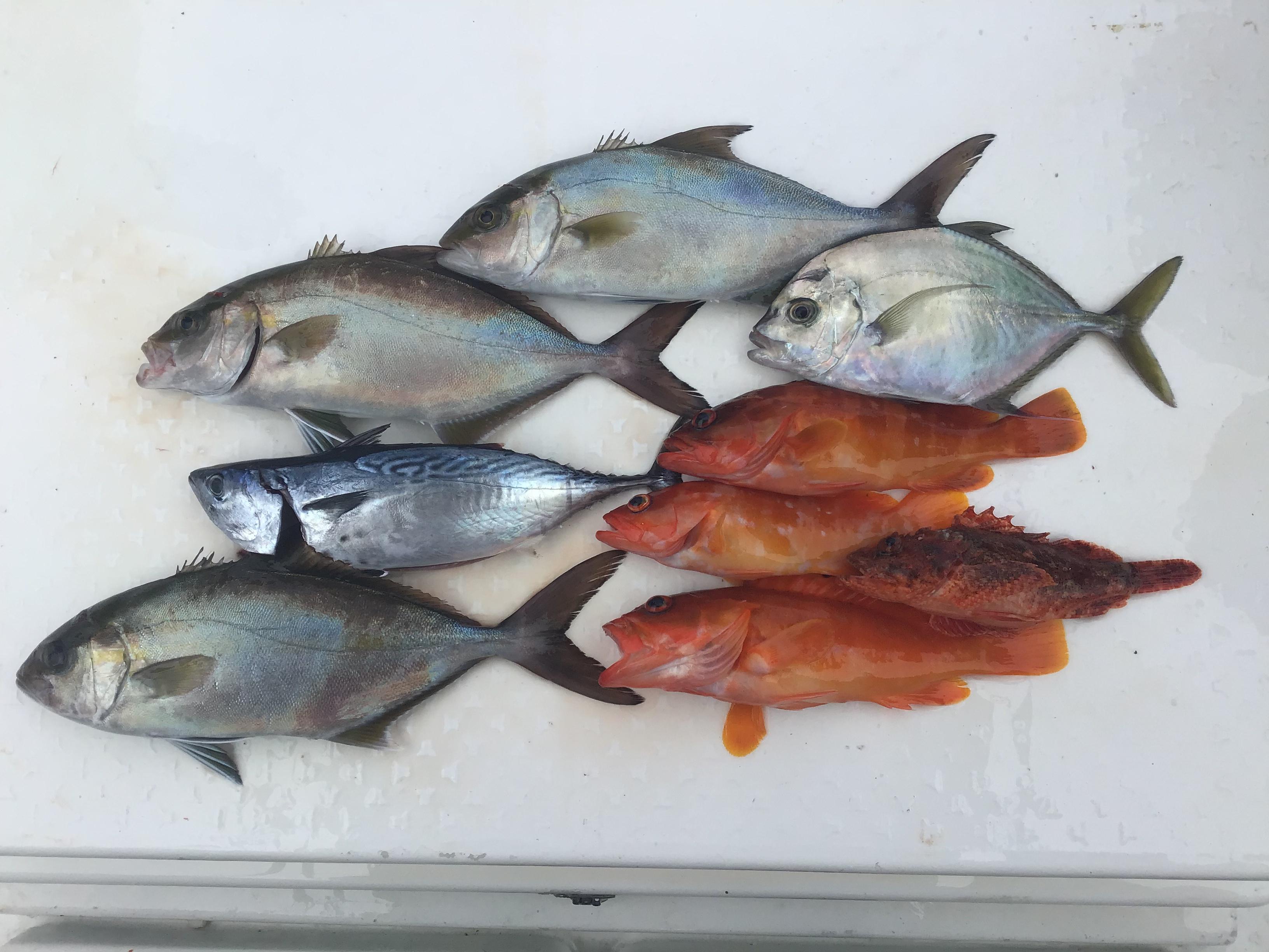 昨日は、強風予報のため、午前ハーフのみの出船でした。ところが、予報と異なり、朝から結構な風があり、沖の瀬までが精一杯。風波に揺られながらも、早速ヒット。暴れ回って上がってきたのはヤイト。その後、竿を海中に絞り込み、最後までクルクル回ることなく上がってきたのは、40センチ程のネリゴ。同じポイントを繰り返し攻めて、同型ネリゴを2匹追加。いずれも単発で同時ヒットがありませんでした。その後は、タイラバにも触ってこない、渋い状況に。終了前に、ポイントを変えるとアカハタやアラカブが喰ってきて、何とかお土産ゲットという感じでした。先週から水温が2度程上昇していますが、ネリゴの顔を見れるようになったのは、ちょっといい兆しかなと思っています。写真は3名様の釣果です! ![]()  |