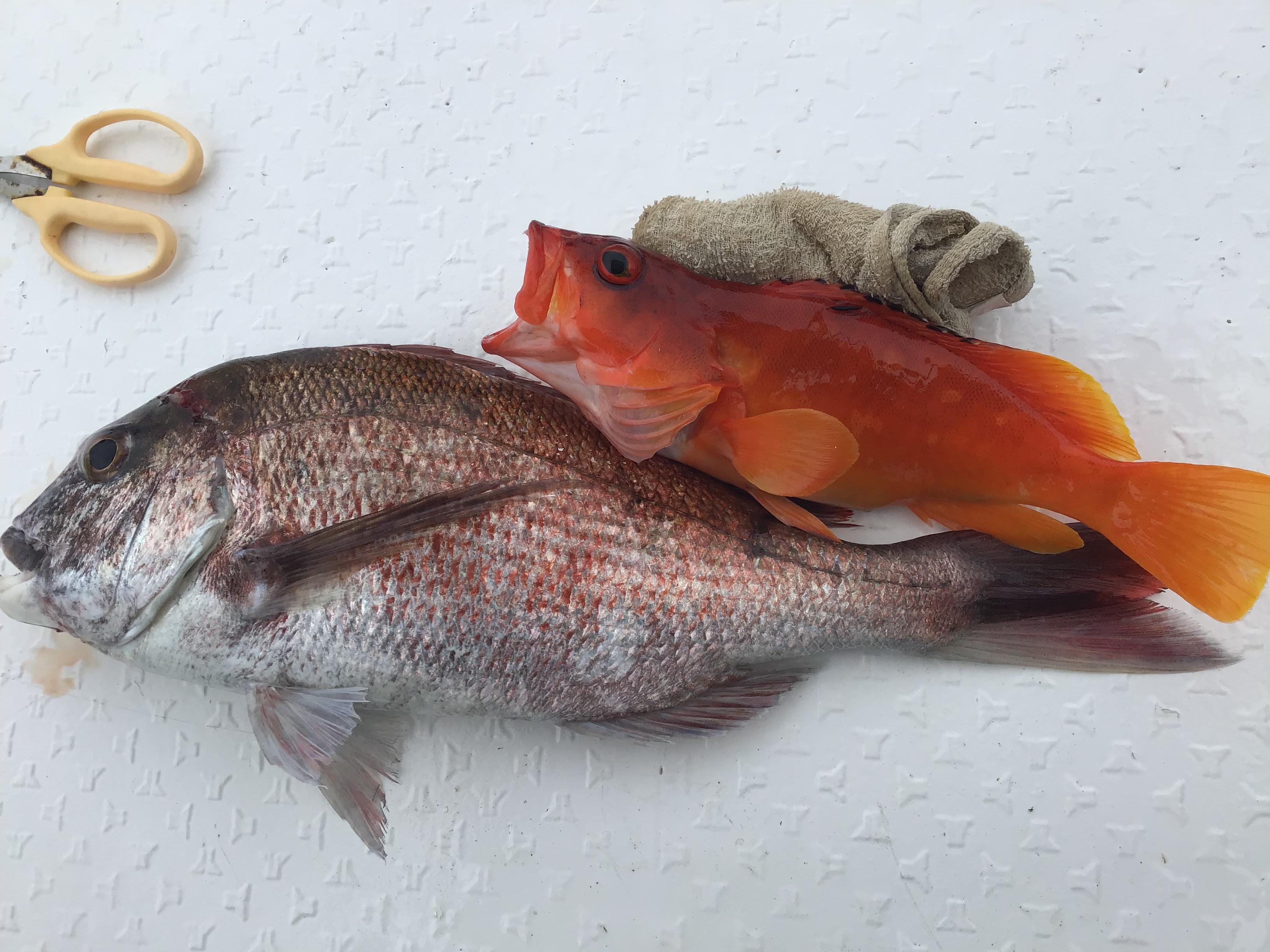 昨日は、複数の予報が分かれていて、波がどれだけ落ち着いたかわからない状態だったので、ダメ元チャレンジ。出船してみると、沖の瀬まで何とか出れました。ベイトの反応もチラチラ出ますが、当たりが出ません。すると、ようやくアカハタがヒット。その後、タイラバにいい当たり。竿先を何度も絞り込みます。上がってきたのは、ピンクの魚体。50センチオーバーの真鯛でした。その後、風が強まり、撤収しながら別のポイントを回りましたが、当たりなし。厳しい釣行となりました。 ![]() |