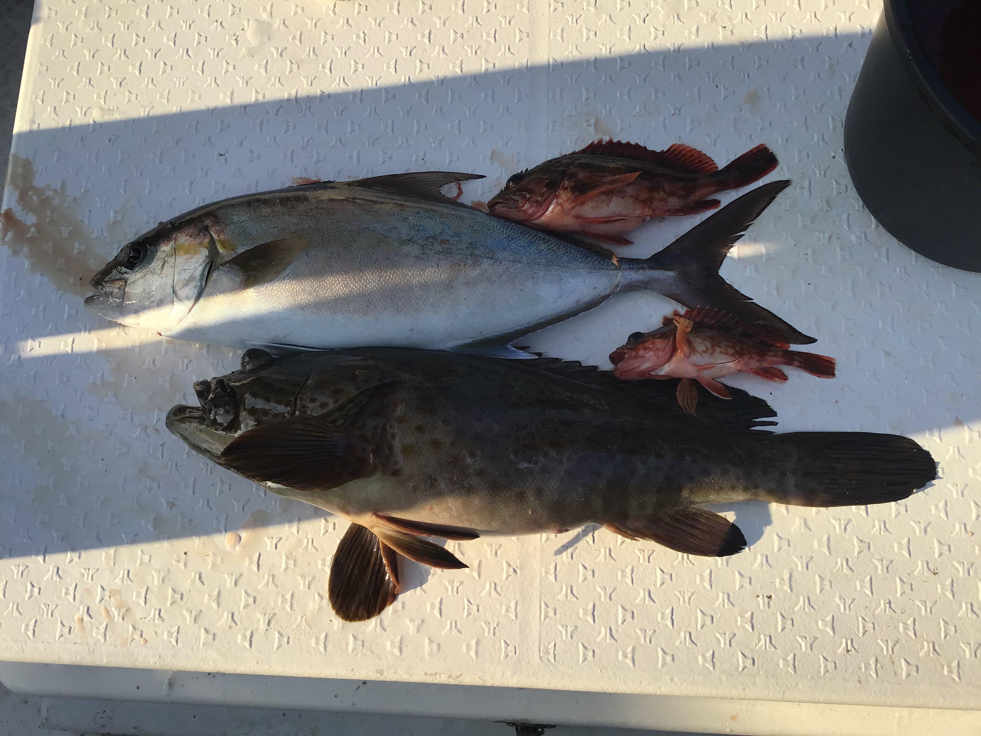 昨日は西からの強風予報のため、午後から近場オンリーということで出船。5名中4名の方が初心者ということでしたが、にぎやかな釣行でした。前日にタイラバでネリゴが当たっていたので、期待を持って釣り開始。すると、ともで釣られていたアングラーさんに何やら大物が。ドラグを緩めにセットしていたので、なかなか姿が見えません。ただ度々竿先を絞り込み、竿を叩く感じもありました。「こりぁマダイもアリだな!」と思いましたが、姿を現したのは、独特の色合いを持つ魚。64センチ、2、4キロのヒレナガカンパチでした。船内が一気に盛り上がります。その後も、皆さん、時々忘れた頃に当たりが出るものの、ゲットしたのはアラカブのみ。すると、再び、ともで釣られていたアングラーさんにいい当たり。今度は、さっきほどギューギューと竿を絞り込みませんが、重量感はタップリ!これも時間をかけて取り込みましたが、3キロ弱のゴマアラ。ビギナーズラックとはよく言ったものだと感心しました。他のアングラーさんにもいい当たりがありましたが、針バレやラインブレイクで悔しい結果となりました。 ![]()  |