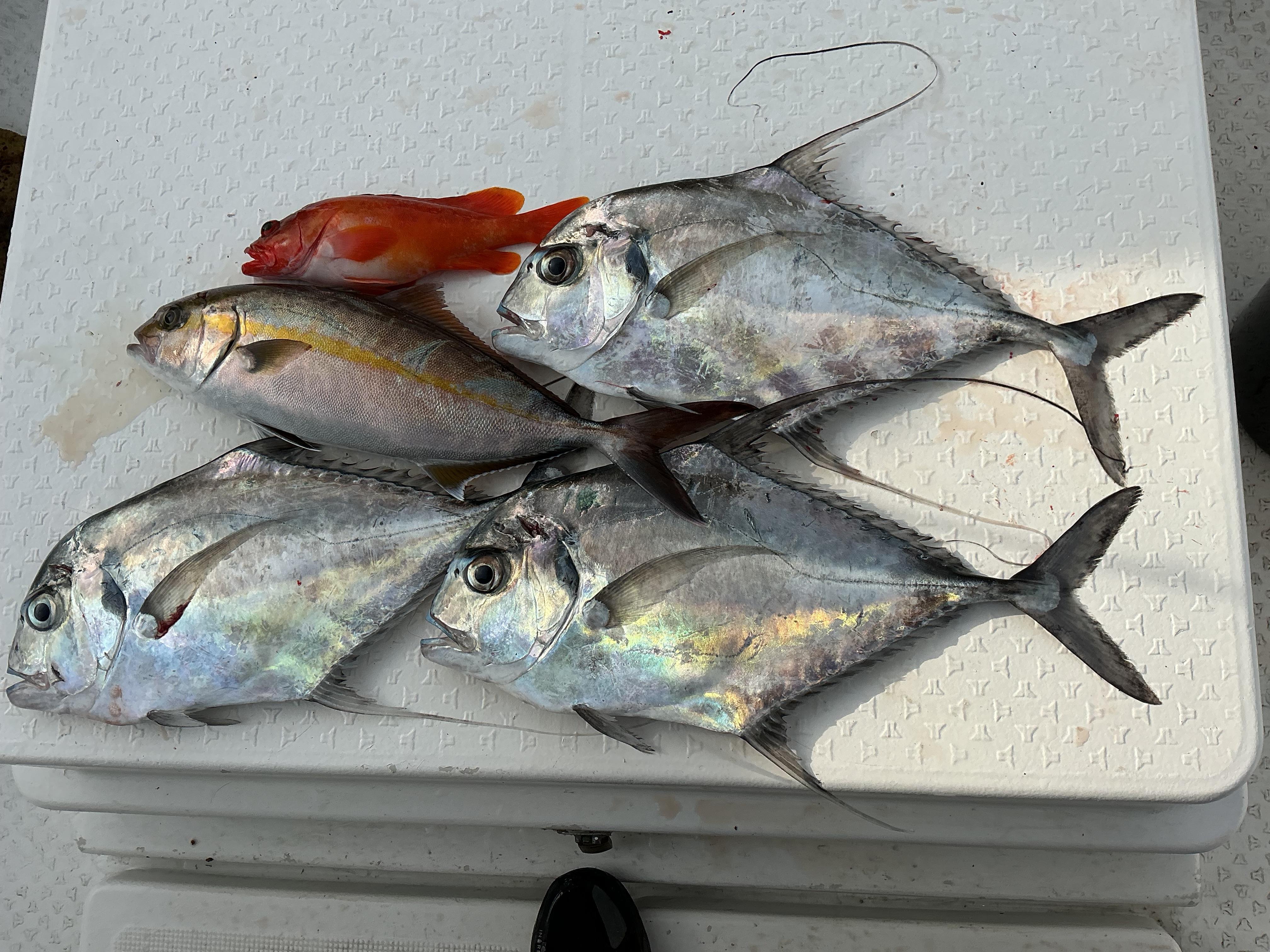 昨日は、午前がタイラバチャーターでの出船でした。潮は上っており、各ポイントでベイトの好反応が次々に現れましたが、なかなか当たってこない状況でした。結局はアラカブ、オジサン、エソという釣果。午後はジギングメインのチャーター釣行でしたが、様子見のポイントでいきなりヒット!竿先を何度も海中へと絞り込みます。カンパチへの期待が高まりましたが、最後はクルクルと回り始め、上がってきたのは65センチ程のイトヒキアジでした。次の流しでも再びイトヒキアジ。更に次の流しでもイトヒキアジ。これまでの不調が一気に回復かと思われましたが、ここまで。さらに沖向かって走っていると、空には美しい七色の雲が!彩雲です。即、撮影。珍しいものが見れてラッキーでした。沖に出ると、今度は1mを超えるウミガメが出現。青々として澄み切った上り潮の中を悠然と泳ぎ回っています。「うわぁ〜でけぇ〜」とみんなで盛り上がっていると、カメが船のすぐ近くまでやってきました。すると、そのカメの下に何かいる!大きさや形が変化するのですが、よく見るとカンパチが20匹ほど、カメの下でワヤワヤと泳いでいるではありませんか。「寄らば大樹の陰」ではなく「寄らば大亀の陰」状態。慌ててジグを落として誘うと、ジグを追ってきますが、残念ながらヒットせず!その後、同じ瀬を攻めていると、来ました、いい当たり。更に食ってきて、ダブルヒット!上がってきたのは50センチオーバーのカンパチでした。もう一本は針バレ。その後もいい当たりがありましたが獲れず。昨日は他の船も釣果に恵まれたらしく、上り潮のおかげで、今後、釣果が上向いていくかもしれません。 ![]() ![]()  |