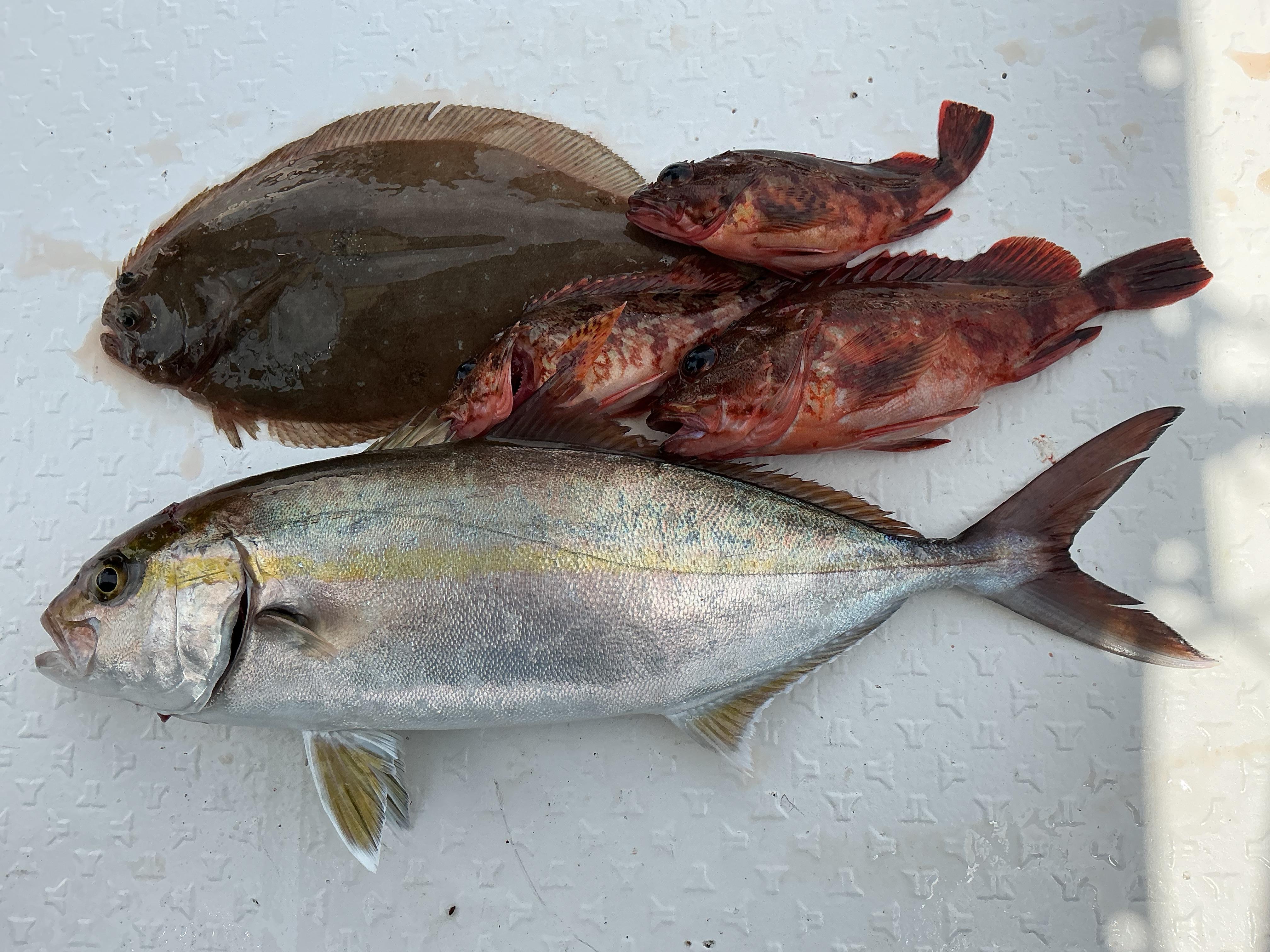 昨日は午前チャーター便で出船。ジギングに初挑戦ということで、どこにいこうか迷ったものの、船酔い対策も含めて、近場で勝負することにしました。ベイトの激アツ反応が続く中、釣り開始。すると、ともの方で釣られていた女性アングラーさんの「うわぁ〜」という声が!これはひょっとしてと振り返ると、竿先が海中に絞り込まれ、戦闘開始状態に!不規則にラインが引き出されていますので、かかっているのは地球ではなく魚であることが分かります。タモを構えて見ていると、一生懸命にリールを巻いているのに、ラインがズルズルずるずると引き出されていきます。もしや「ブリ?」と思いましたが、ようやく魚も疲れが見えてきました。そこから一進一退の攻防。徐々に巻き取り量が増えてきて、ようやく姿が見えてきました。上がってきたのは、うっすらとピンクの入った美しいカンパチ。船内に歓声が上がりました。帰港して計測すると53センチ、メモリアルな一匹となりました。その後はアラカブや美味しそうなガンゾウヒラメをゲット。すると、風波がうねりに変わってきたため、1時間の早上がりとなりました。帰港途中、うねり(危険な状態ではありませんでしたが...)を乗り越えるごとに「キャー」という声が上がり、帰りでも結構楽しまれていたようです。今日でゴールデンウィークが終わりますが、「魚もゴールデンウィークでお休み!」だったように思いました。 ![]() |