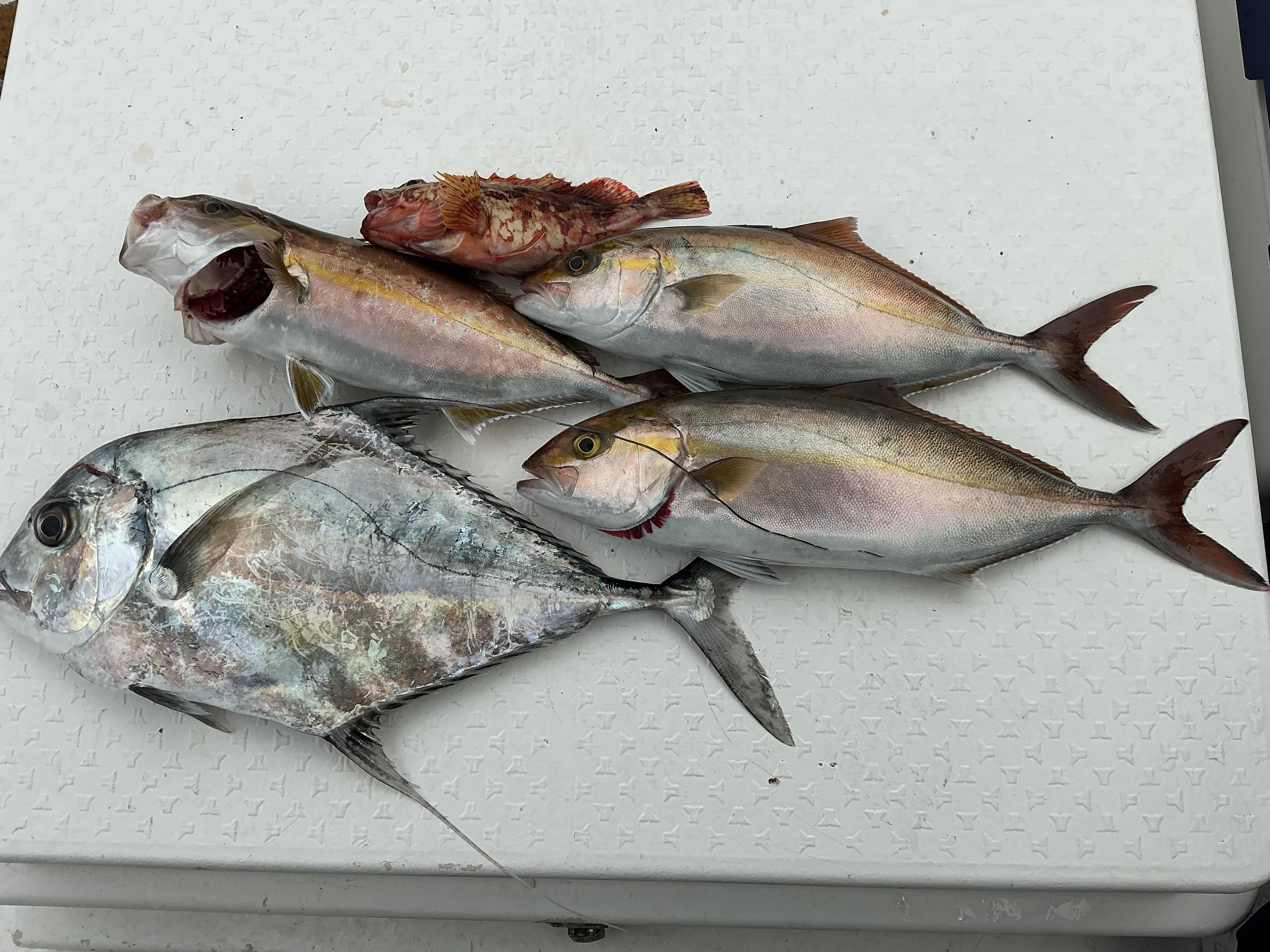 昨日は、風、波が収まり、午前ハーフの出船でした。最近、何とか当たりのある近場で勝負。早速いい当たり。キャスティングをされていたアングラーさんにヒット。ロッドが大きな弧を描いて引き込まれるのが分かります。手前に寄せてくると、カンパチらしい引き。思った通り50センチ程のカンパチでした。その後、他のアングラーさんにもキャスティングでヒット。これもいい引きで、おそらく同サイズのカンパチ。そろそろ見えてくるかなと思っていると、痛恨の針バレ。その後もキャスティングでカンパチ。さらにジギングでもカンパチ。ここで当たりが止まってしまいました。近場を諦めて沖に出ました。するとイトヒキアジの当たり。その後も期待しましたが、西からの風波が大きくなってきて、二流しで即時撤退。その後、近場を攻めましたが、これで終了となりました。 ![]() |