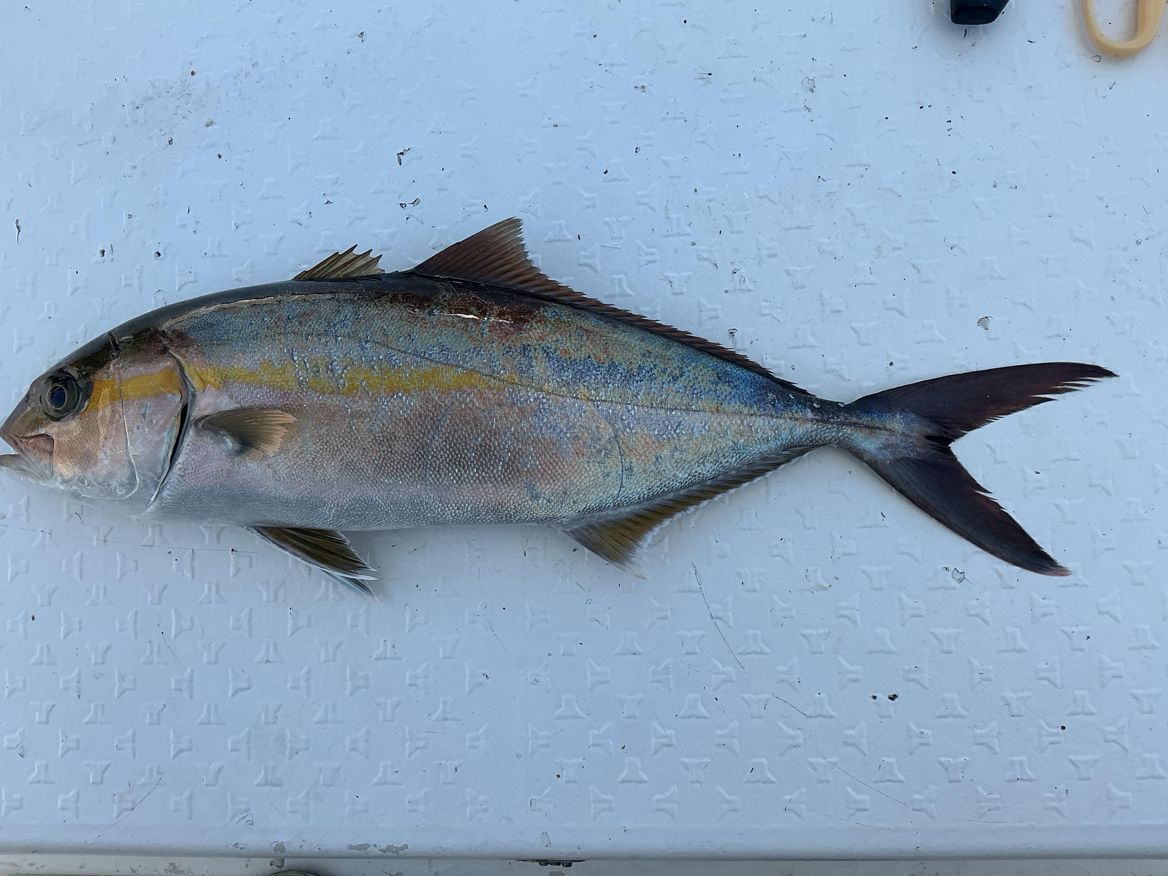 昨日は多少の風はありましたが、波もなく、青空も美しい釣り日和。お一人様チャーター状態での出船でした。一昨日見つけたポイントからスタート。お魚ウォッチングで見つけたカンパチ、オオモンハタが当たった場所でしたが、残念ながら当たりなし。そこで、一気に沖の沖まで出てみました。ベイトの好反応が次々に現れますが、なかなか当たりなし。ここも厳しいと思っていたら、突然、ドラマが始まりました。竿先が海中に向かって何度も何度も絞り込まれます。これはおそらくカンパチ。強烈な引きに耐えながら浮かしてきたのは、予想通り60センチ弱の美しいカンパチ。喰ってきた時はベイト反応が全く出ていない状況でしたが、ベイトの周辺を回遊しているものと思われました。諦めることなく、ジグをしゃくり続けたアングラーさんの腕と根気の勝利でしょうか?その後、連発することなく、これで終了となりました。タイラバではちょこちょこ当たりがあるようでした。 ![]() |