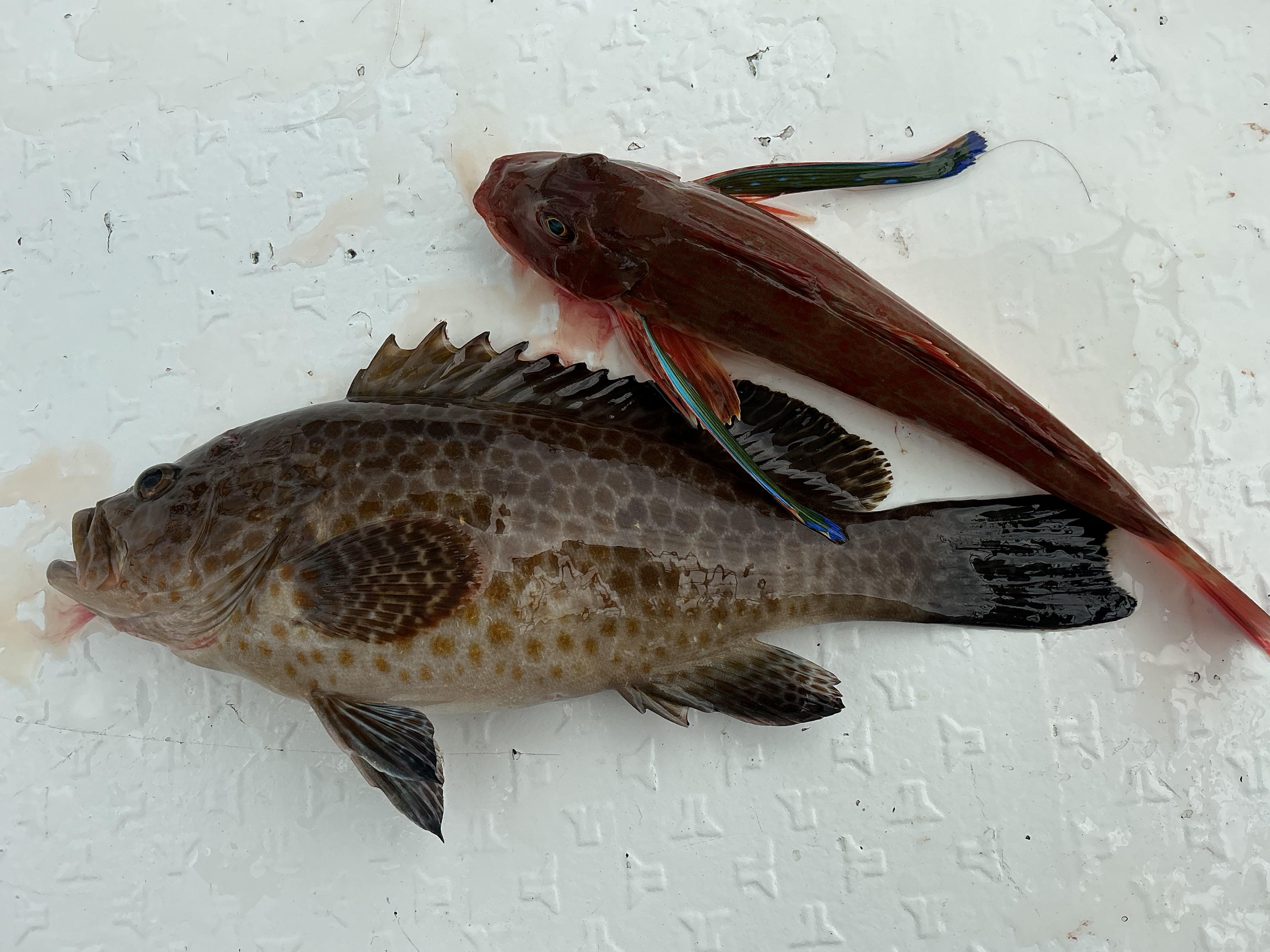 昨日も海は穏やかで釣り日和。お一人様チャーター状態でカツオを狙って沖へ出ました。潮がかなり速く、カツオは、たんまーにバシャっと出る程度。ポッパーを投げますが、反応がありません。ジギングに切り替えてもなかなかバイト無し。粘り強くキャストを繰り返してしゃくっていると、竿先が一瞬で海中に向けて引き込まれました。ラインが一気にすごい勢いで引き出されていきます。慌てて、船で追跡を開始しようとした瞬間、大きく曲がっていた竿がスコンと真っ直ぐに!大物に備えて、14号のリーダーを張っておられたらしいのですが、リーダーの途中からやられていました。ブログには書いていませんでしたが、ここ数日、皆さんやられています。その後も、激流のためか当たりがなく、最後は、近場にマダイ、オオモンハタ狙いに行きました。ここでようやくオオモンハタ、ホウボウをゲット。午前ハーフ終了となりました。 ![]() |