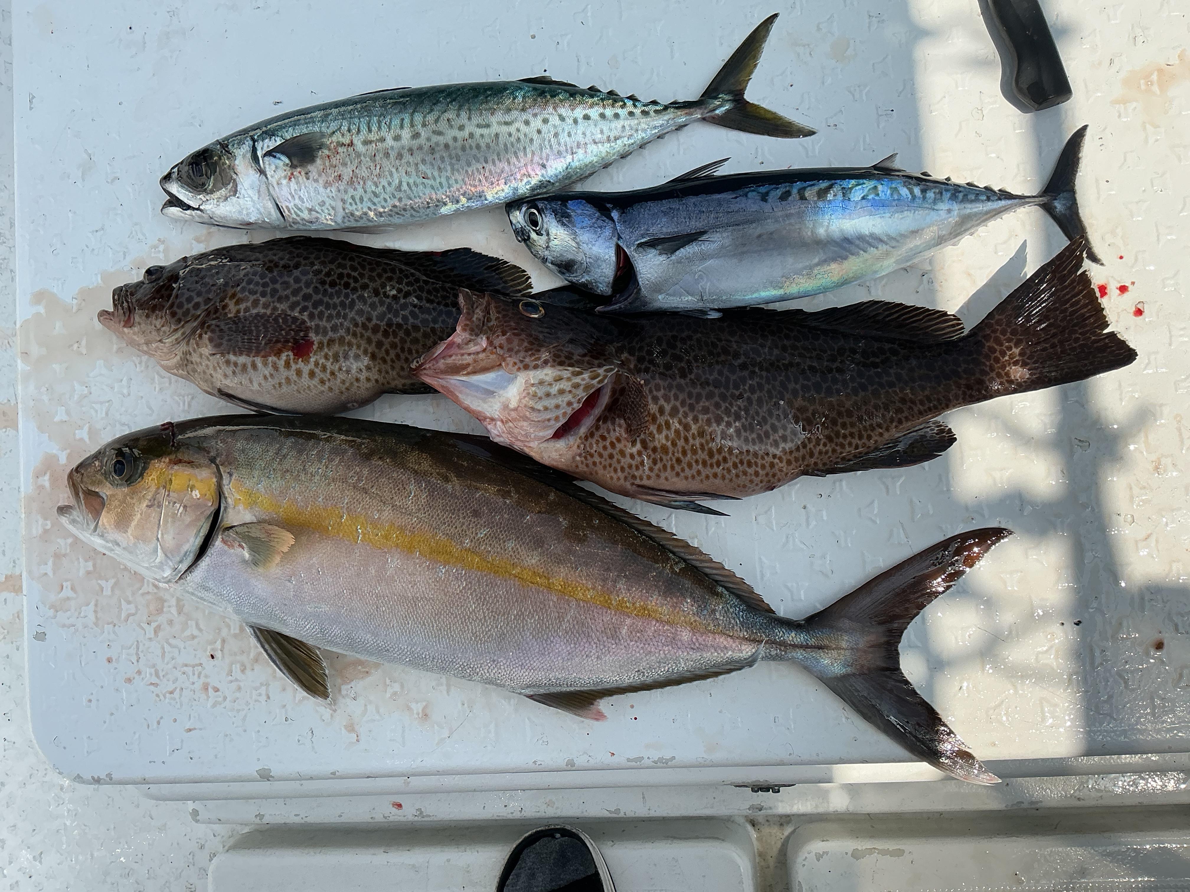 昨日も穏やかな海で、お一人様チャーター状態での出船でした。キャスティングをしたいということで、タックルを新調されての釣行でした。一昨日が、沖で当たらず、近場で何とかお土産確保となったため、まずは近場からスタート。これが良かった!タイラバの上に落とし込み釣り用のサビキのついた仕掛け。ベイトの反応が出ると、サビキにイワシが喰ってきました。これは、なんか喰ってくるかもと思っていると、サビキにベイトがついた後にいい当たり。重量感のある引きで、上がってきたのは40センチ越えのオオモンハタ。さらに、いい当たり。喰った瞬間からドラグ音を響かせ、ラインを引き出していきます。これは、青物。やり取りの末、上がってきたのは60カンパチ。その後、オオモンハタと40センチ越えの丸々としたサバを追加。朝イチでお土産をしっかり確保した後、沖に出ました。一昨日の激流は収まり、程よい速さで上り潮が来ていました。ただ、活気のあるボイルは見られず、キャスティング開始。なかなか当たりが無い中、ようやくマルソーダ。船の近くまで寄せてくると、80センチ程の尻尾の黄色い魚が追いかけてきて、しばらく近くにいましたが、マルソーダの針を外している間に、いなくなってしまいました。初めてのキャスティングでも、獲物を仕留められ、満足されていたようです! ![]() |