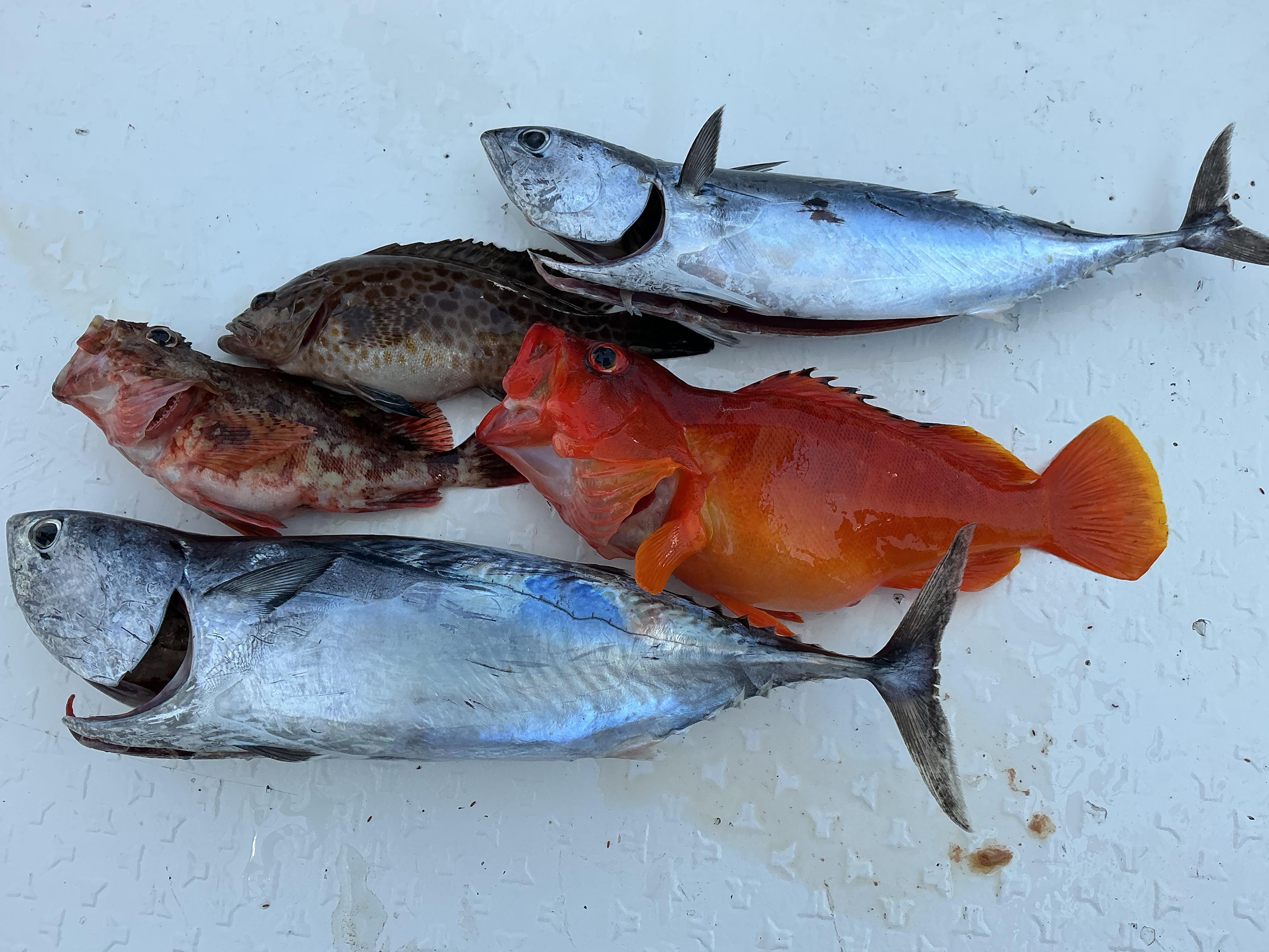 昨日も海は穏やかで釣り日和。土曜日とい事もあり、釣船もたくさん出ていました。一昨日、調子の良かった近場から攻めますが、オオモンハタ1枚のみで、ほとんどバイト無し。たったの1日で良くもなり、悪くもなるというよくあるパターンでした。沖に出ると上りの程よい速さの潮が来ていましたが、ボイルは見られませんでした。そんな中、キャスティングやジギングでヒラソーダの当たり。さらに良型のアカハタやバラハタ、アラカブを追加。海は透明度が非常に高く、青々として惚れ惚れするような美しさ。そんな中ふと海中に目を落とすと、1メートルを超えるオキザワラ。慌ててジグを投げますが、残念ながら反応無し。最近、フォール中にジグだけなくなるということがあり、歯のある魚がいると思っていましたが、オキザワラの仕業かもしれません。引きを味わえないまま、ジグをロスする恐ろしい魚です。さて、潮の速さがちょうど良い感じだったので、沖の沖にも出てみましたが、魚が戻っておらず、ほほノーバイト。釣果を伸ばせず終了となりました。写真は午前ハーフ3名様の釣果です。 ![]() |