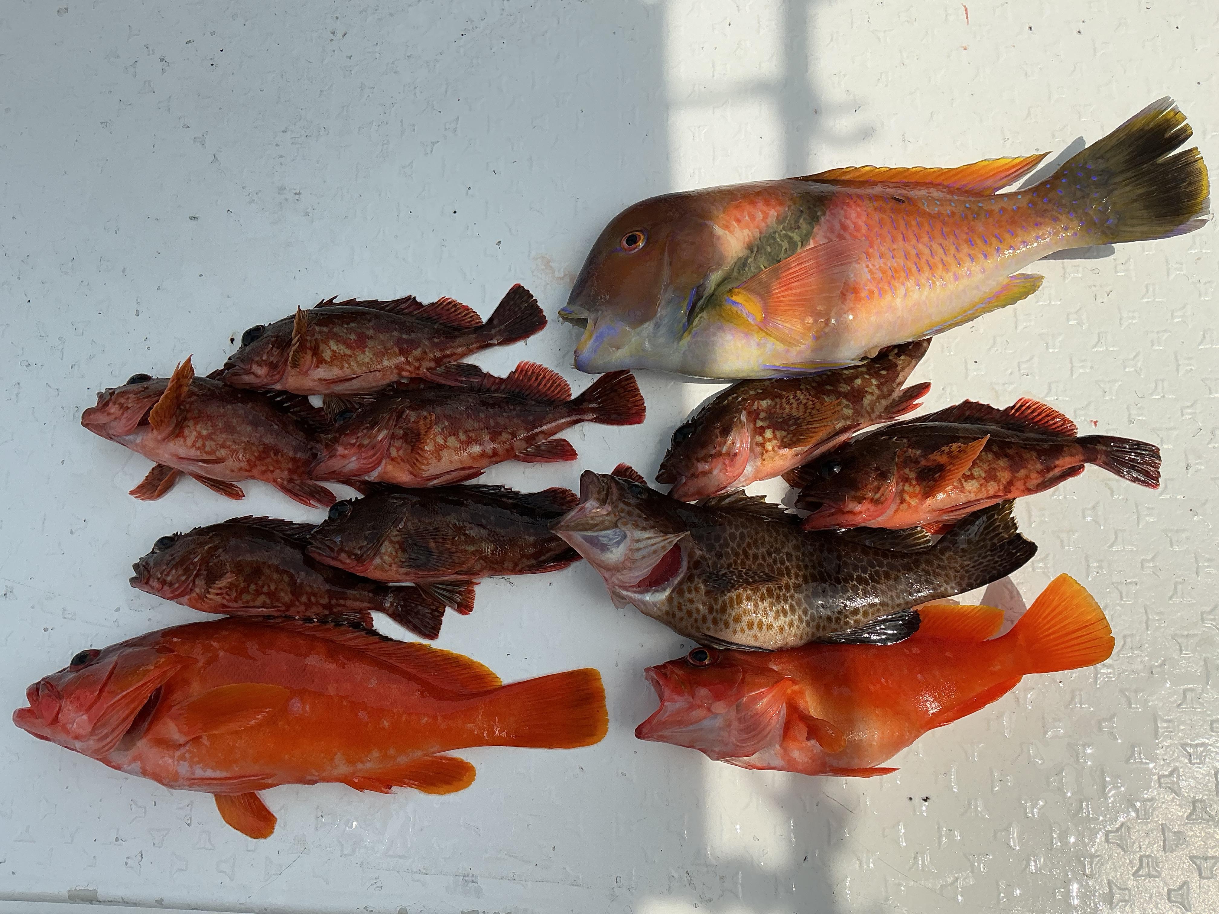 昨日も海は穏やかで絶好の釣り日和。手前から攻めていきますが、潮が動いておらず、当たり無し。沖に出ると、緩やかな潮が来ており、ようやく良型のアカハタやイラ、オオモンハタ。その後、カツオ類を狙いにいきますが、ボイルもなく当たりも無し。ただ、相変わらずメーターオーバーの魚が、時折大きな飛沫をあげて餌を捕食しますが、正体は分からず!その後、浅瀬を攻めると、アラカブが次々にヒット。タイラバ中心の釣行だったので当然ですが、根魚祭りとなりました。写真は午前ハーフお二人様の釣果です。 ![]() |