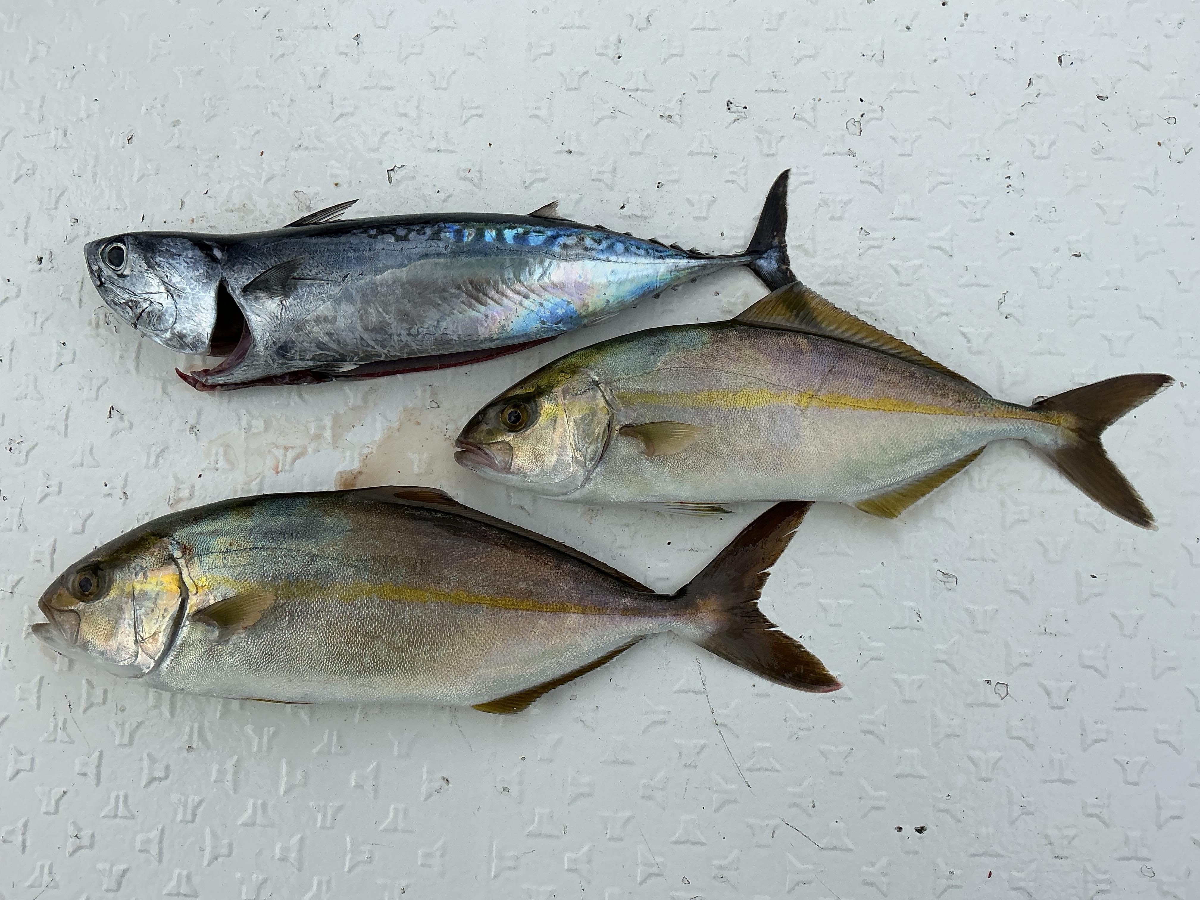 日曜日、午前ハーフで出船しましたが、釣り始めてすぐに本降りの雨。雷レーダーを確認すると、宮崎市内が危険範囲にスッポリと入っており、即中止となりました。昨日も、朝、雷が鳴っていて、出船時刻を変更。雨雲がなくなってから、のんびりと出船しました。ただ、西の強風予報が外れていて、南東からの強風で、風波がかなりあり、比較的穏やかな近場で勝負となりました。結果は写真の通り、何とかネリゴとソーダガツオを仕留め、オミヤ確保となりました。 ![]() |