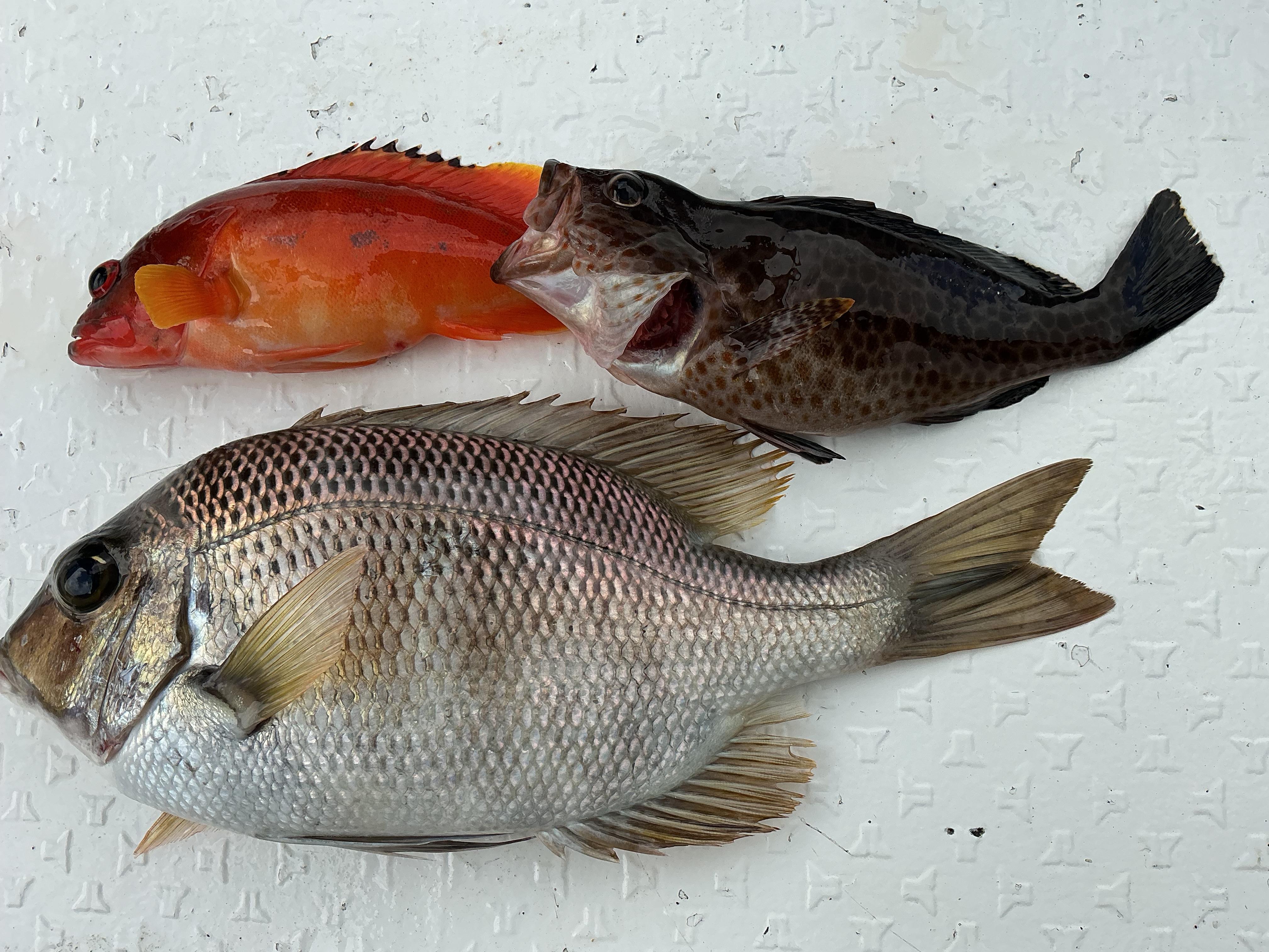 昨日も波があり、ぎりぎり出船可能状態。時折、とんがった波が来るので、沖に向けてどんぶらこ どんぶらこと船を走らせました。先日の雨の濁りが、沖まで達していました。船は風に押されて移動しますが、風向きが変わると船の流れも変わってしまいます。この2つのことから、潮は全く動いていないということがわかります。釣り始めると、当たりが少ない中、ヒット。しかし、瀬取られて全く動かなくなりました。そこで、船をその真上につけて、真っ直ぐに引き上げてみる作戦。すると、作戦成功。上がってきたのは、根魚ではなく、なんと良型のメイチダイ。40センチ弱でメイチダイとしては最大級クラス。幅もあり、こりぁ脂がのって絶対美味しいやつや!その後、オオモンハタ、アカハタを追加して午前ハーフ終了となりました。サメが相変わらずウロウロしているので、「ホエールウォッチング」みたいに「ドキドキハラハラ?シャークウォッチング‼︎」で商売してみようかな?写真はお二人分の釣果です。 ![]() |