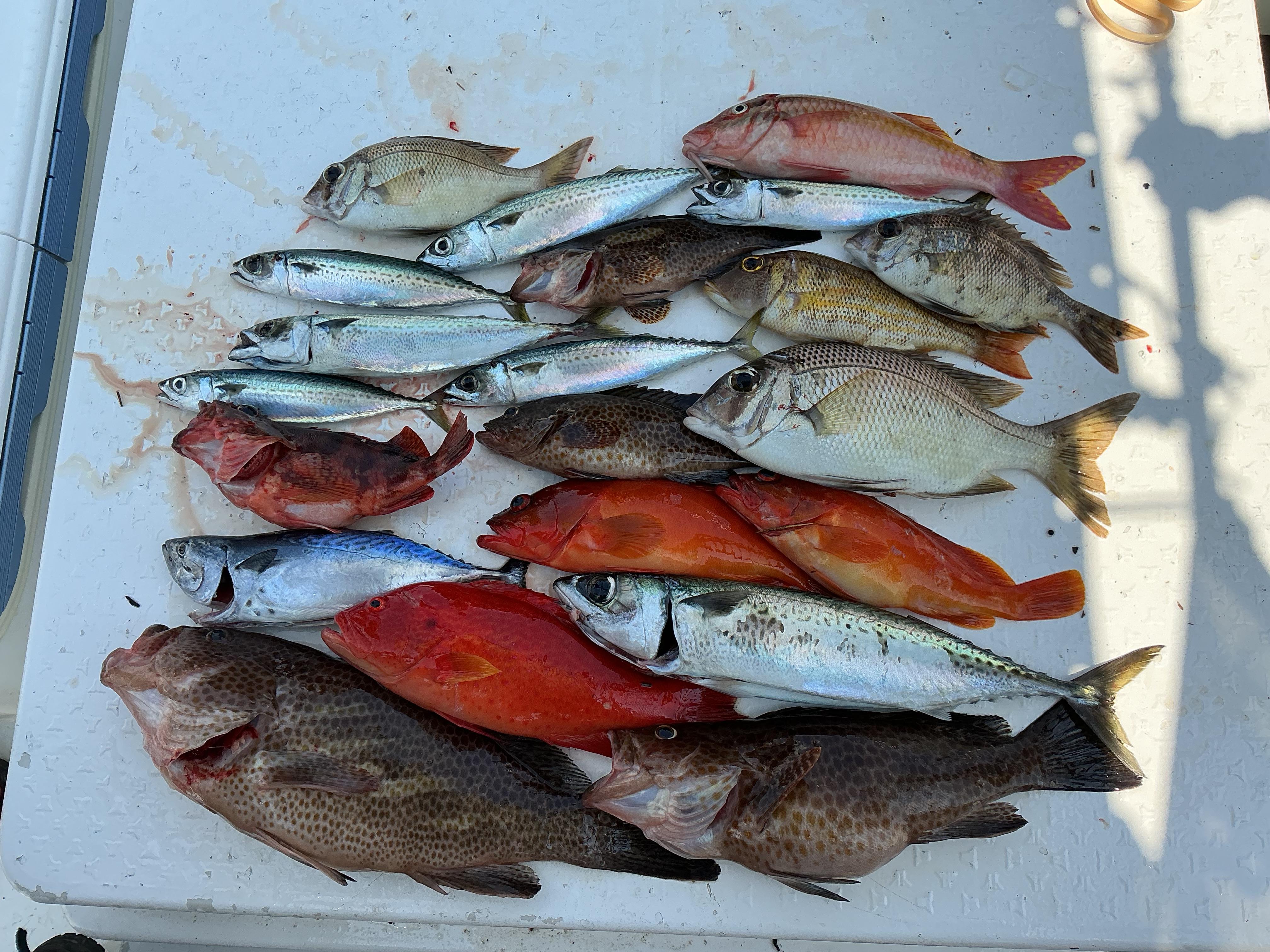 昨日も穏やかな海、午前ハーフで出船しました。オオモンハタ狙いで釣り開始。すると一投目からオオモンジュニア。その後も良型を含めて追加していきましたが、青物らしい当たり。最後に暴れ回ったのは40センチオーバーの丸々としたゴマサバ。次はジギングにヒット。重量感のあるいい引きで、ドラグ音を立てながらラインを引き出します。やり取りの末、上がってきたのは、またまた出ました50センチ程のオオモンハタ。居るところには居るもんだと感心しました。50センチ級は直近3枚のうち1枚はタイラバでしたが、2枚はジグに喰ってきています。その後はタイラバの上につけたサビキに小鯖が連発。ここで沖行きを選択。沖に向けた緩い潮が来ていましたが、ここでもアカハタやメイチダイ、オジロバラハタ、名前がわからない魚や初めて見る魚などが次々にヒット。一昨日と比べて当たりの多い釣行となりました。 ![]() |